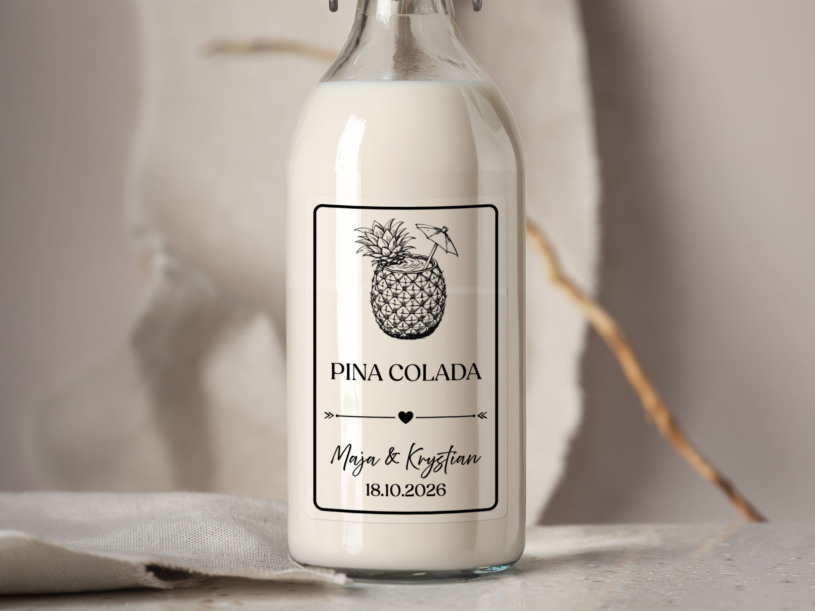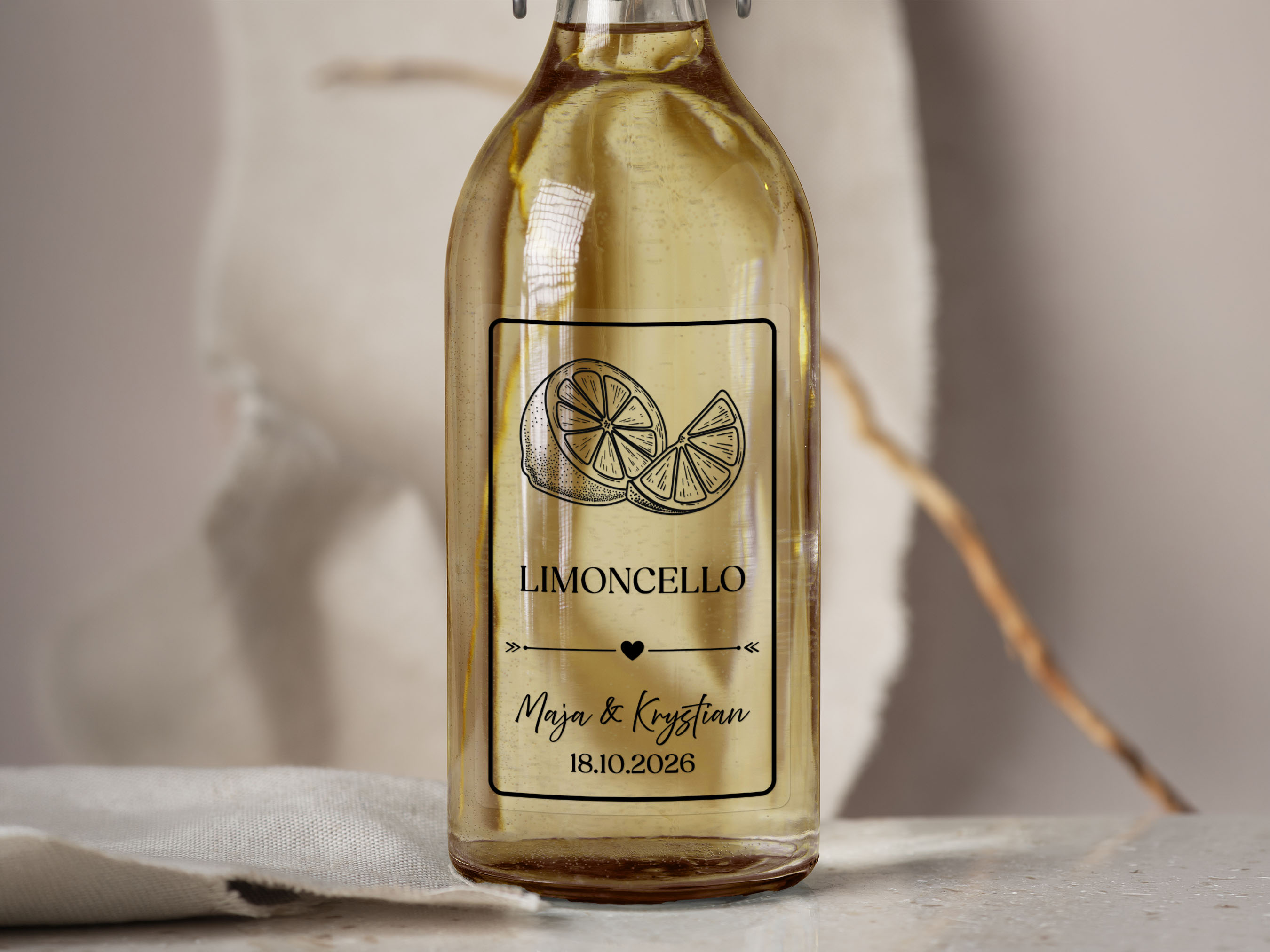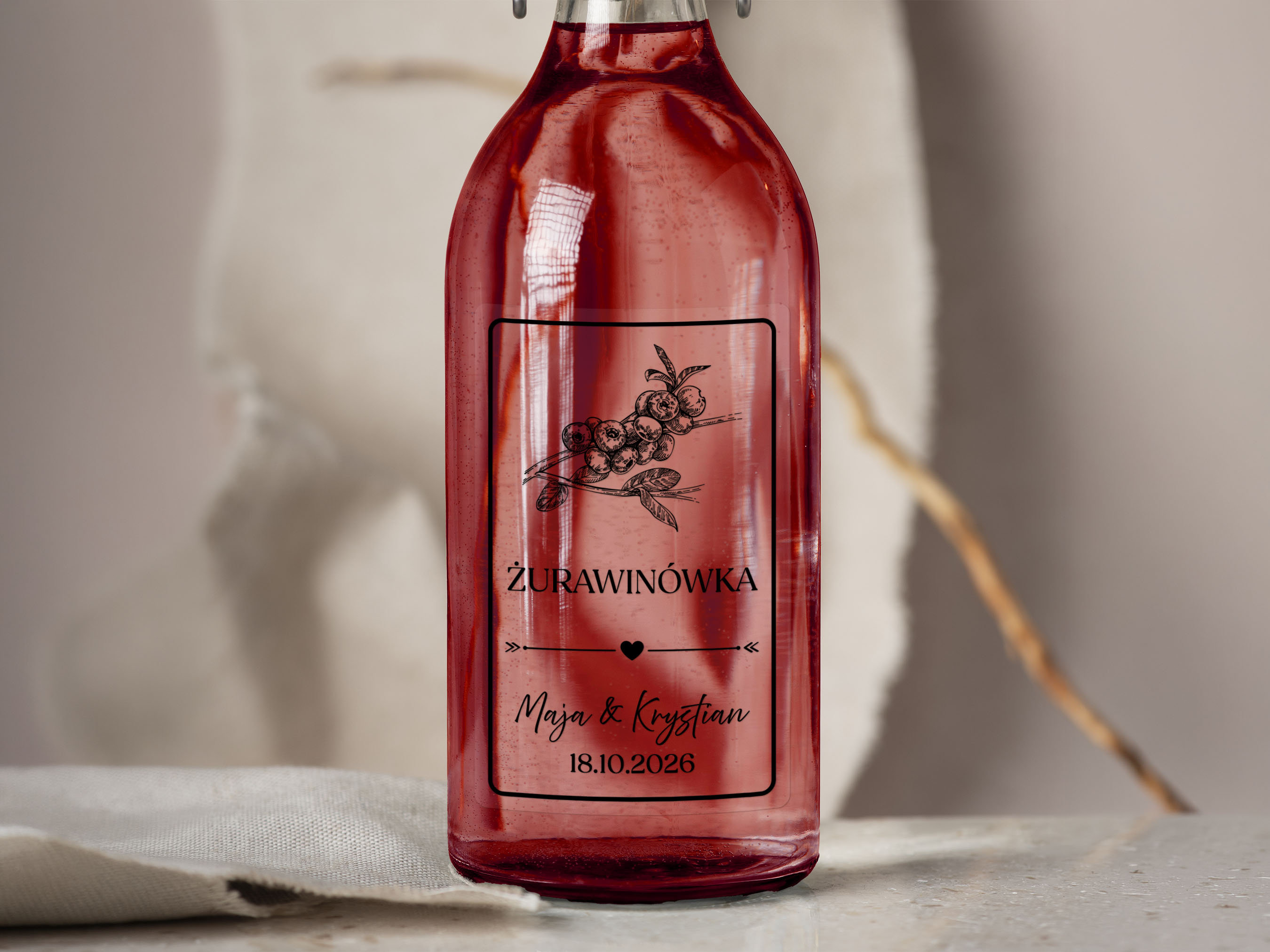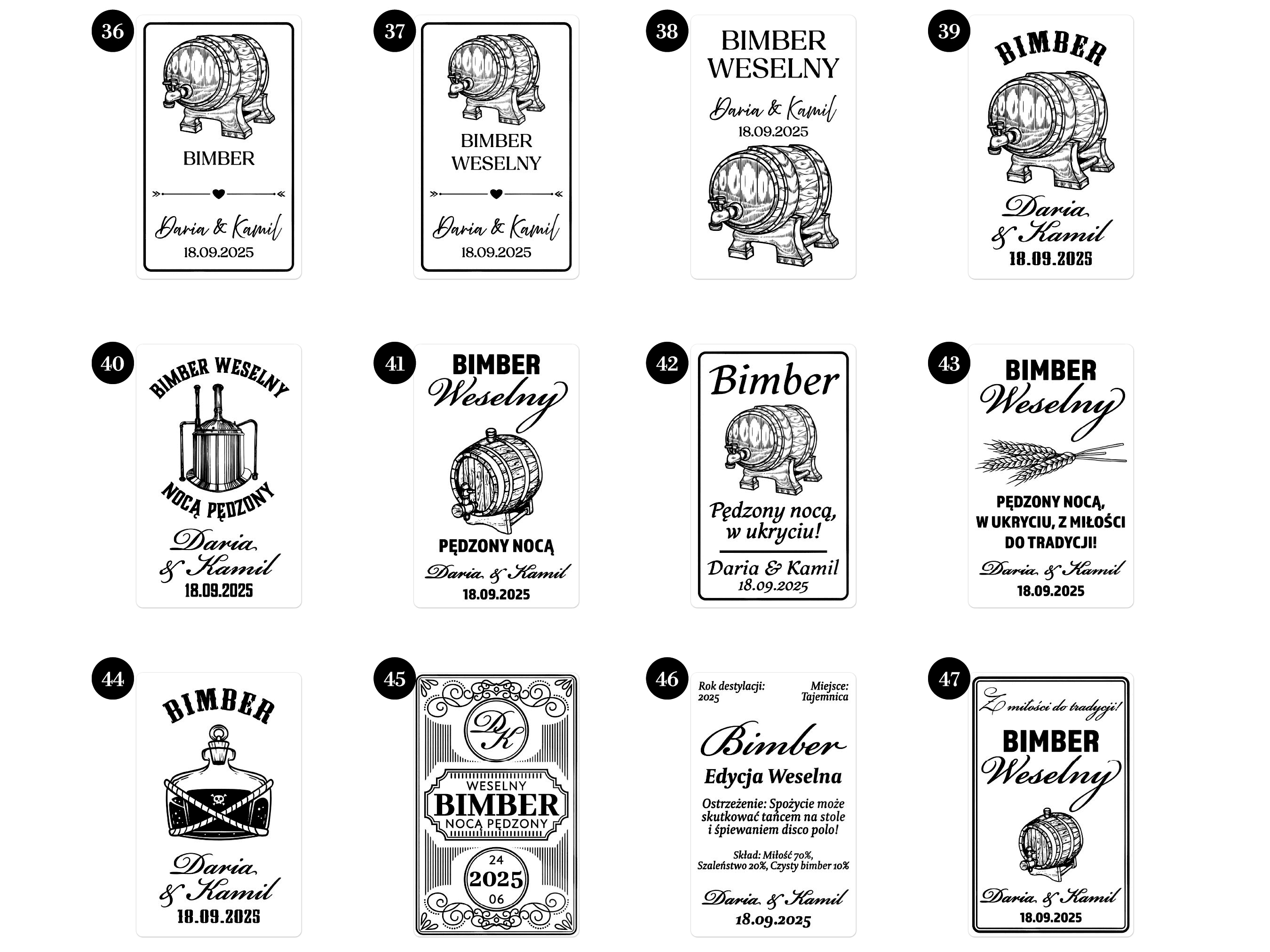 - Personalizacja: Dodaj imiona pary młodej, datę ślubu lub dowolny tekst, aby stworzyć niepowtarzalne naklejki na alkohol weselny.