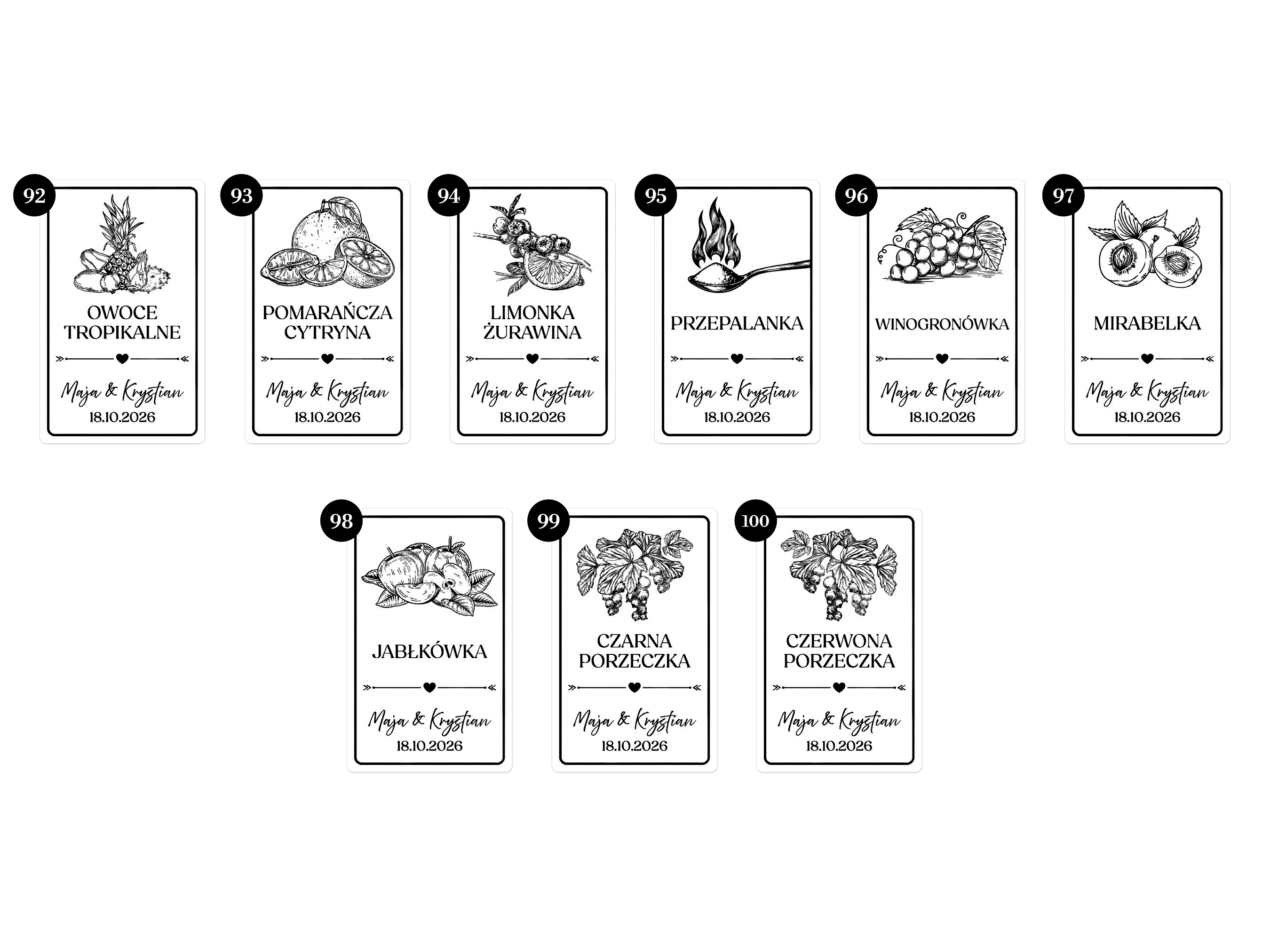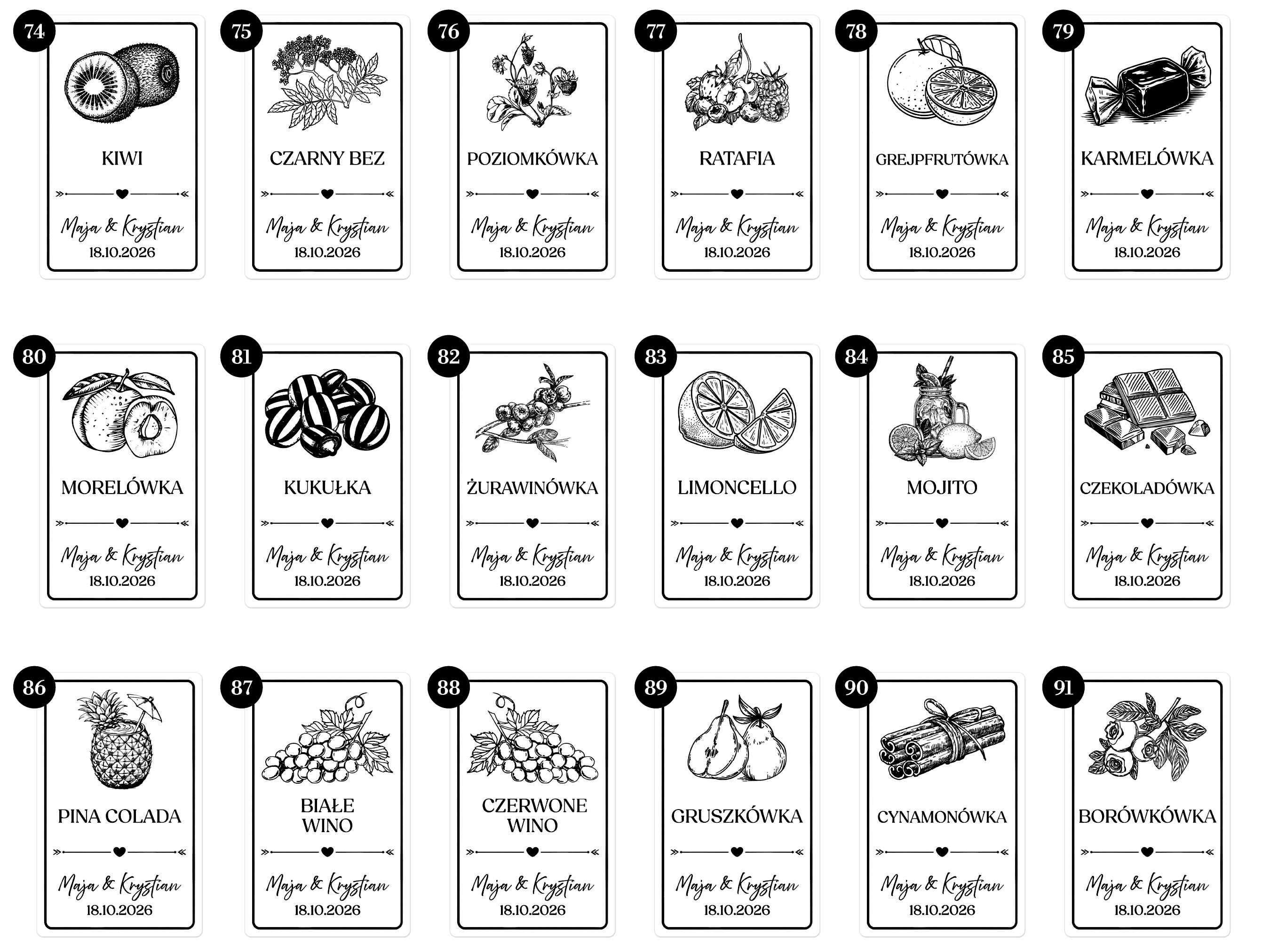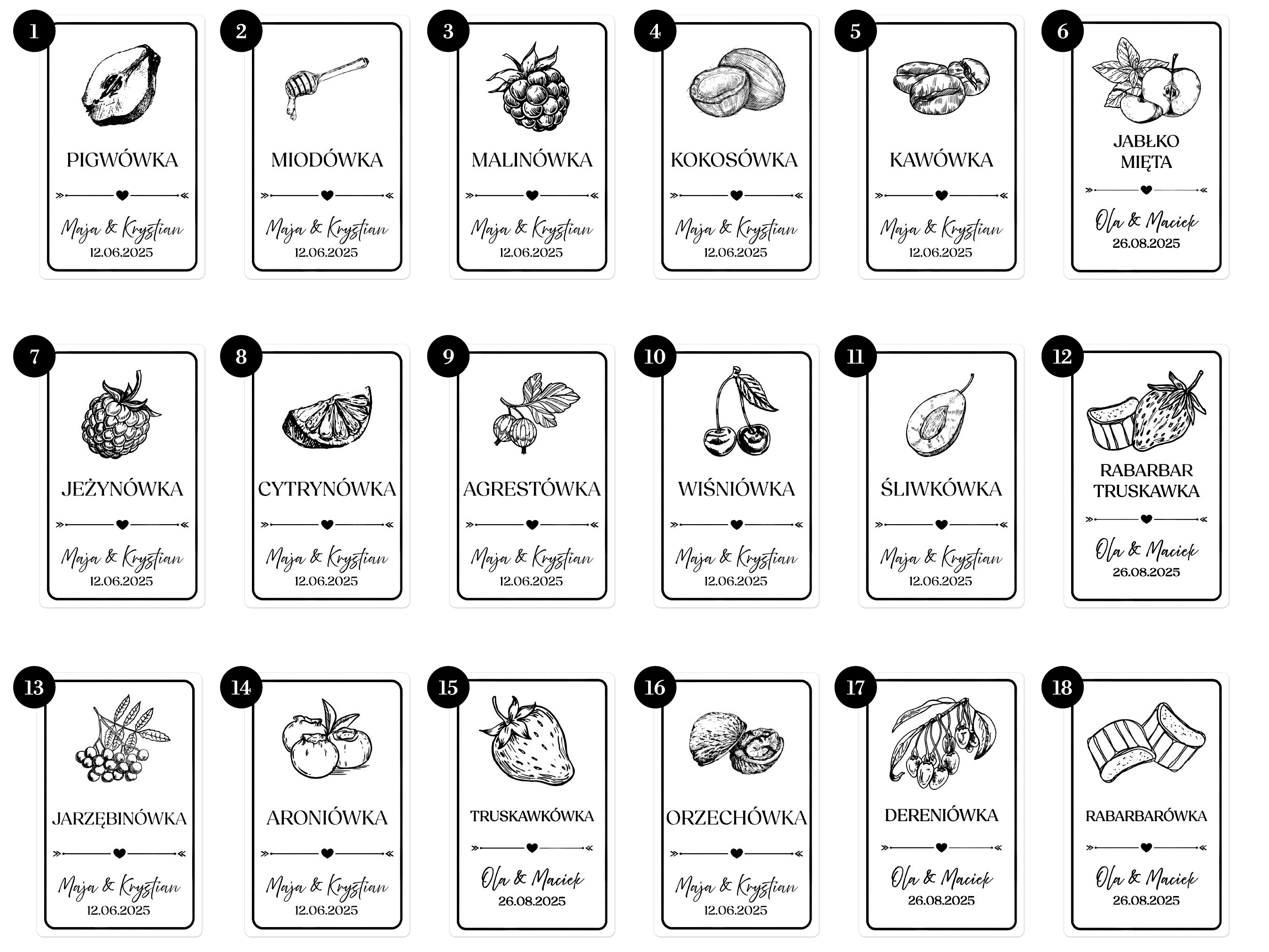 Np. 10 x cytrynówka, 20 x aroniówka, 20 x śliwkówka – wszystkie z tymi samymi imionami i datą.
