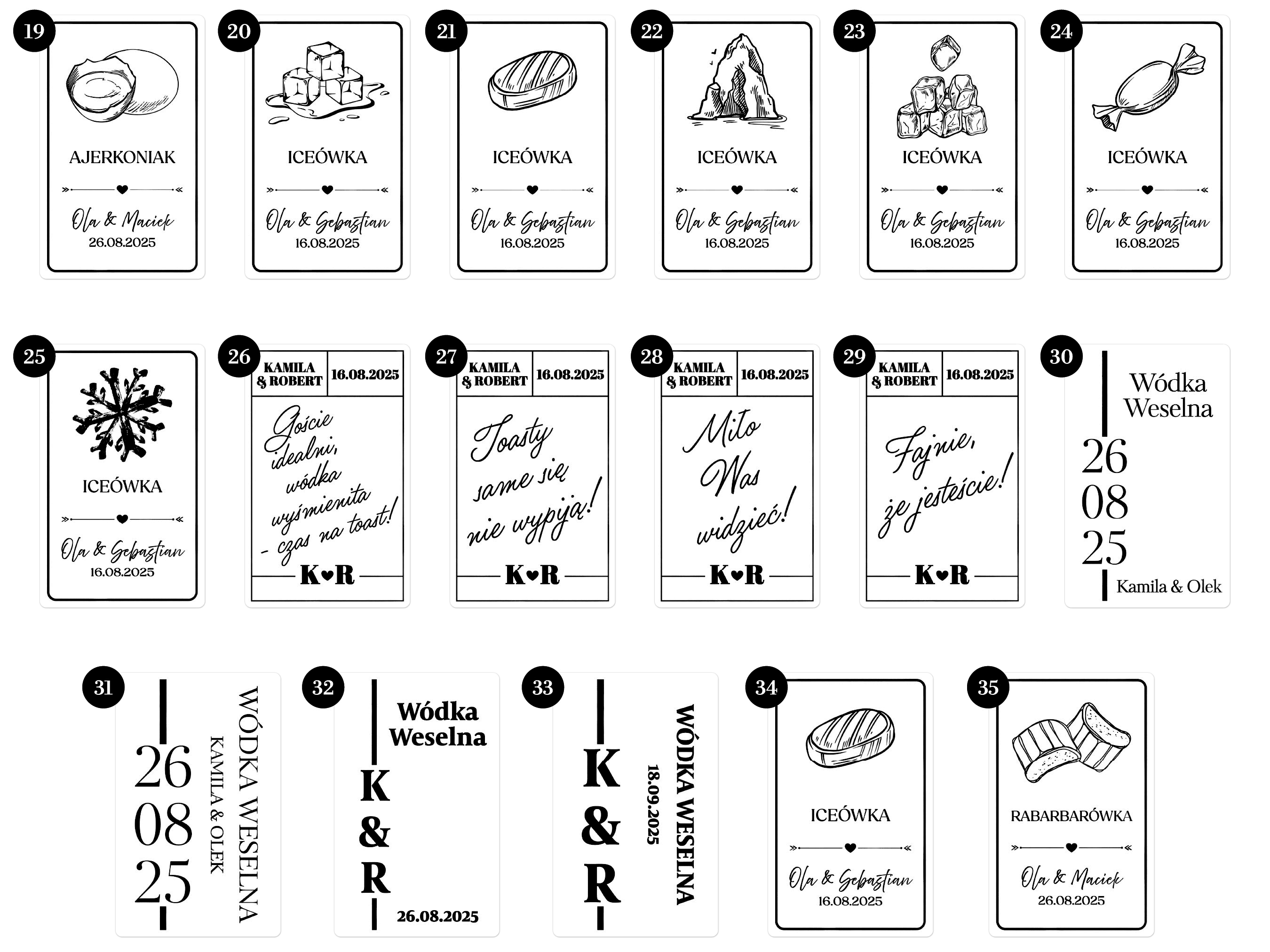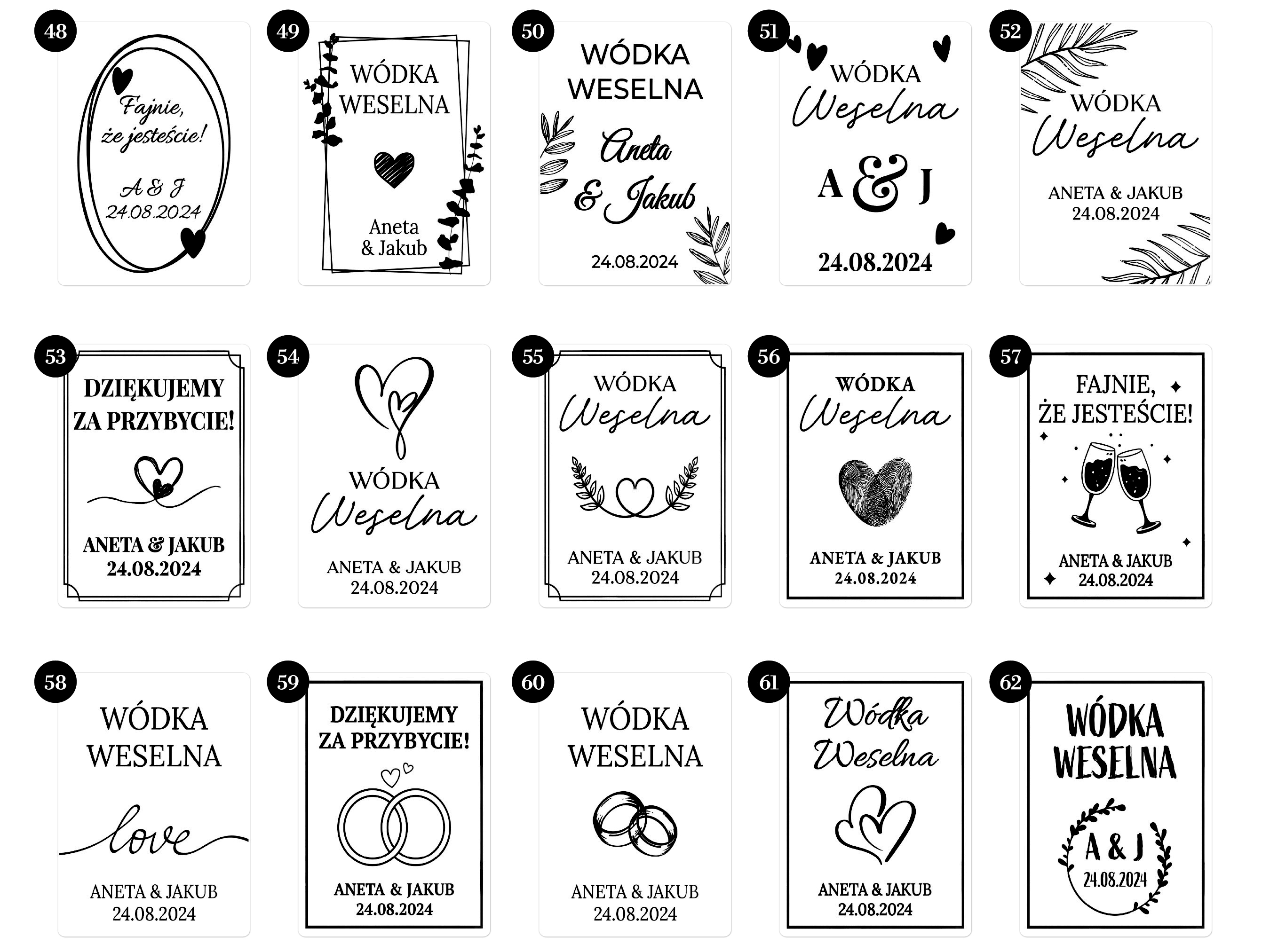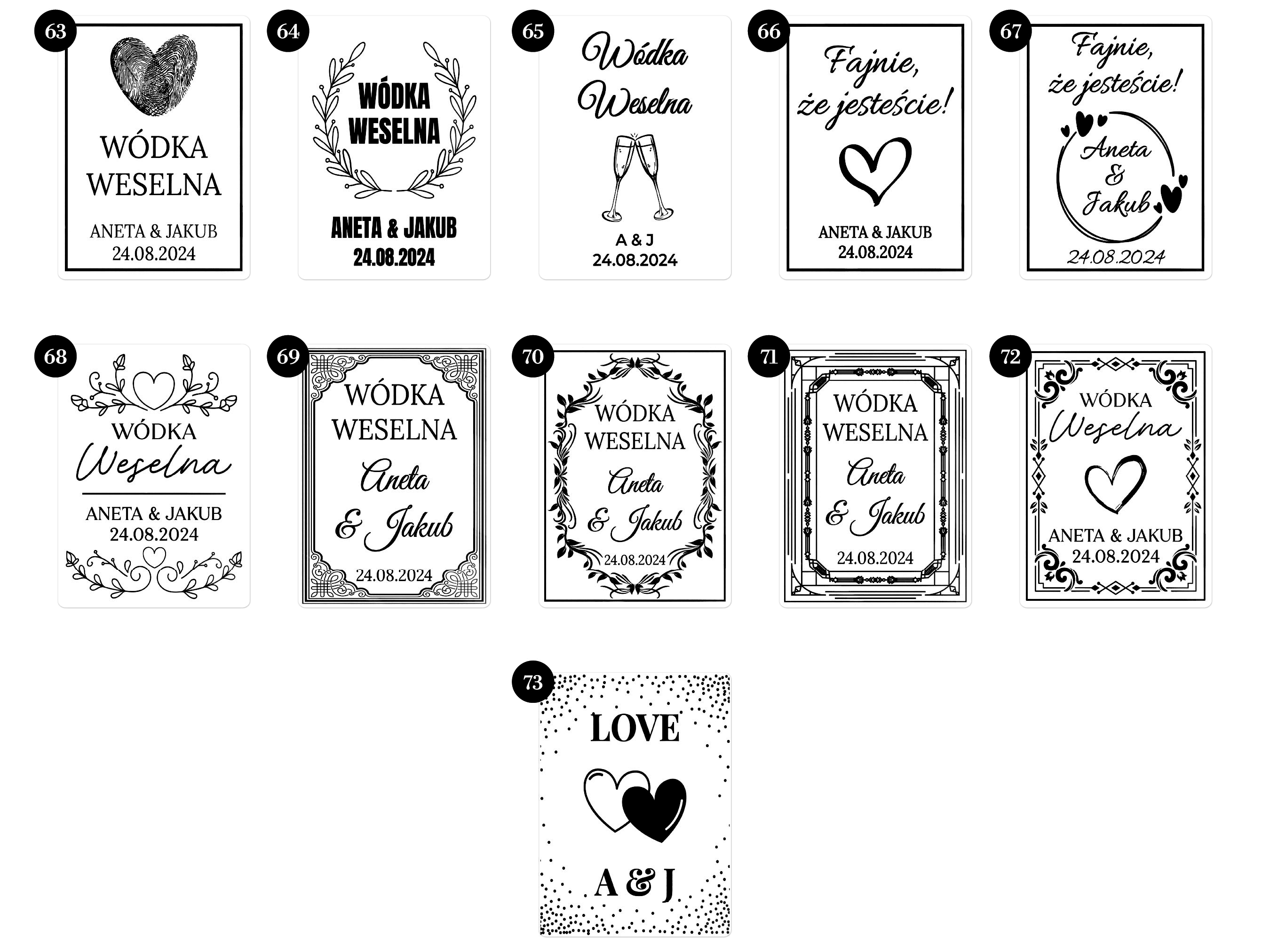 Etykiety Weselne, Etykiety na Nalewki i Bimber – zestaw od 50 szt. (min. 10 szt. na wzór) Czarny Nadruk, Różne Smaki