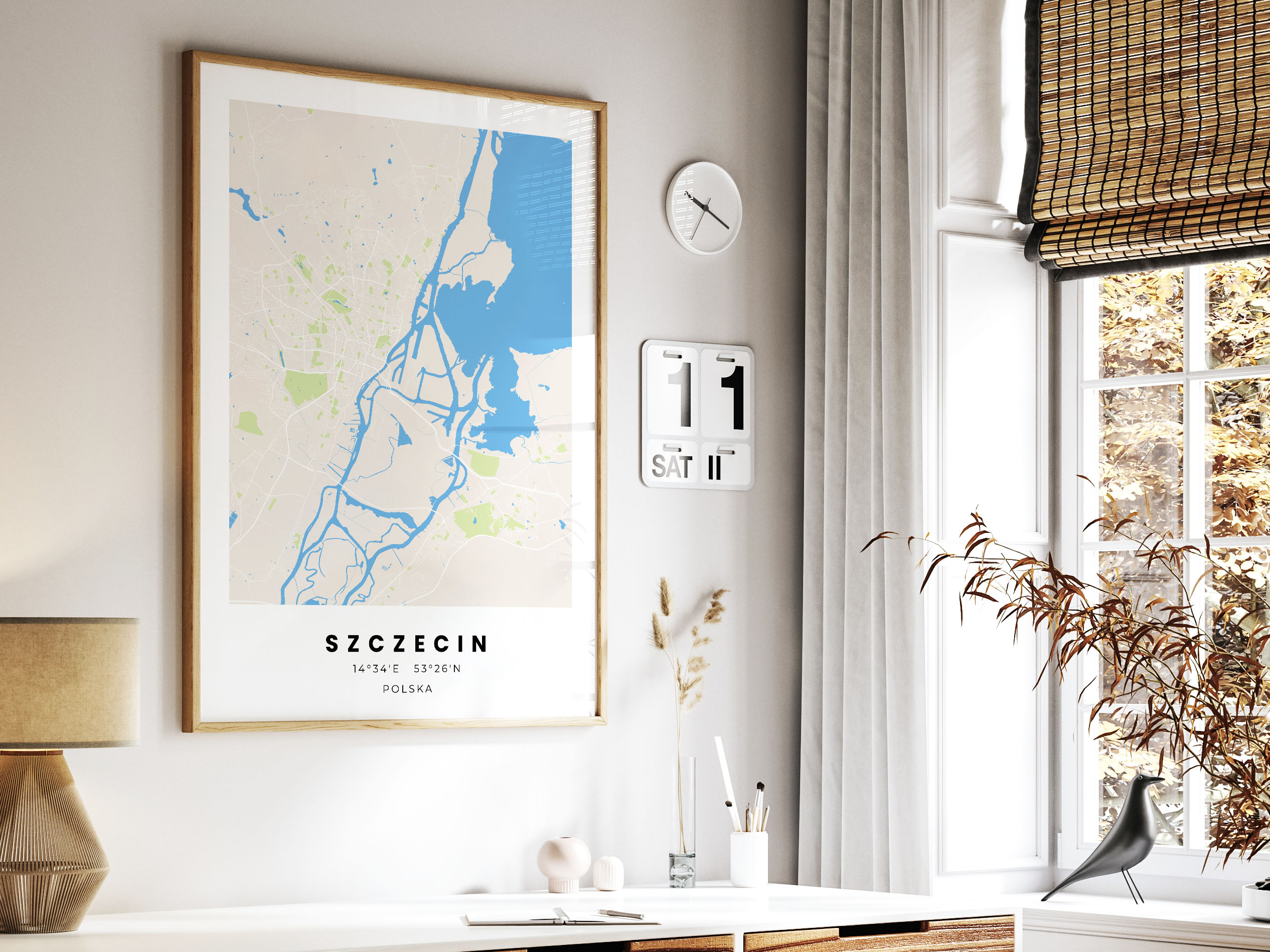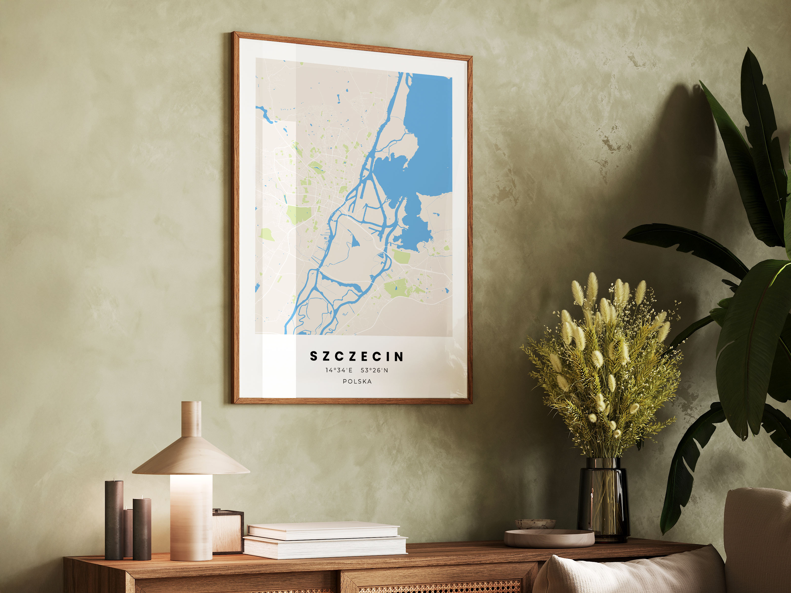 Minimalistyczny Plakat Mapa Szczecin – Nowoczesna Mapa w Skandynawskim Stylu
