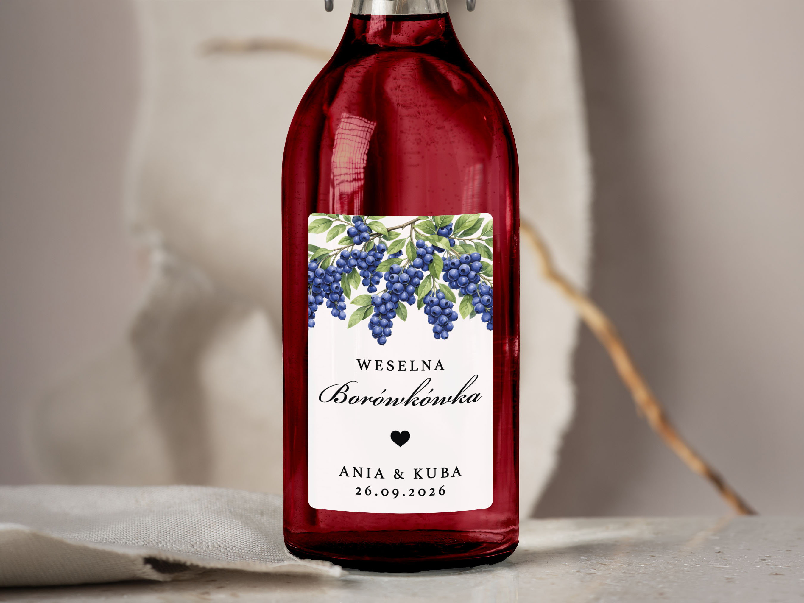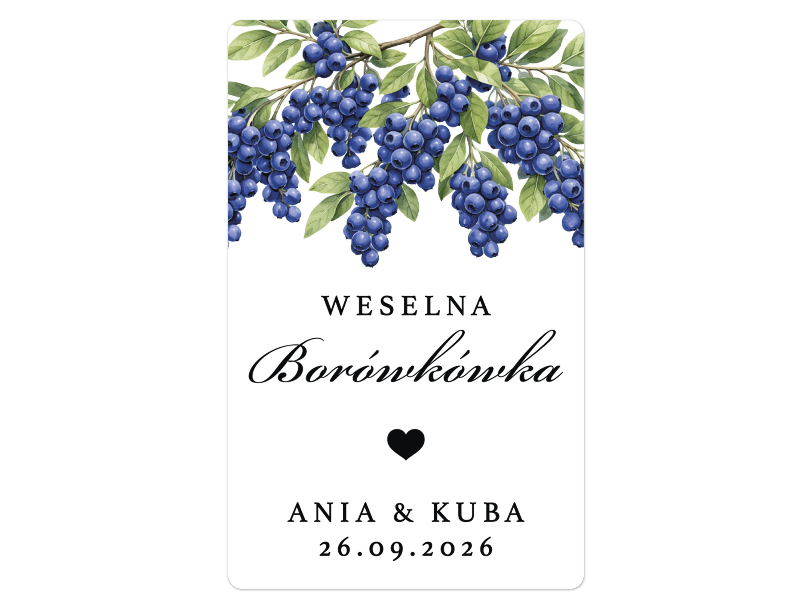 Naklejki na Borówkówkę, prostokątne etykiety Borówkówka weselna, personalizowane