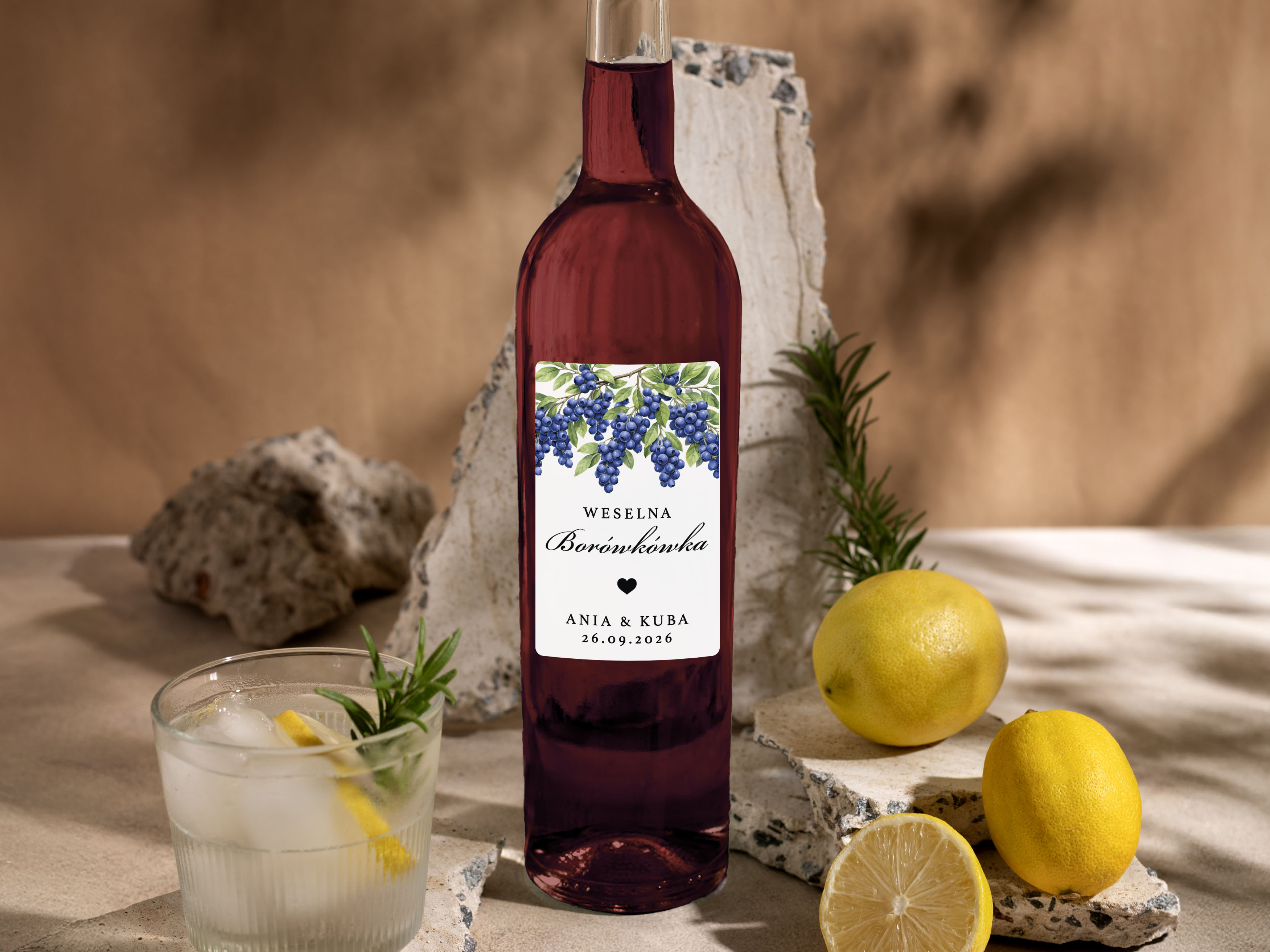 To propozycja dla osób, które chcą zadbać o spójne detale podczas wesela, poprawin lub innej uroczystości. Naklejki można dopasować do własnej koncepcji, dodając imiona, datę oraz nazwę trunku lub inny wybrany tekst.