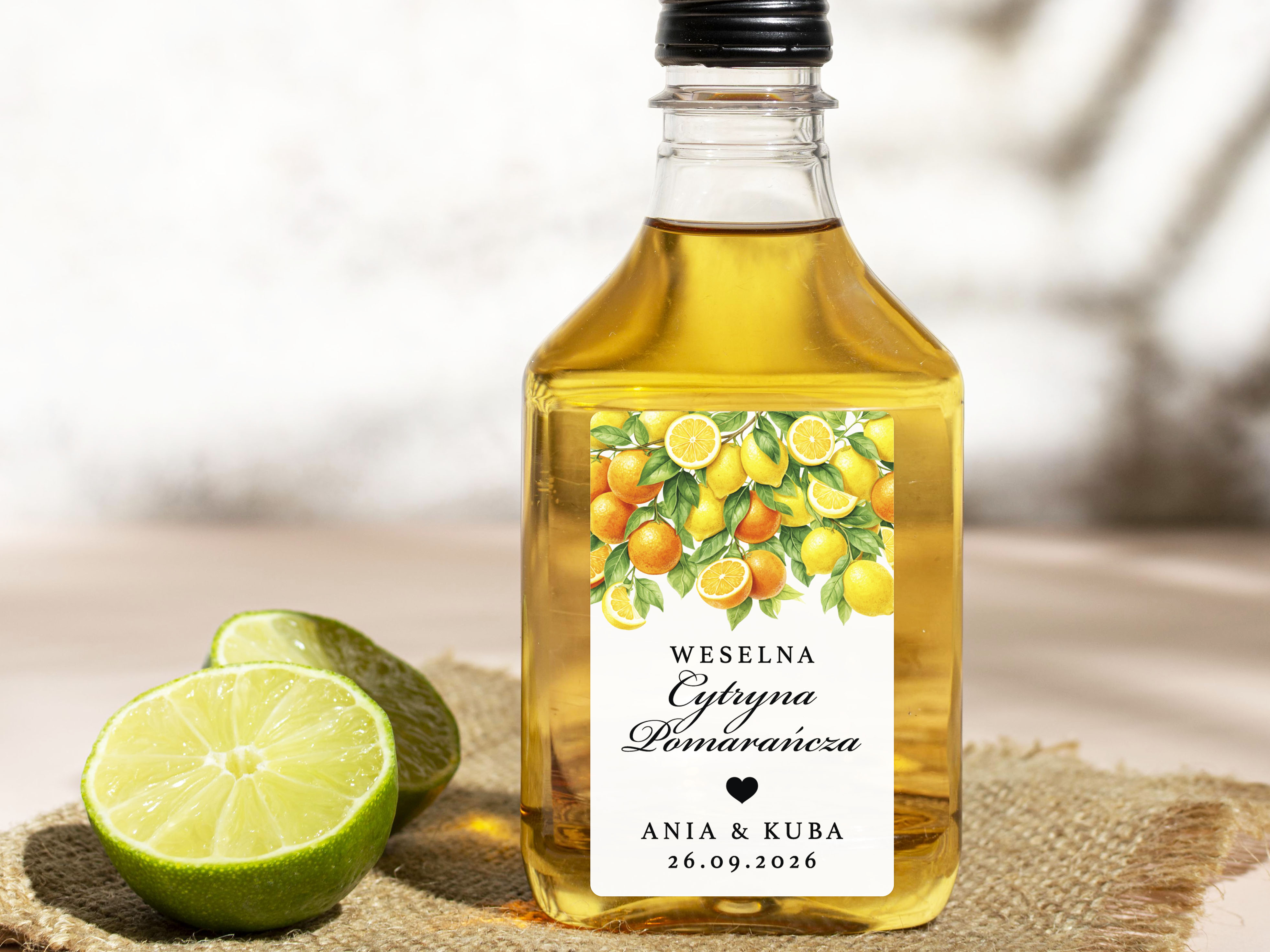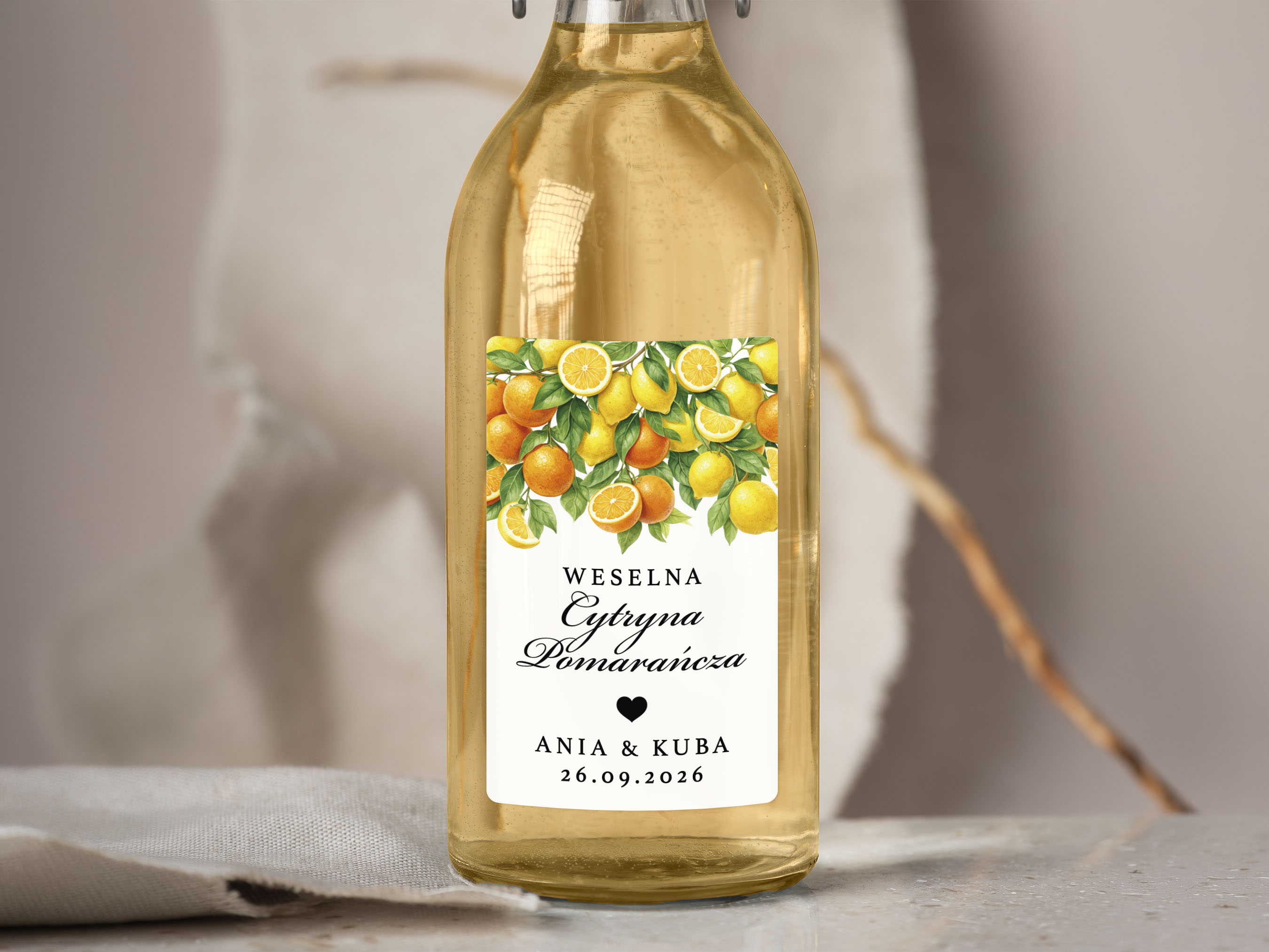 Naklejki na Cytrynę Pomarańczę, prostokątne etykiety Cytryna Pomarańcza weselne, personalizowane
