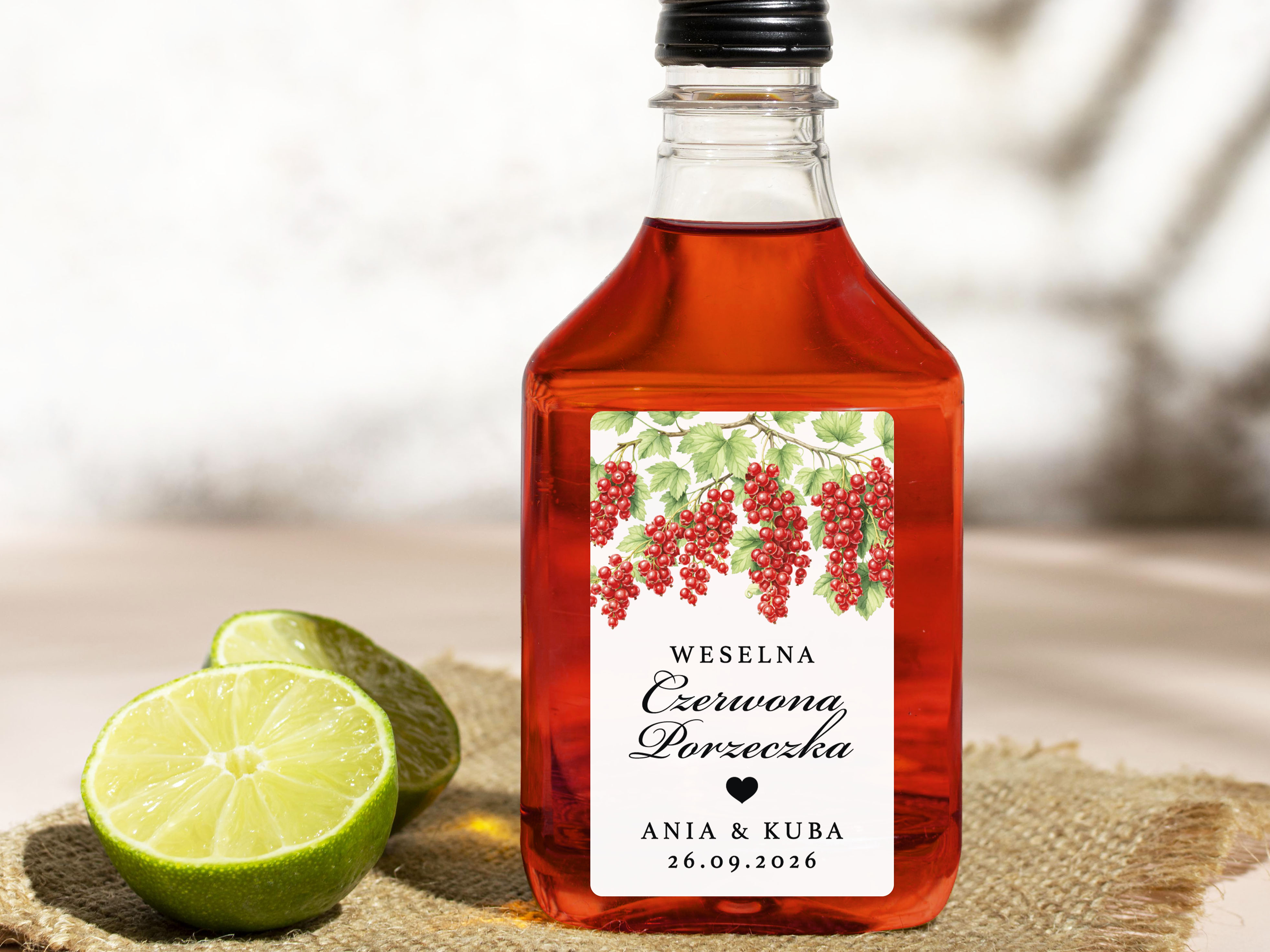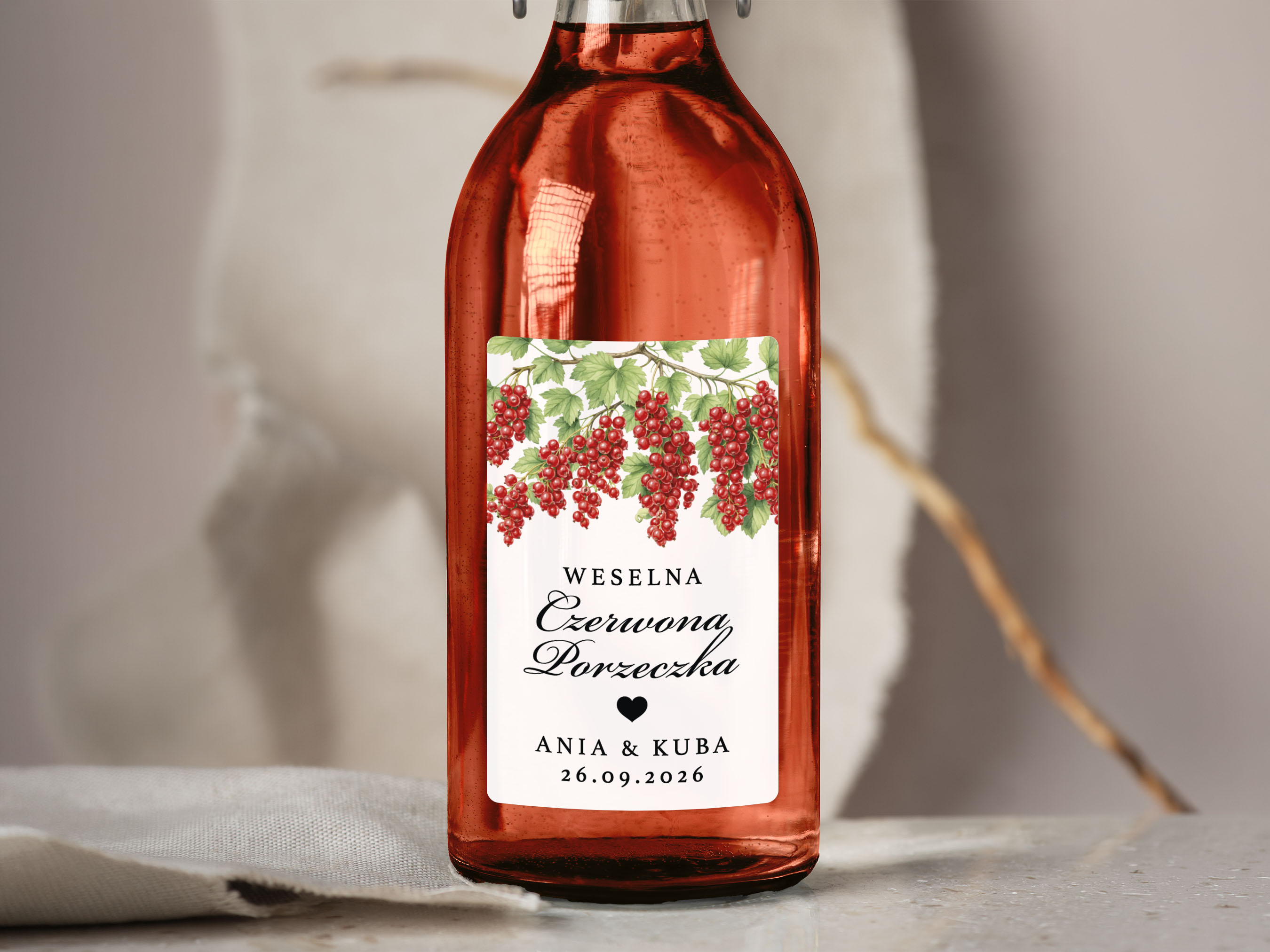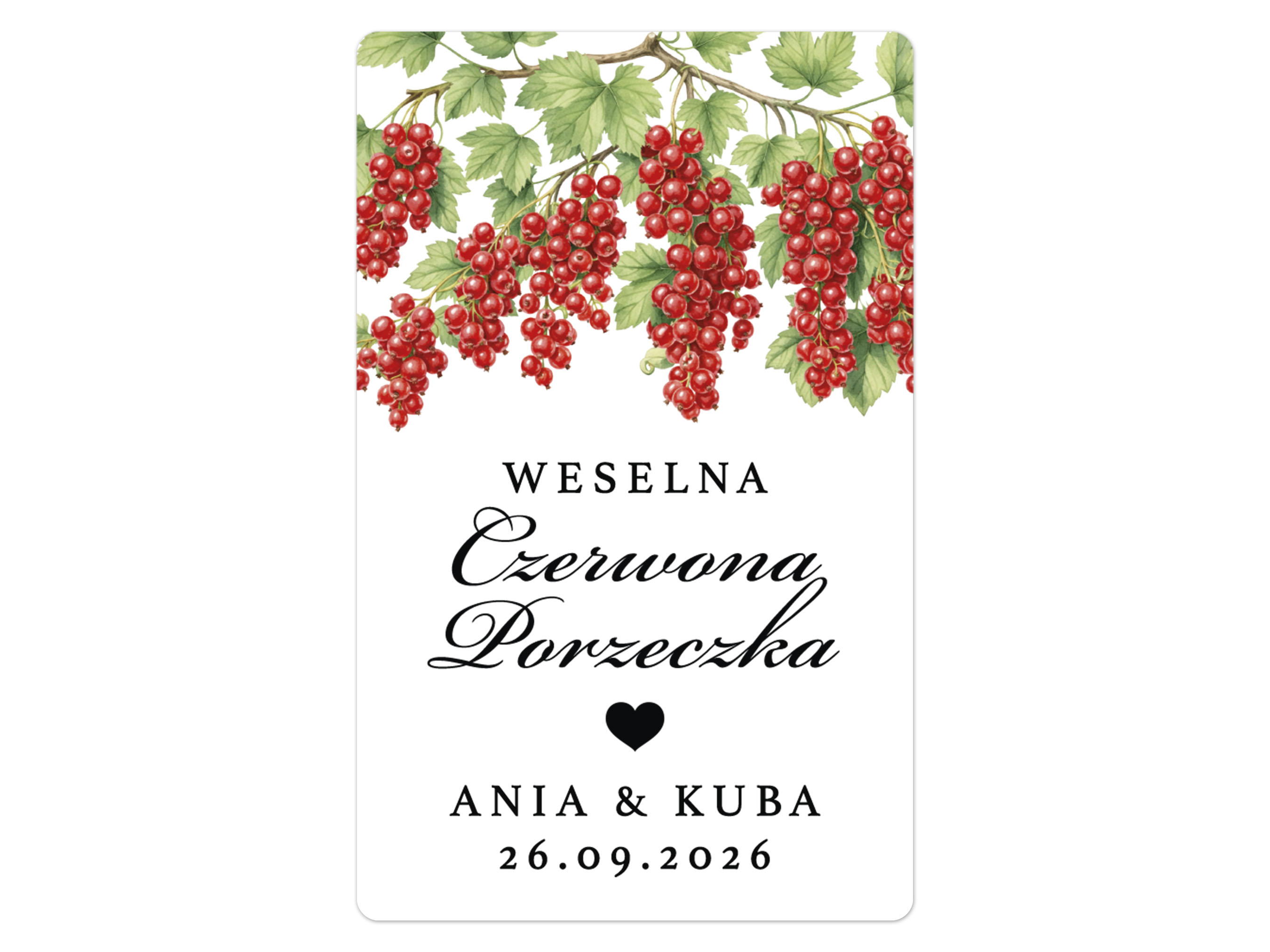 Naklejki na Czerwoną Porzeczkę, prostokątne etykiety Czerwona Porzeczka weselna, personalizowane