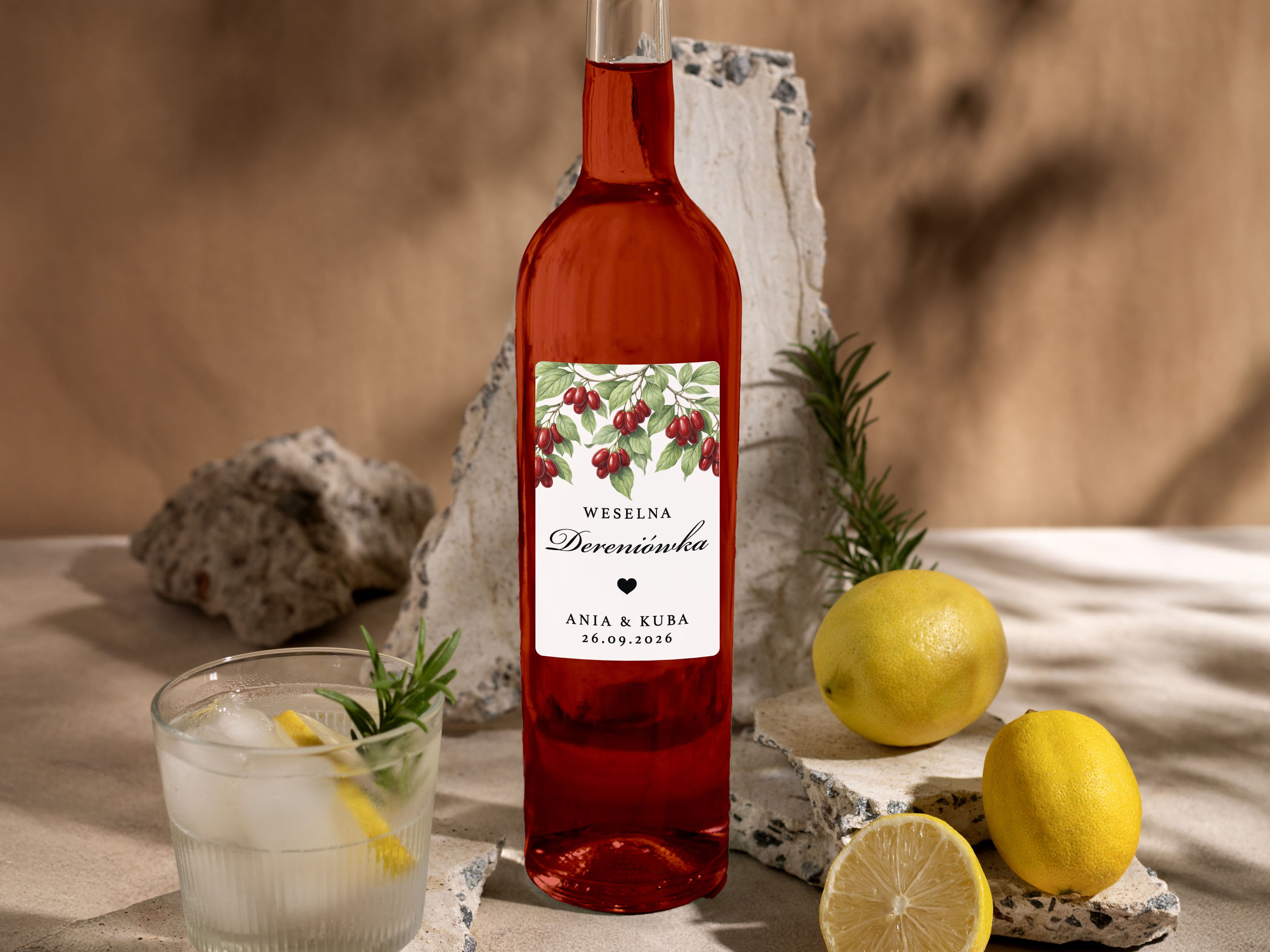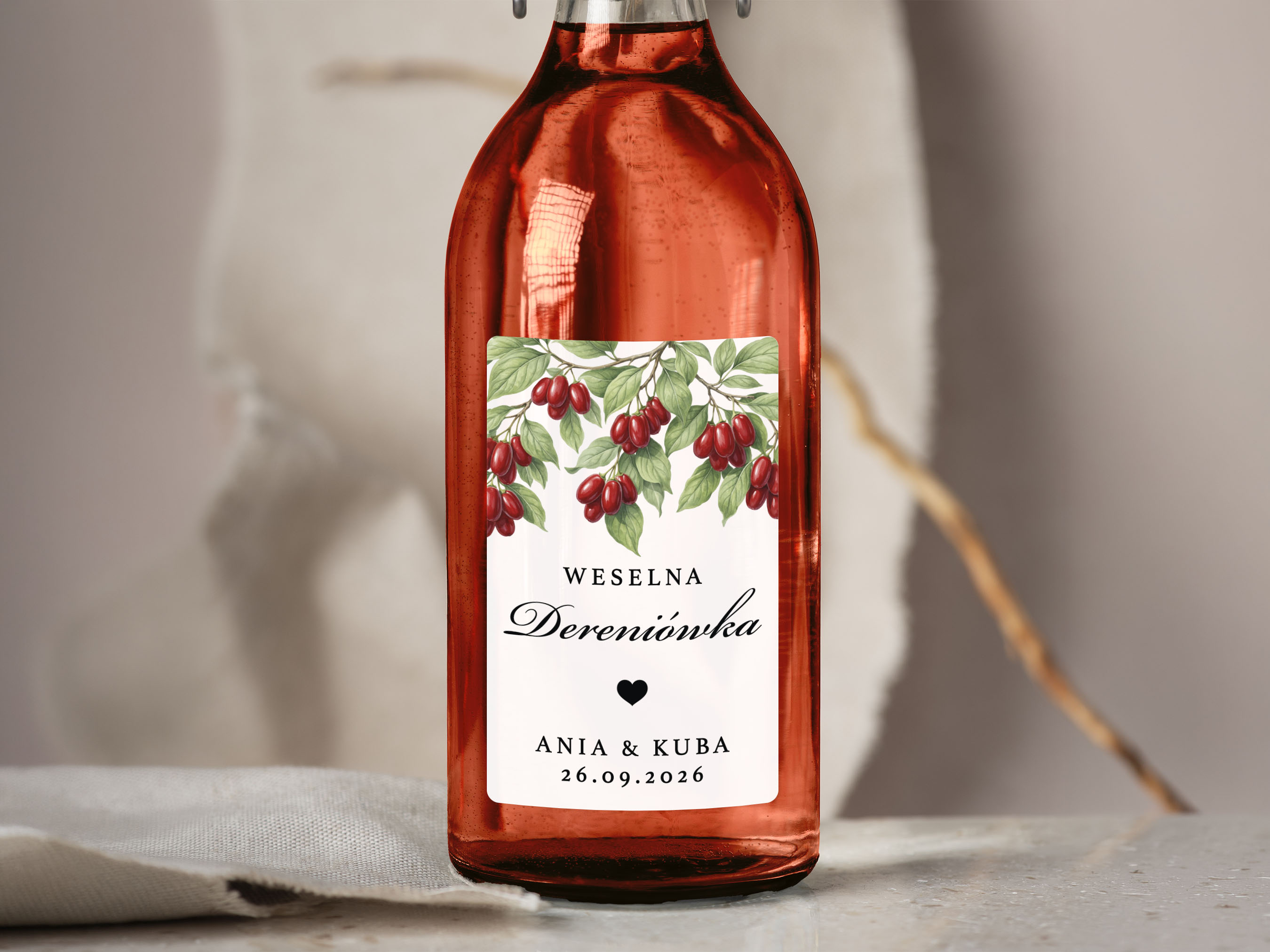 Naklejki na Dereniówkę, prostokątne etykiety Dereniówka weselna, personalizowane