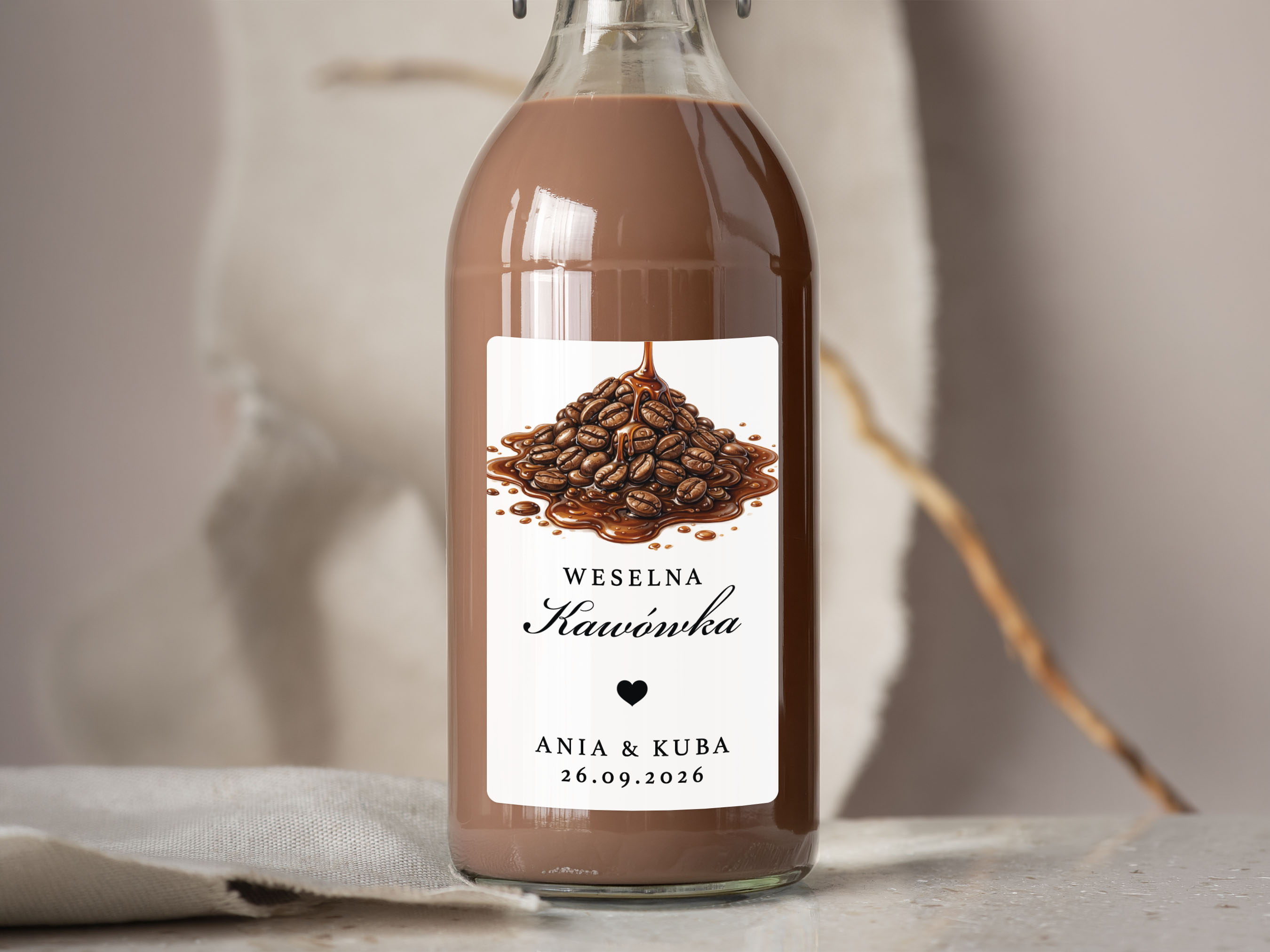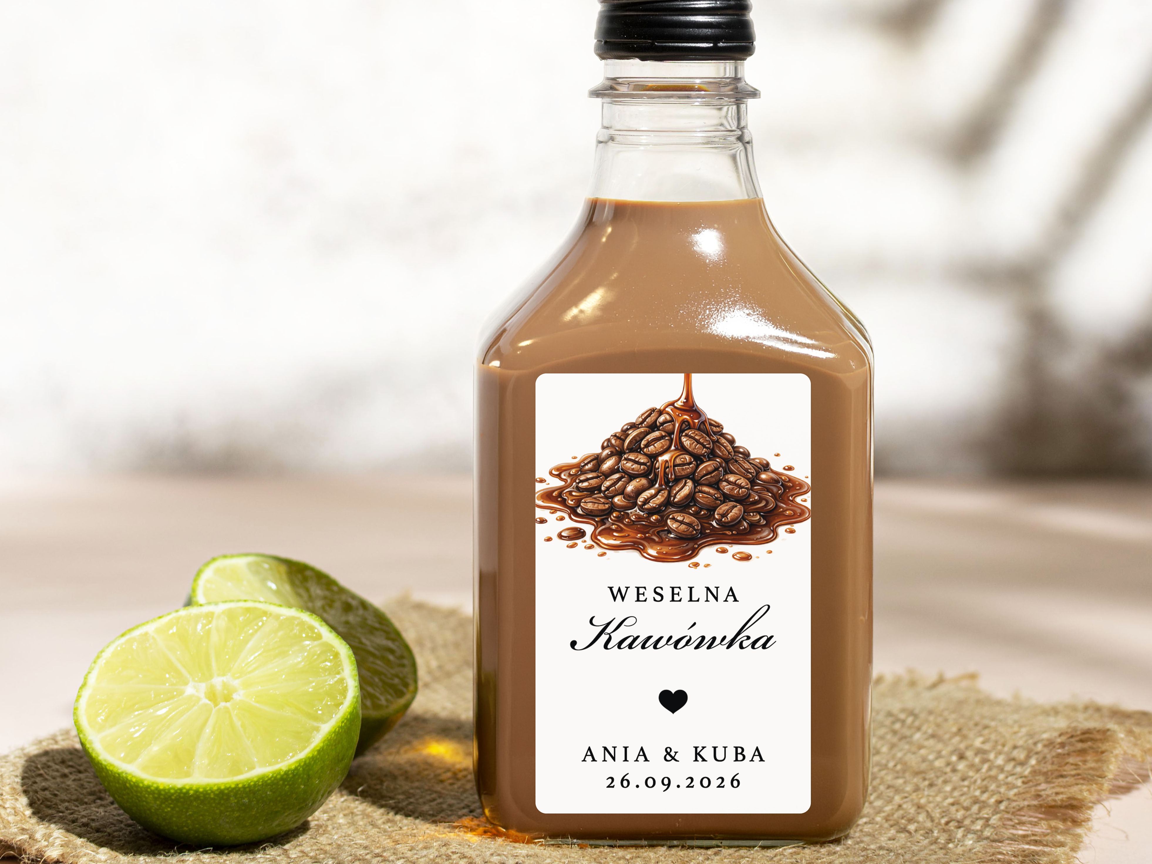 To propozycja dla osób, które chcą zadbać o spójne detale podczas wesela, poprawin lub innej uroczystości. Naklejki można dopasować do własnej koncepcji, dodając imiona, datę oraz nazwę trunku lub inny wybrany tekst.
