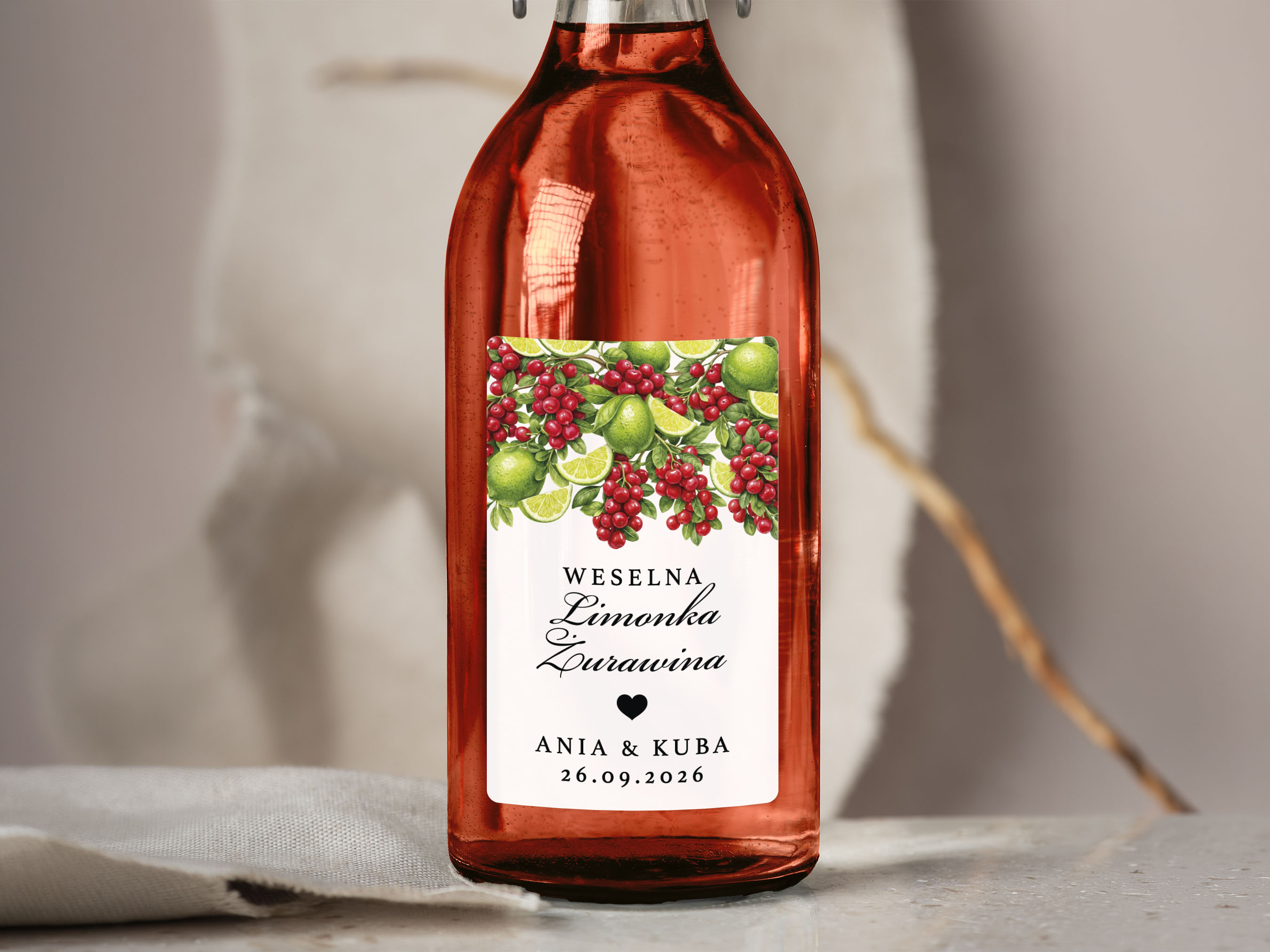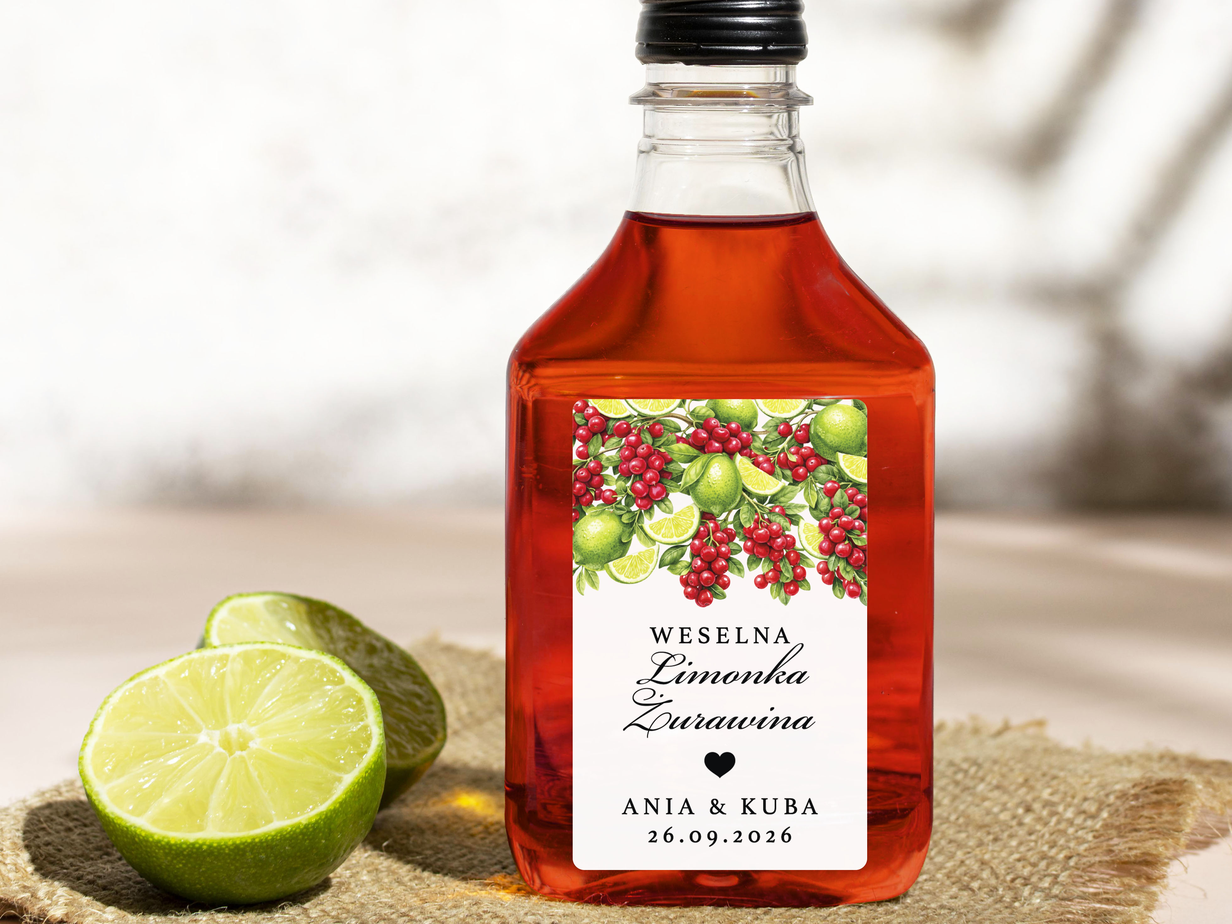 Naklejki na Limonkę Żurawinę, prostokątne etykiety Limonka Żurawina weselne, personalizowane