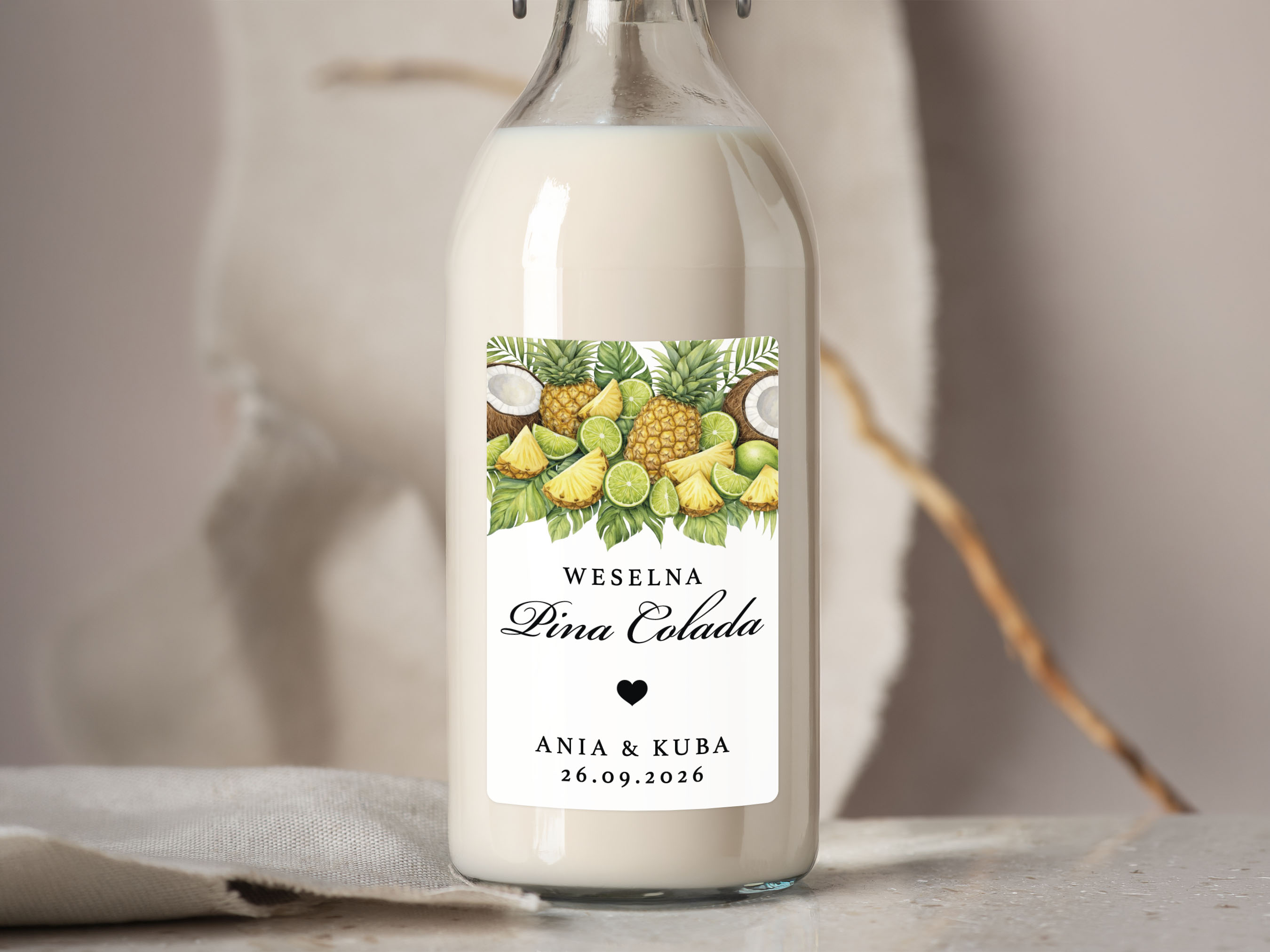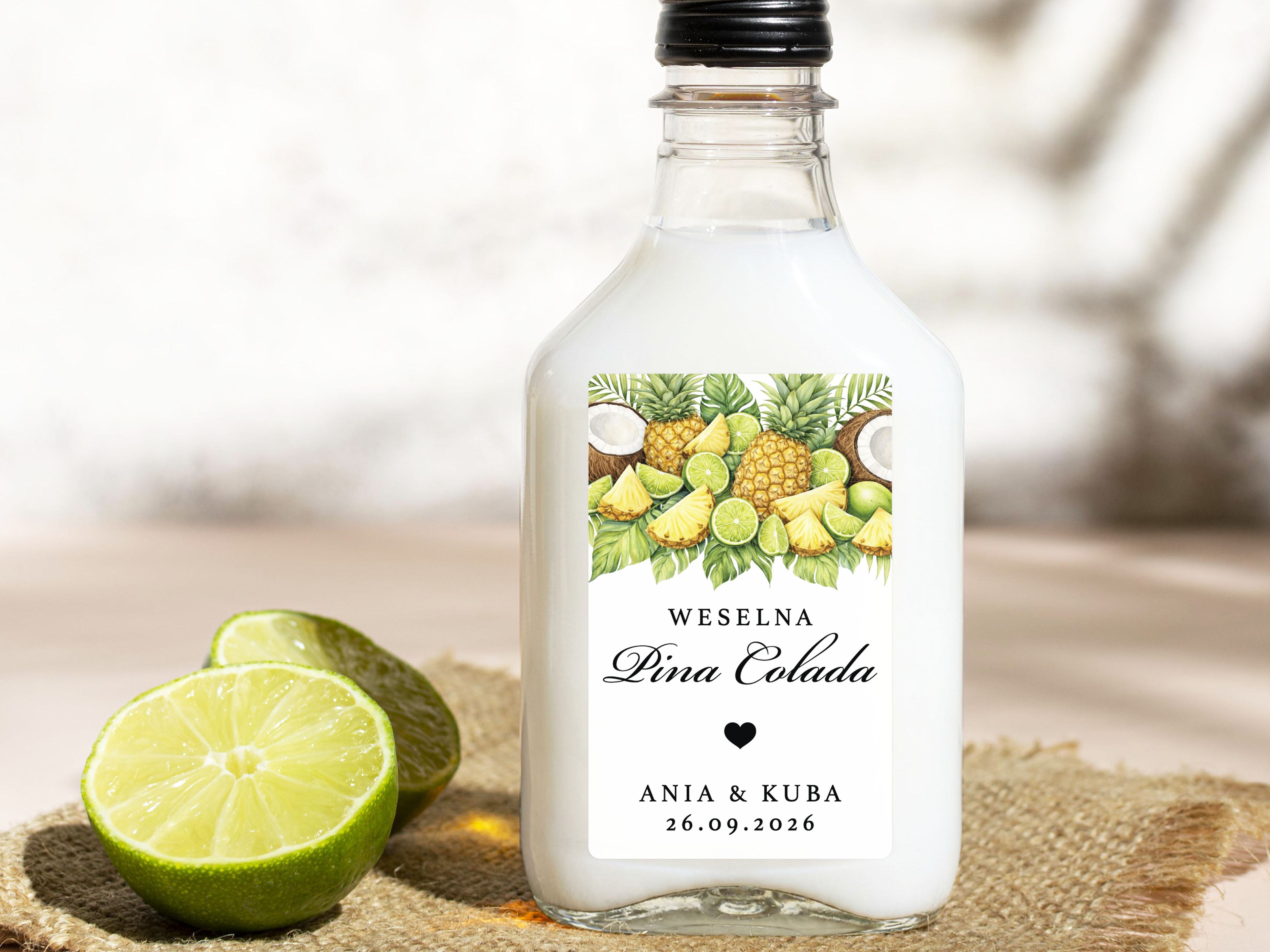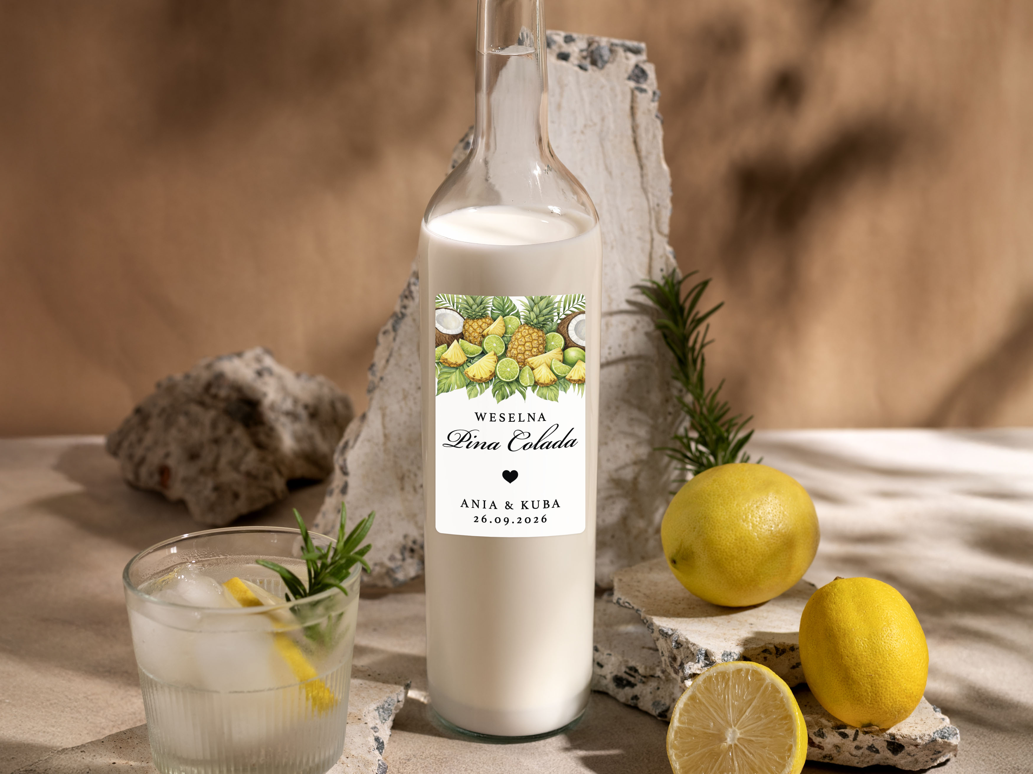 Naklejki na Pina Coladę, prostokątne etykiety Pina Colada weselne, personalizowane