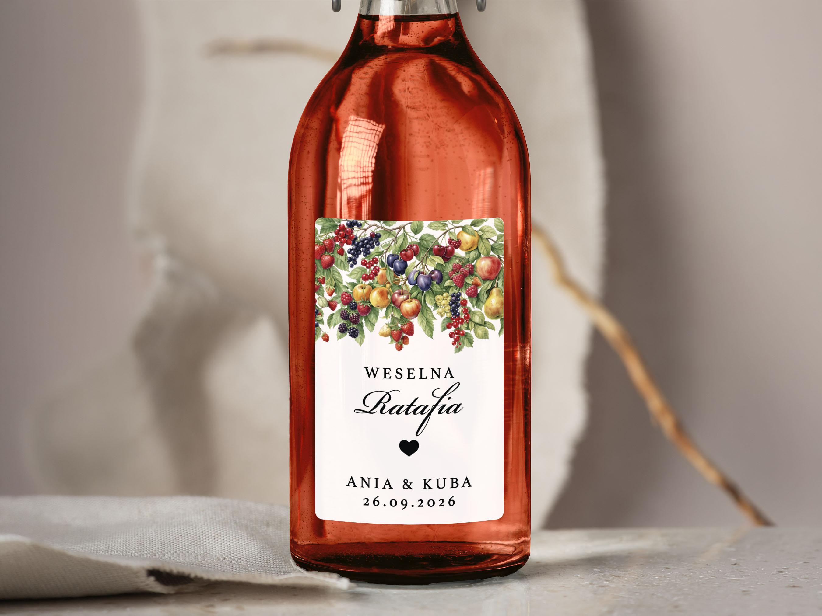 To propozycja dla osób, które chcą zadbać o spójne detale podczas wesela, poprawin lub innej uroczystości. Naklejki można dopasować do własnej koncepcji, dodając imiona, datę oraz nazwę trunku lub inny wybrany tekst.