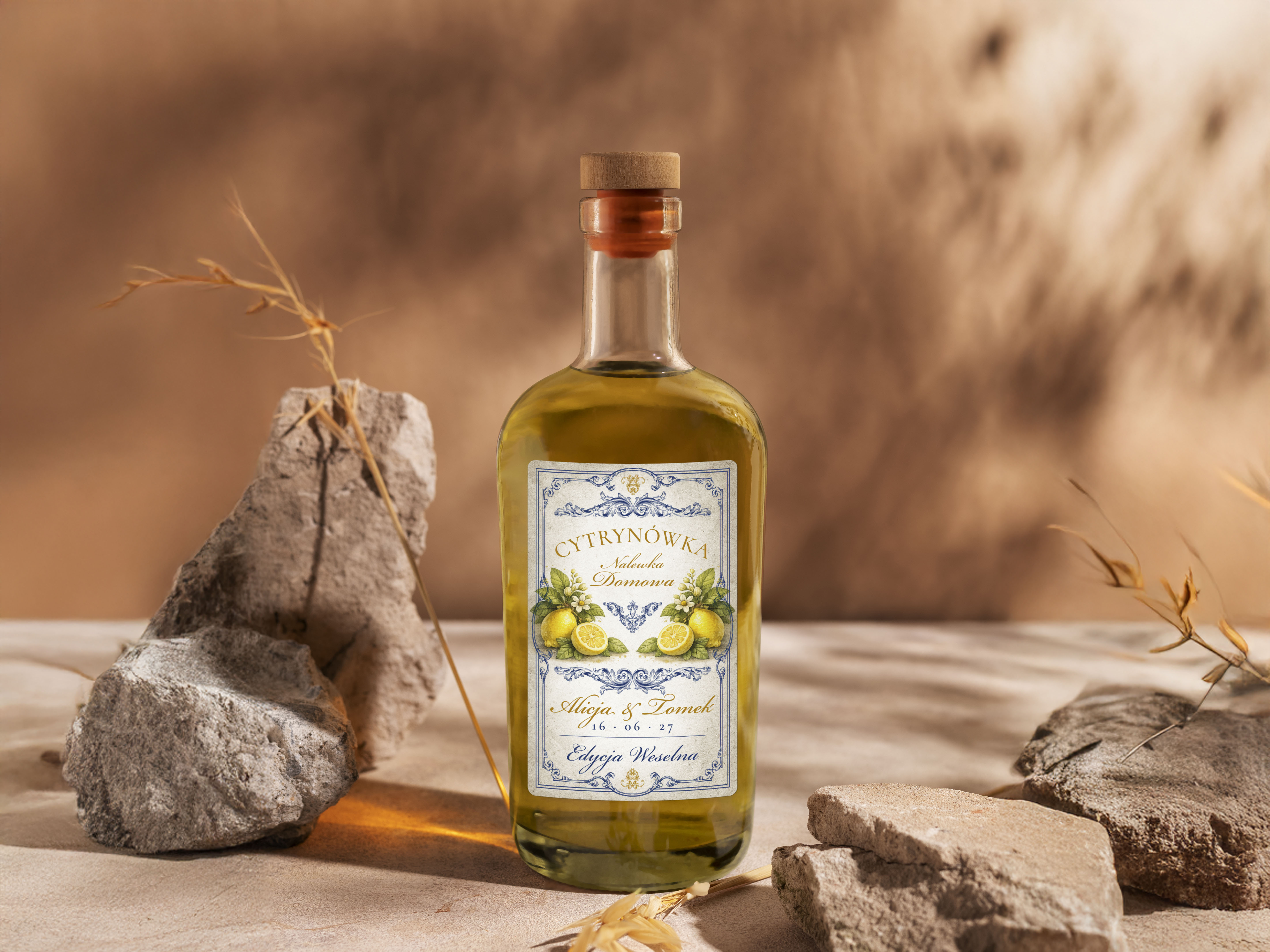 Naklejki na alkohol na wesele Cytrynówka, naklejki na Cytrynówkę, personalizowane etykiety vintage z imionami i datą, Cytrynówka