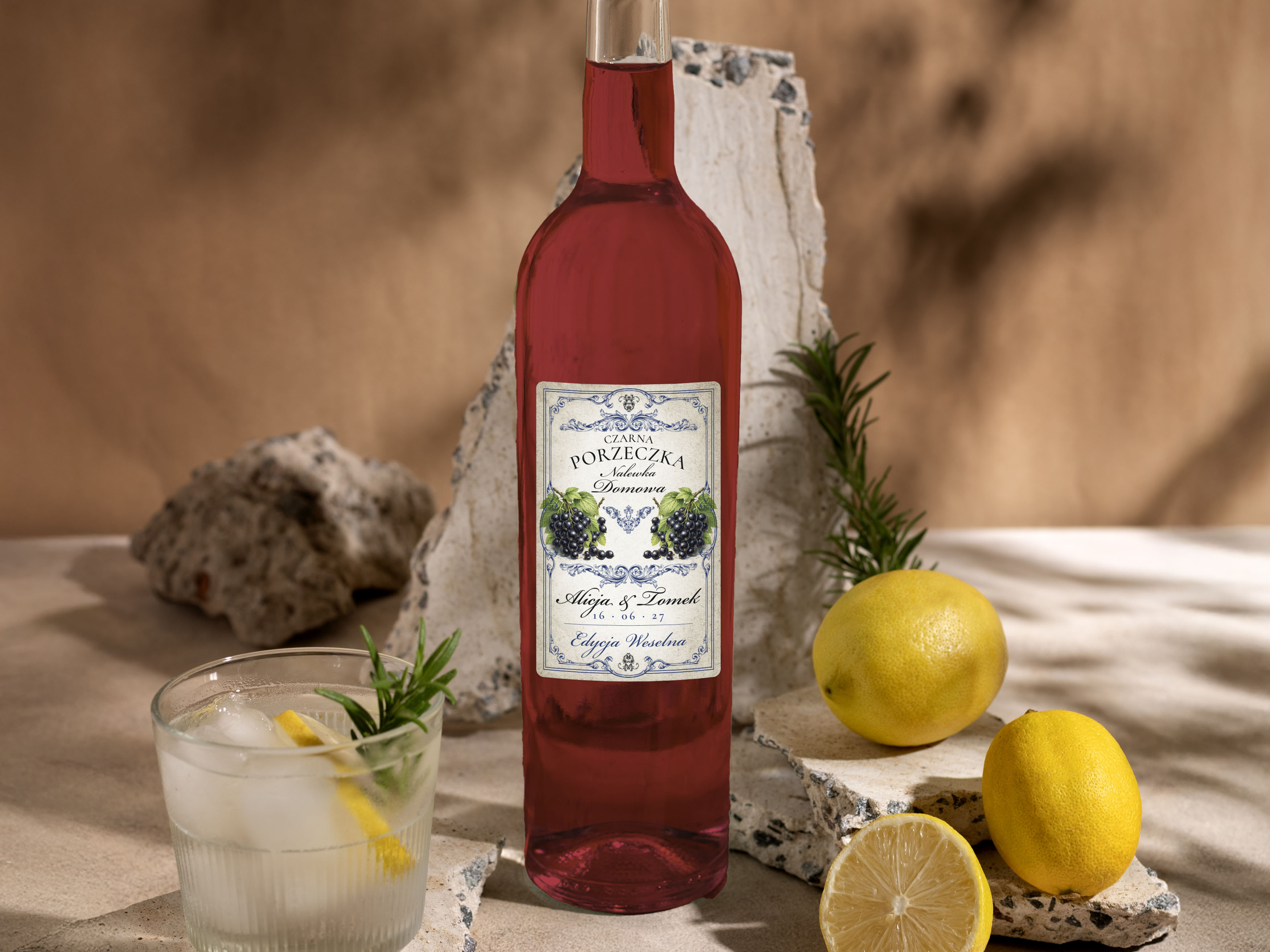Naklejki na alkohol na wesele Czarna Porzeczka, naklejki na Czarną Porzeczkę, personalizowane etykiety vintage z imionami i datą