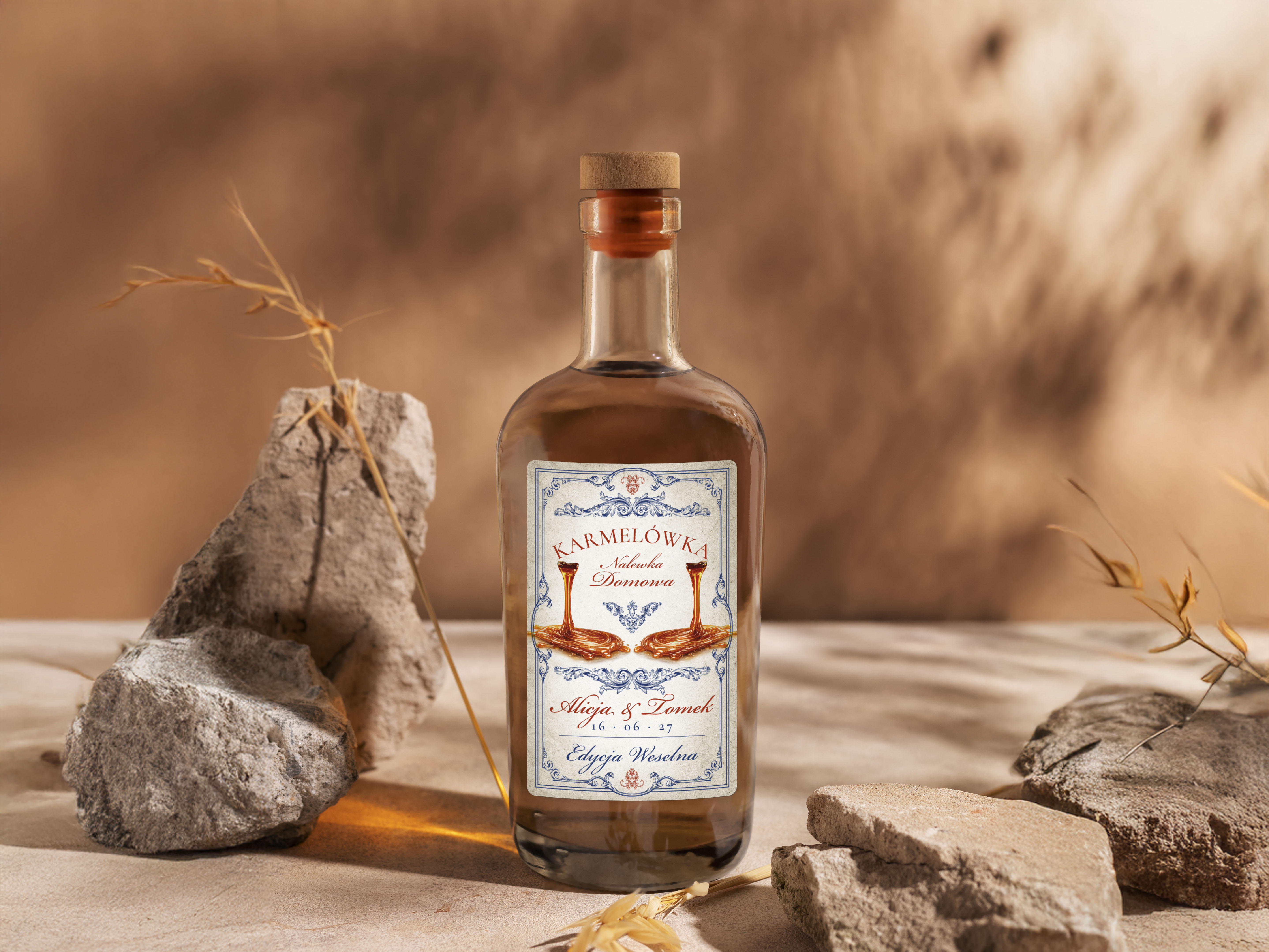Naklejki na alkohol na wesele Karmel, naklejki na Karmelówka, personalizowane etykiety vintage z imionami i datę