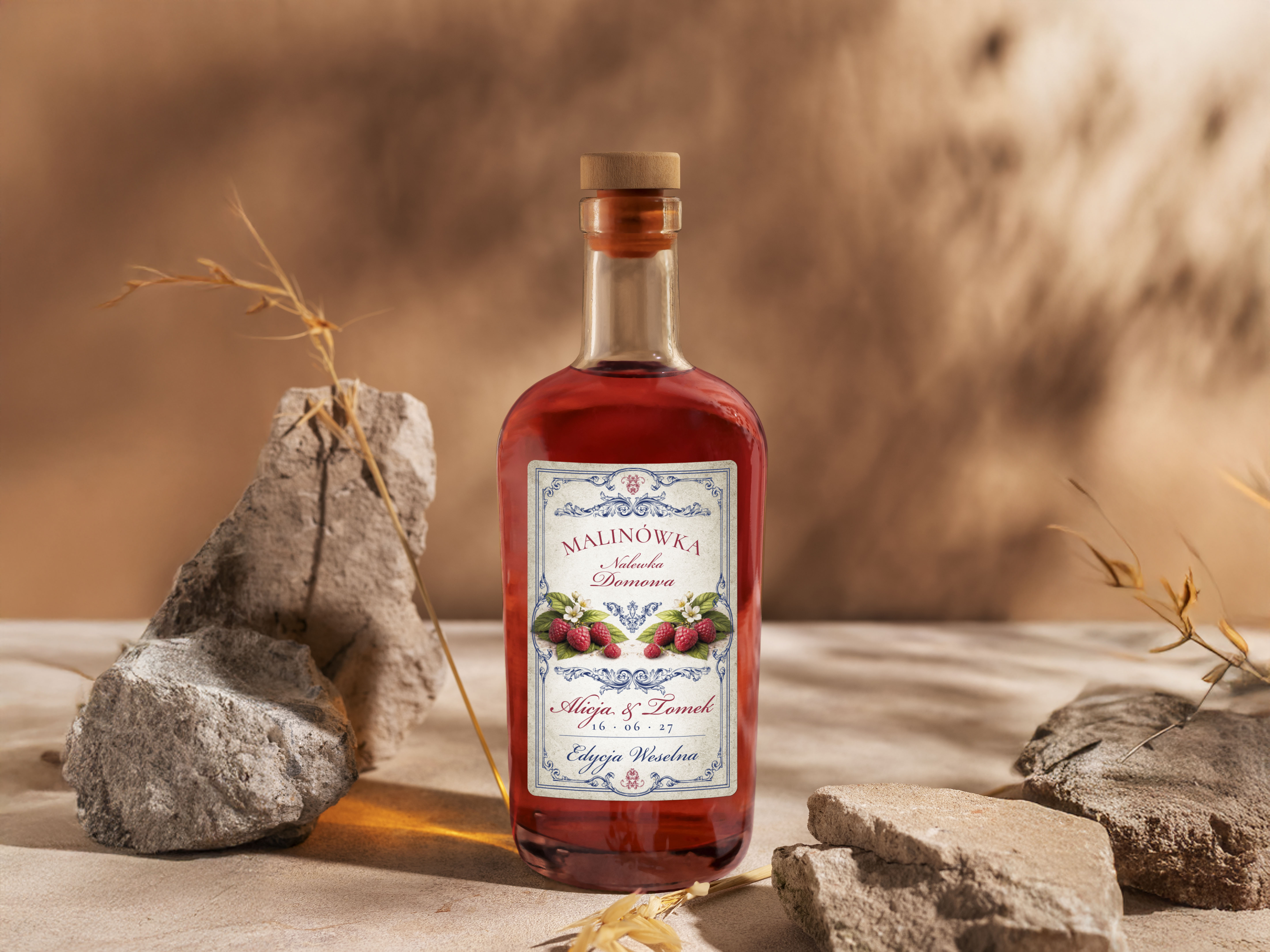 Naklejki na alkohol na wesele Malinówka, naklejki na Malinówkę, personalizowane etykiety vintage z imionami i datą