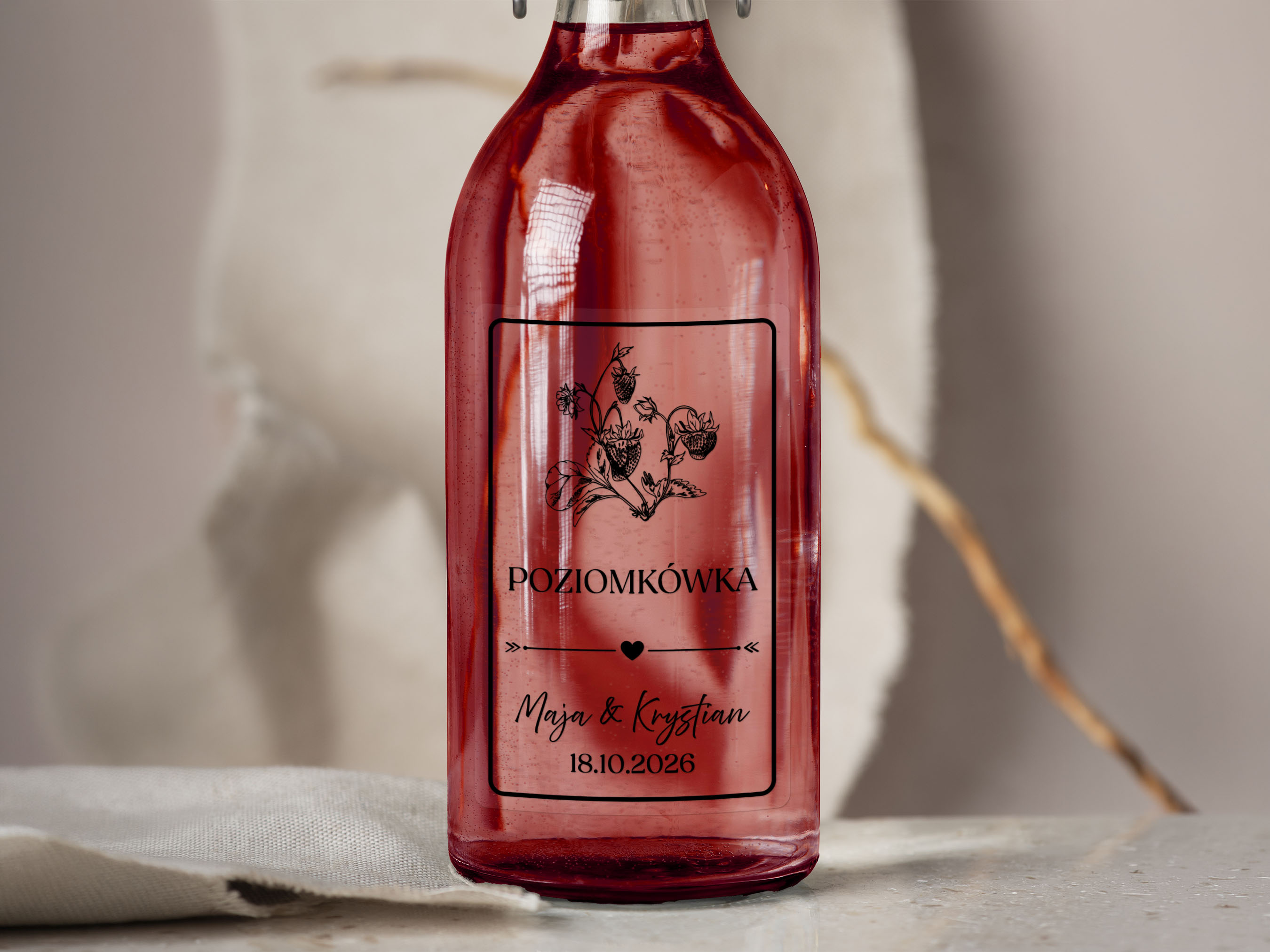 Naklejki na alkohol weselny- Poziomkówka, Etykieta na Nalewkę