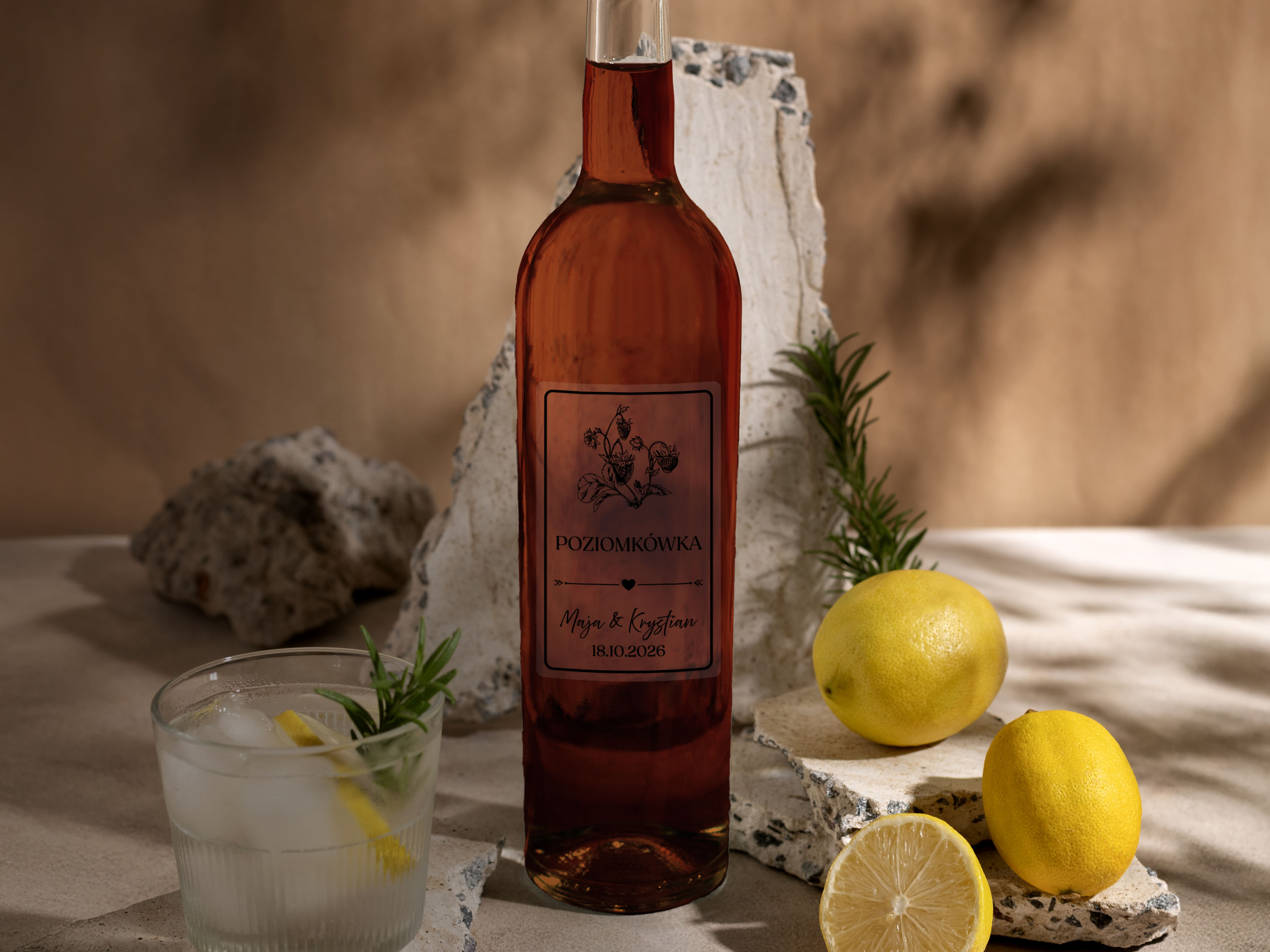 Dodaj wyjątkowego charakteru swojej uroczystości dzięki personalizowanym naklejkom na alkohol weselny. Idealne na wódkę weselną, nalewki weselne, czy nawet bimber, te eleganckie etykiety podkreślą wyjątkowość Twojego wesela. Dzięki możliwości pełnej personalizacji, dopasujesz je do stylu swojej uroczystości, tworząc niezapomnianą pamiątkę zarówno dla gości, jak i dla siebie.