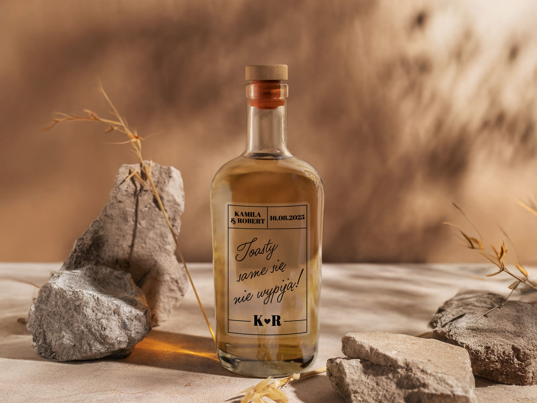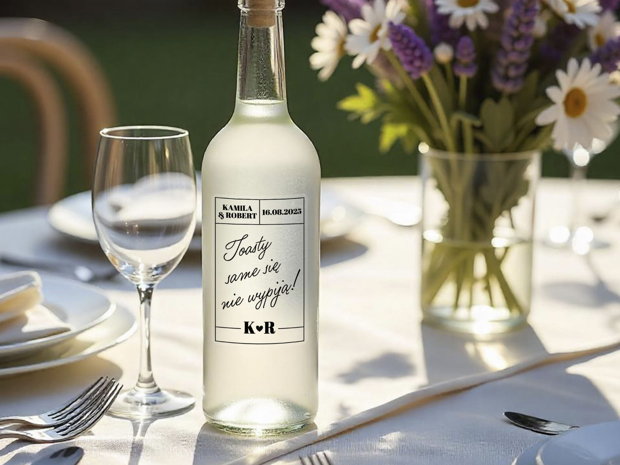 - Personalizacja: Dodaj imiona pary młodej, datę ślubu lub dowolny tekst, aby stworzyć niepowtarzalne naklejki na alkohol weselny.