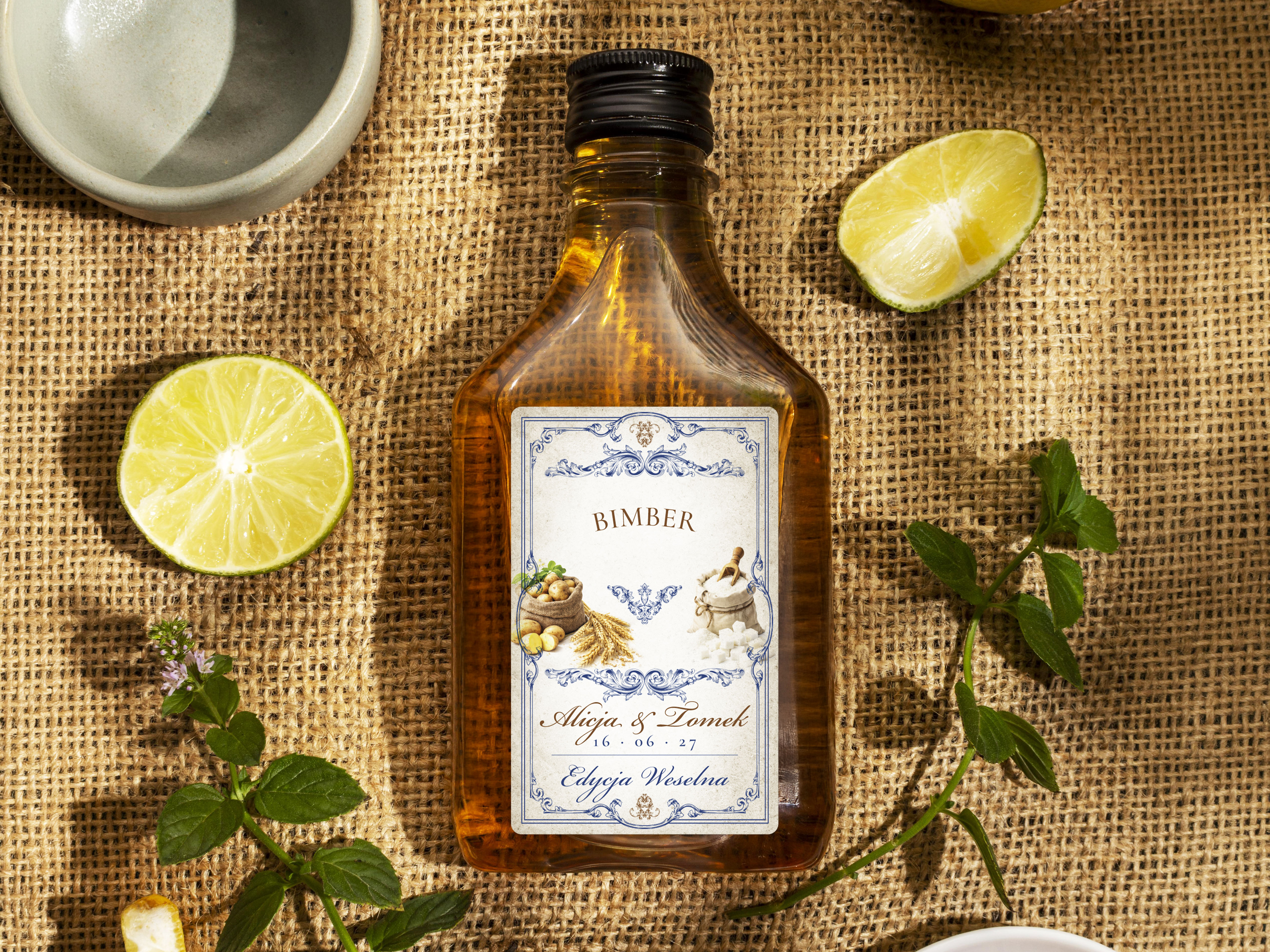 Personalizowane etykiety na butelki 100 ml setki weselne w stylu vintage