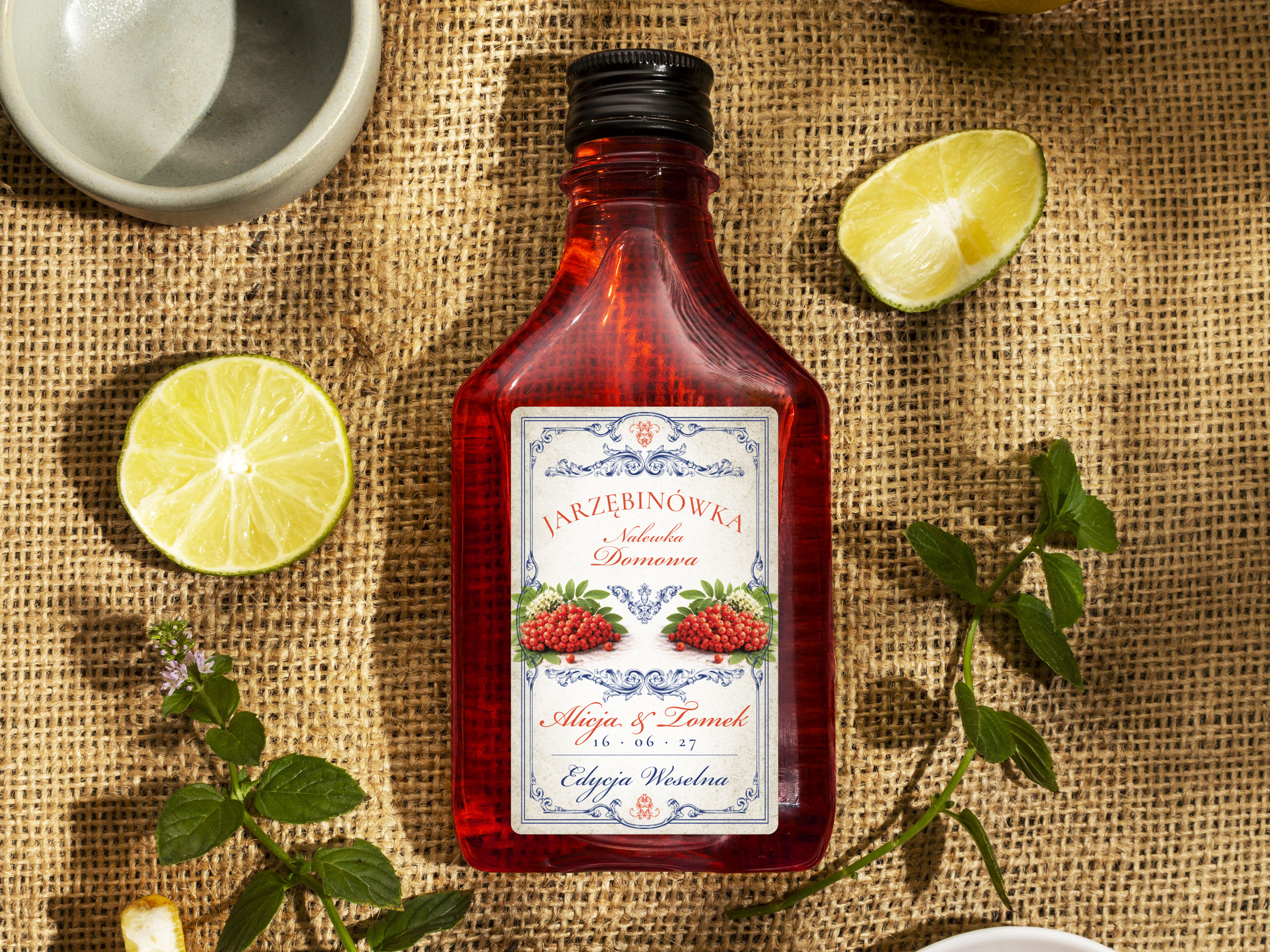 Naklejki na butelki 100 ml setki Jarzębinówka, na Jarzębinówkę etykiety na wesele