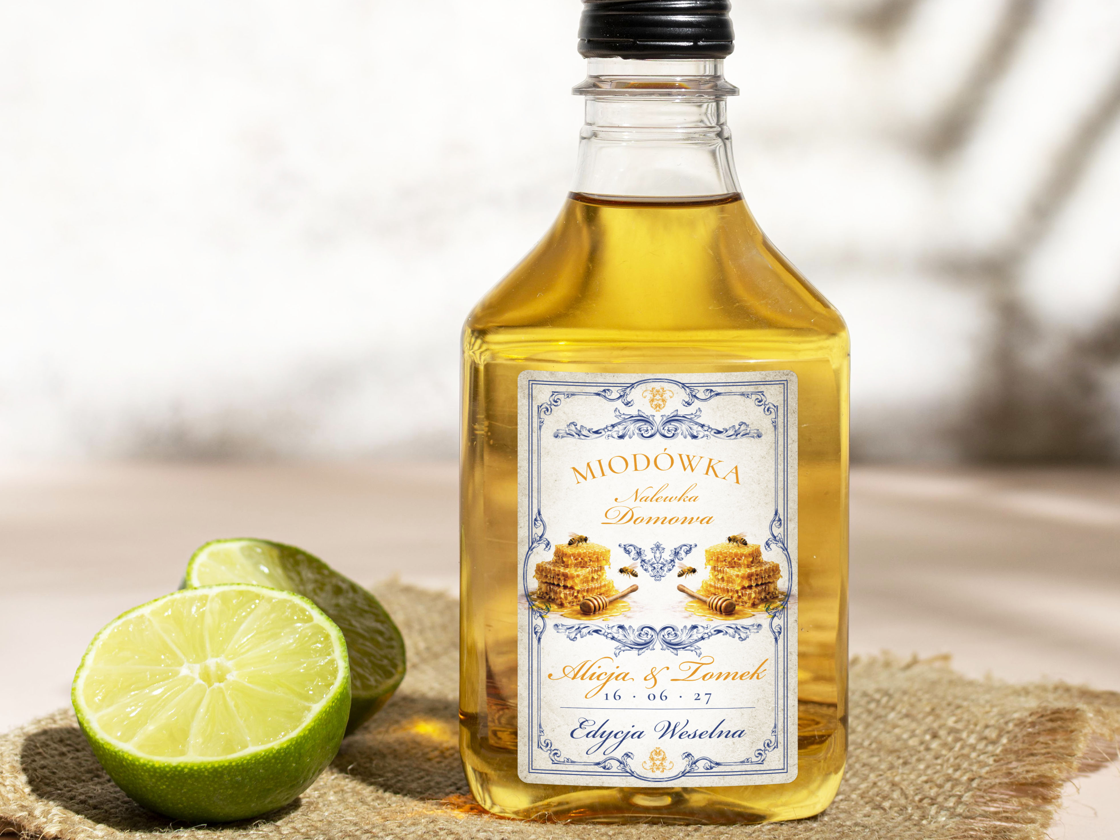 Naklejki na butelki 100 ml setki Miodówka, na Miodówkę etykiety na wesele