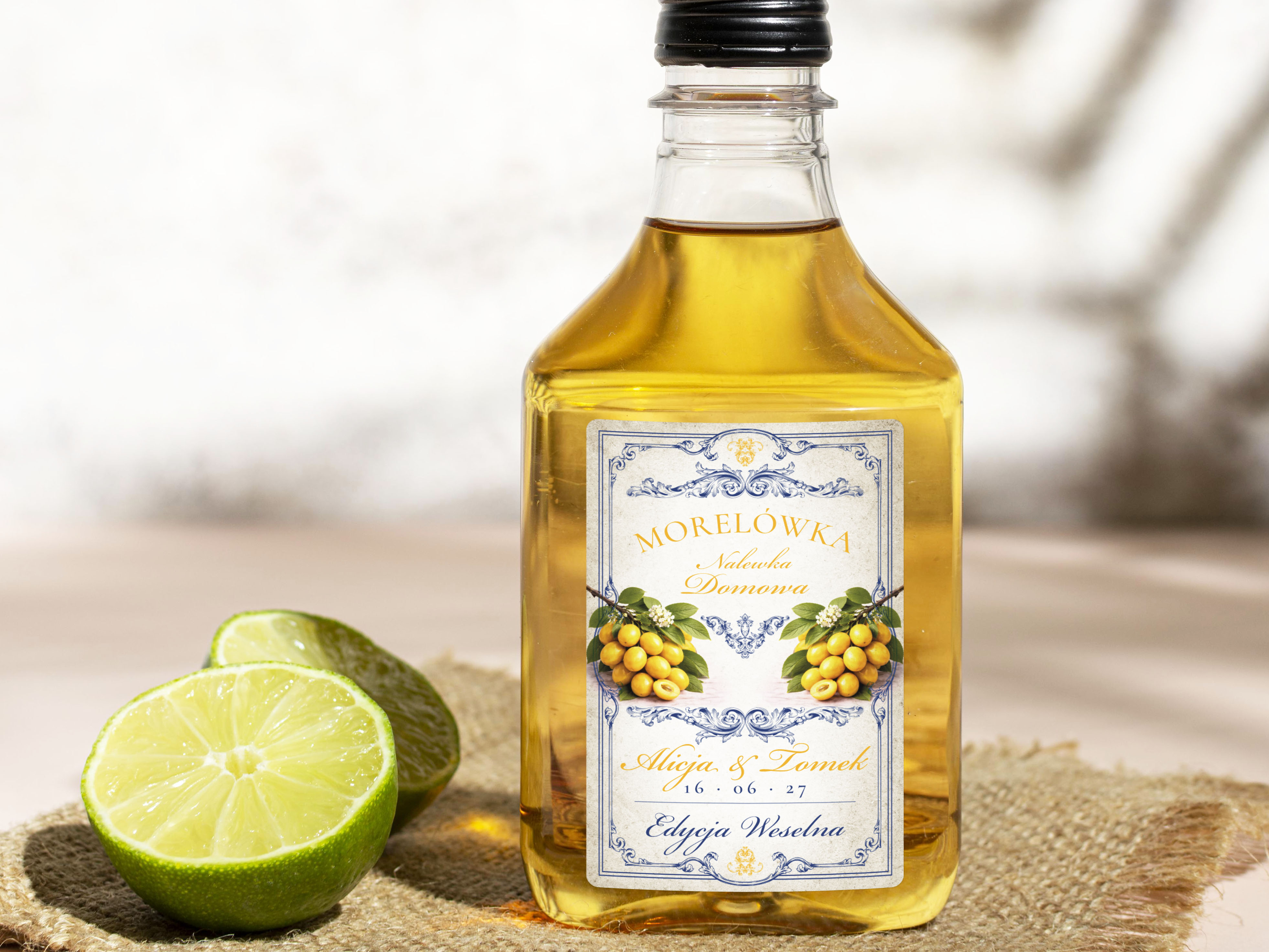 Naklejki na butelki 100 ml setki Morelówka, na Morelówkę etykiety na wesele