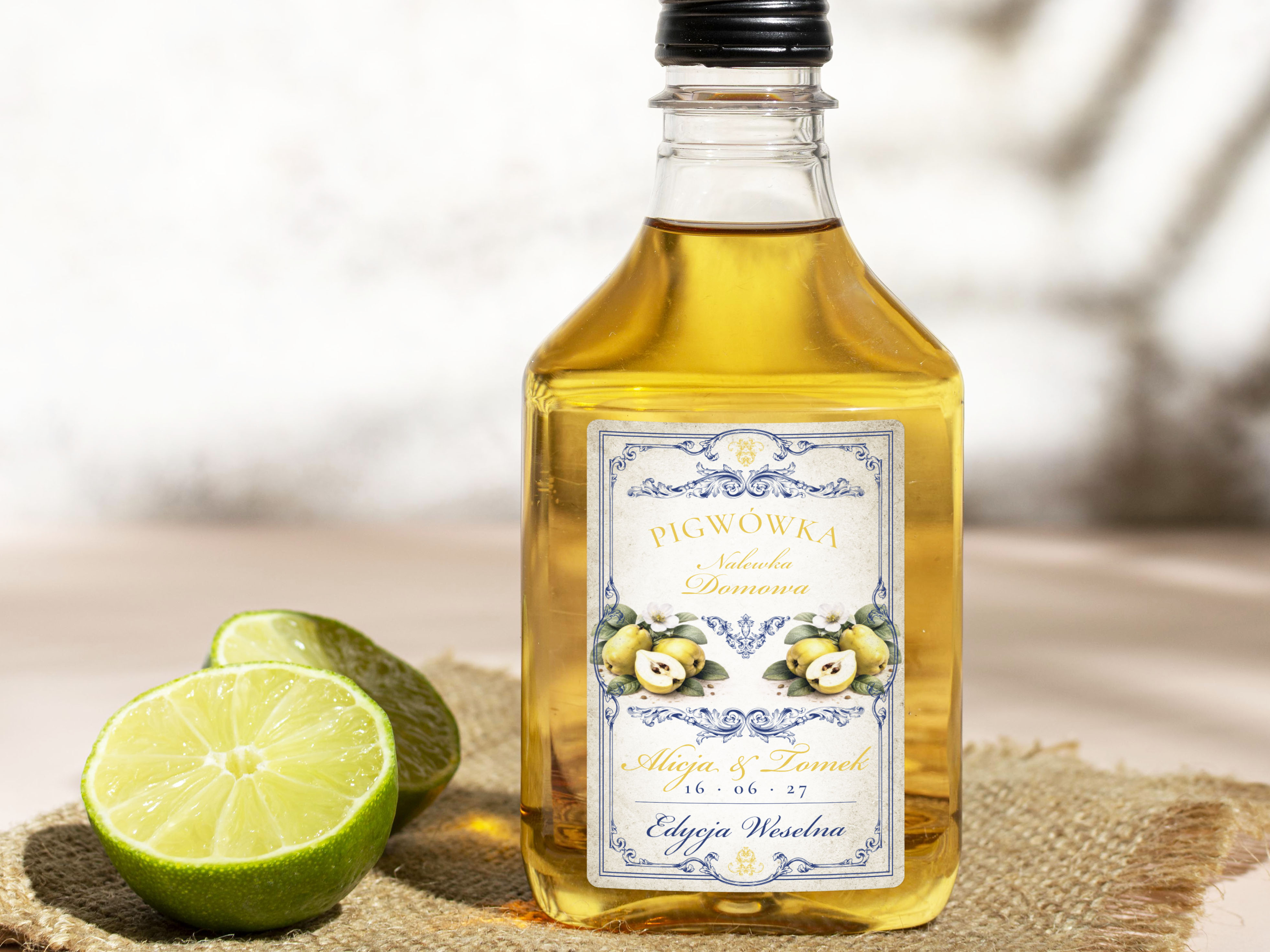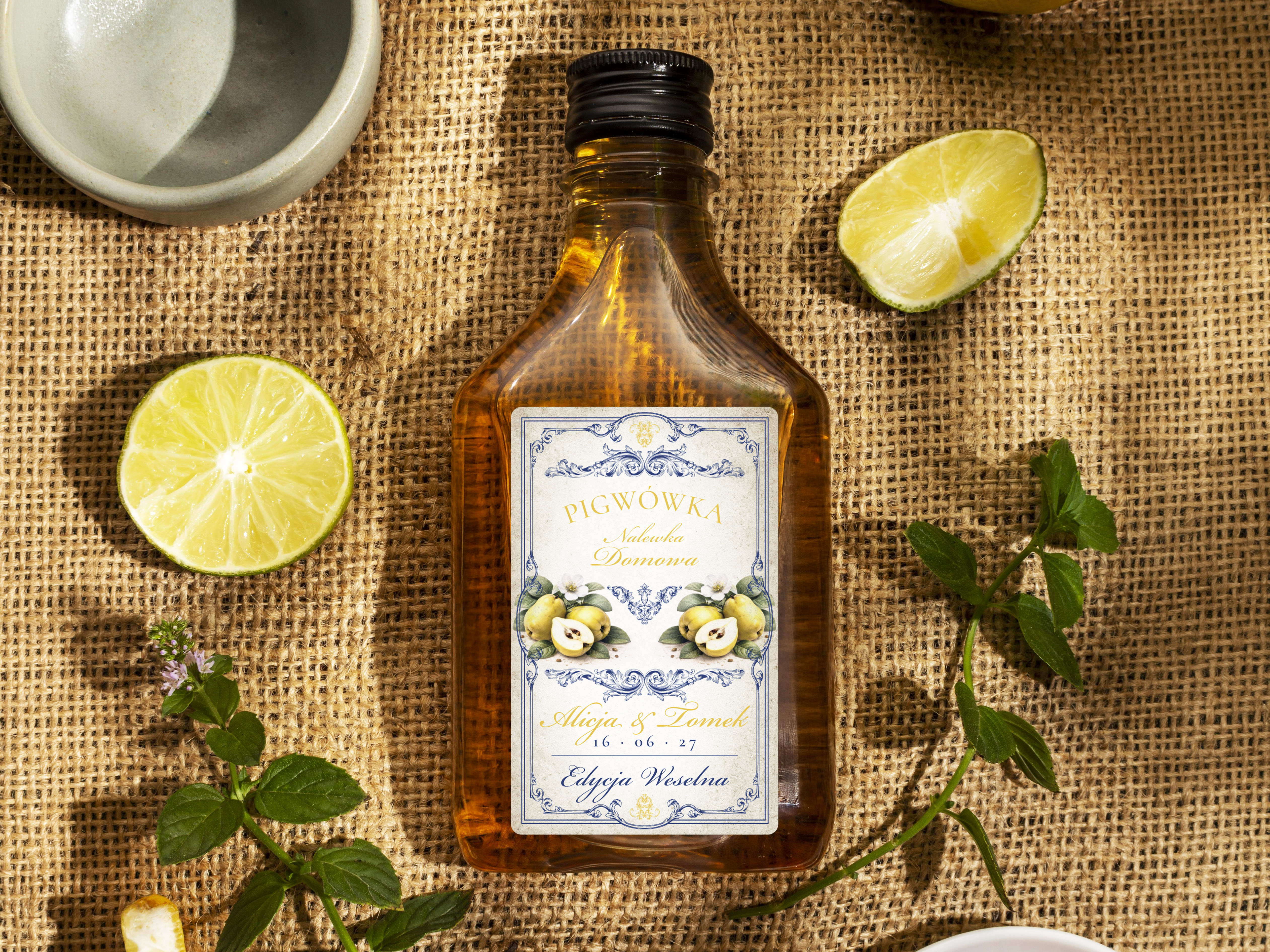 Naklejki na butelki 100 ml setki Pigwówka, na Pigwówkę etykiety na wesele