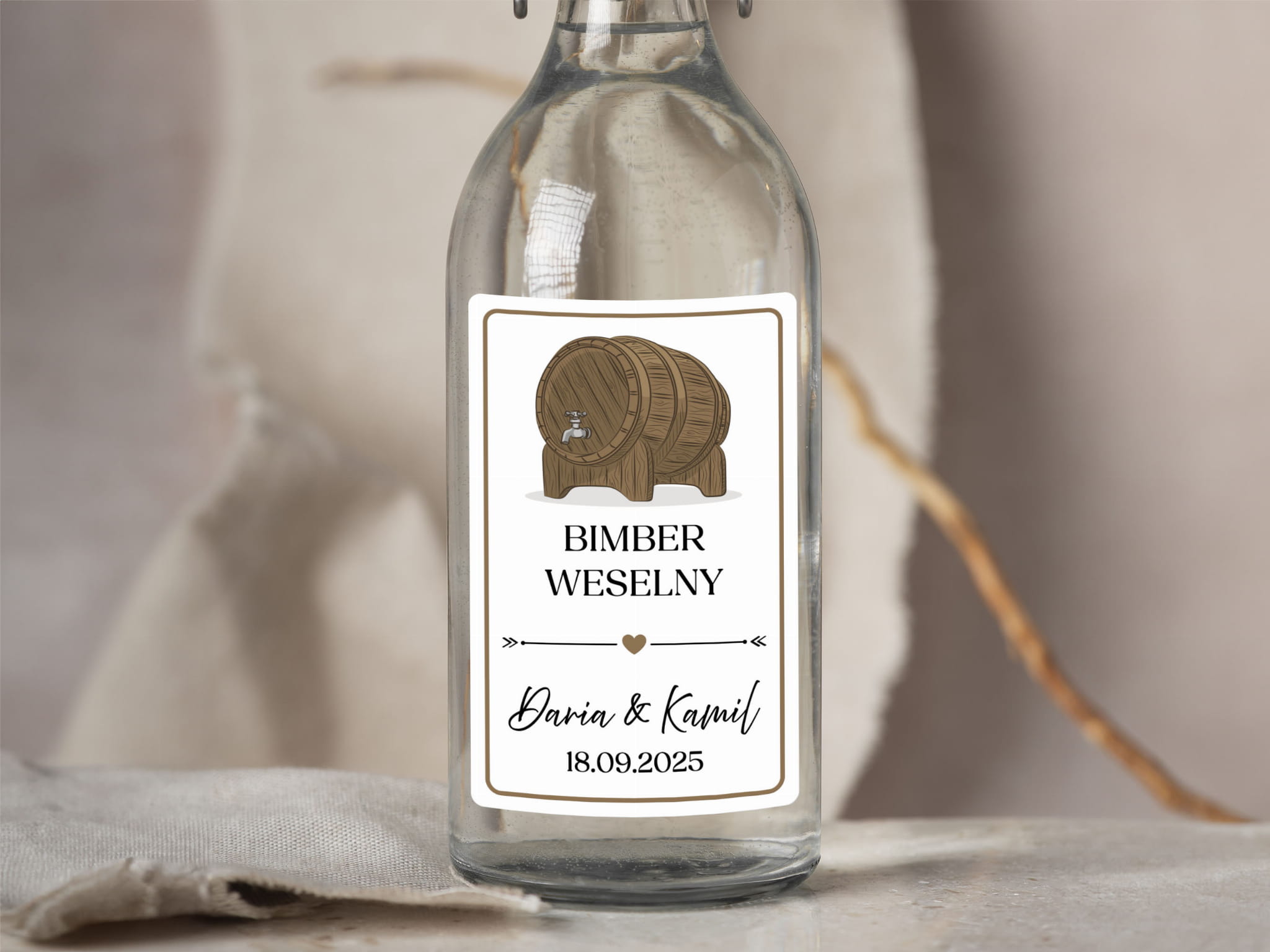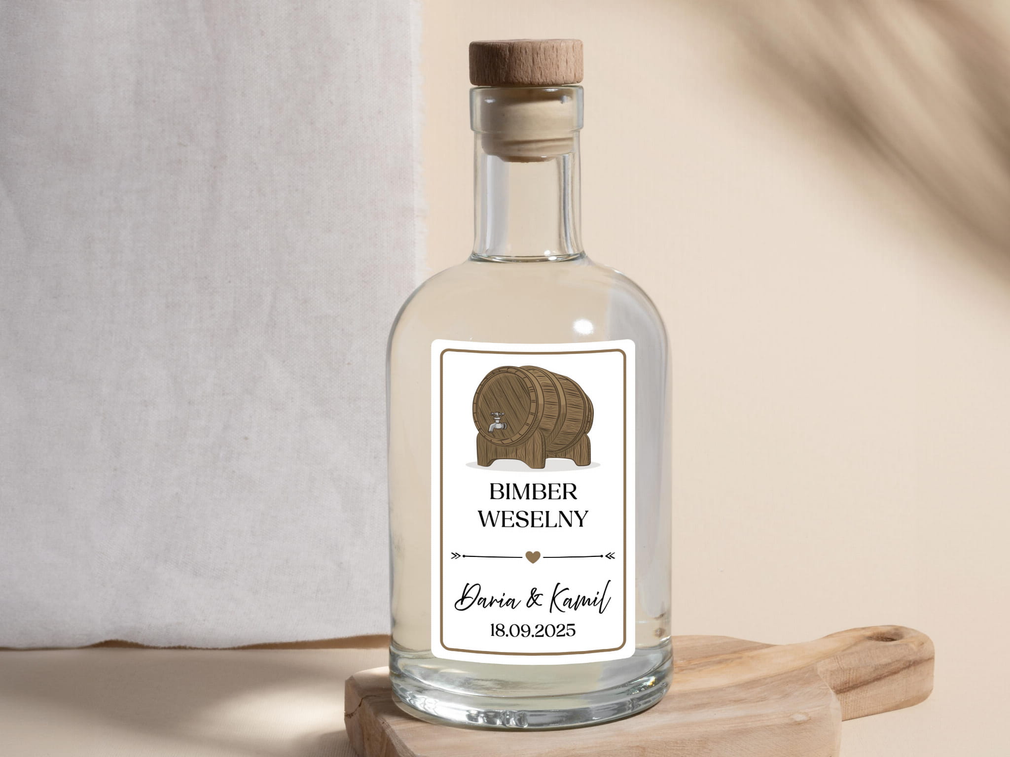 - Personalizacja: Dodaj imiona pary młodej, datę ślubu lub dowolny tekst, aby stworzyć niepowtarzalne naklejki na alkohol weselny.