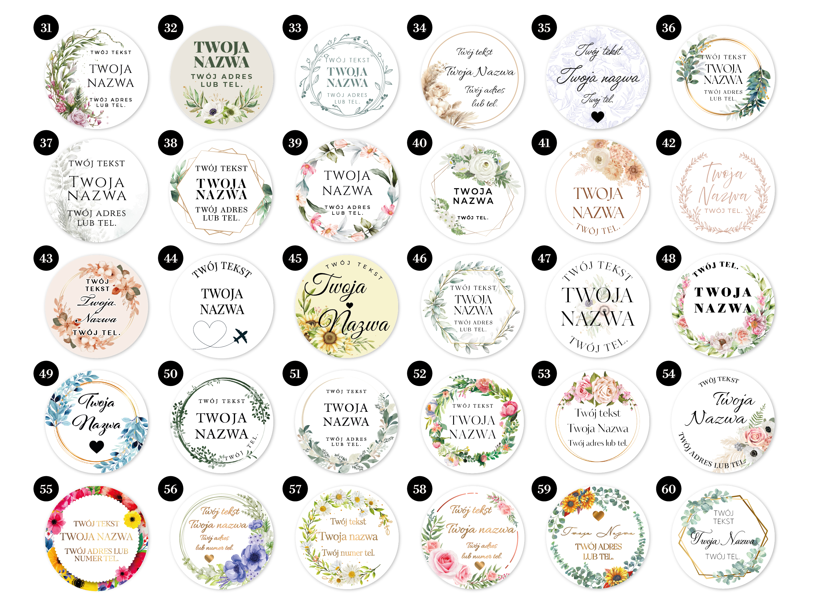 Personalizowane naklejki dla kwiaciarni – etykiety na bukiety, pudełka i torebki, RÓŻNE WZORY, od 100 szt.