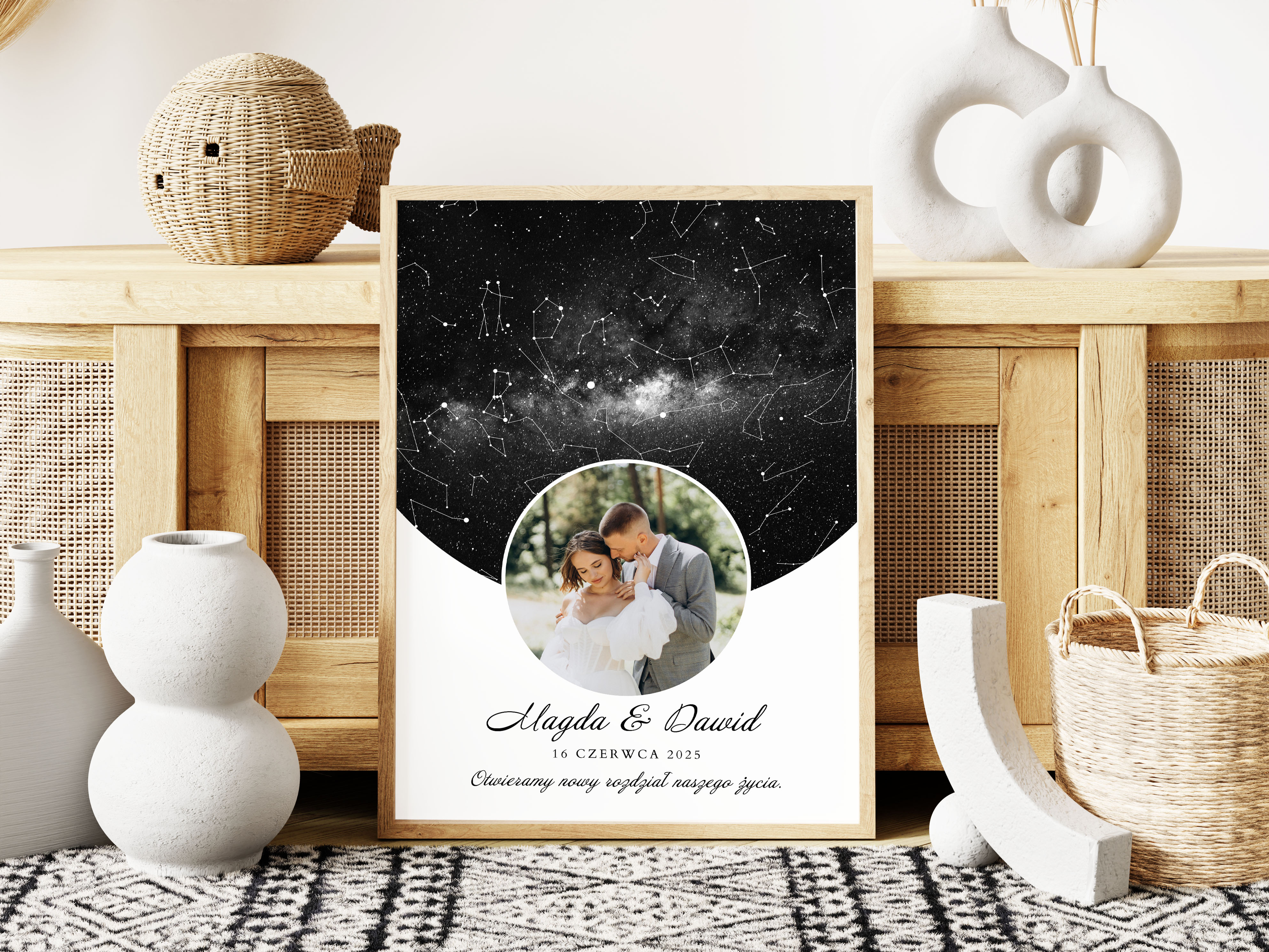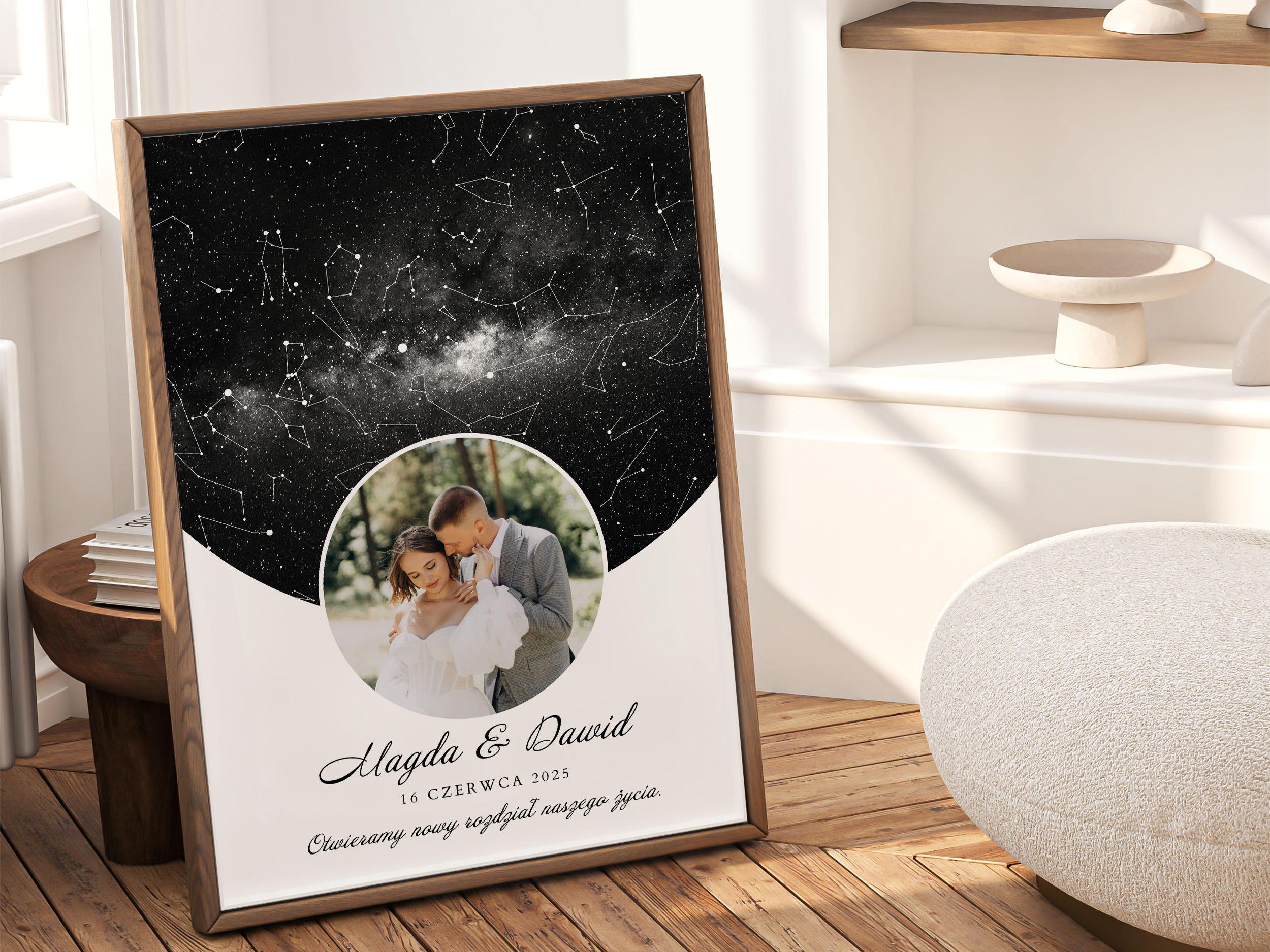 Personalizowany plakat z mapą nieba – romantyczny prezent dla pary i pamiątka wyjątkowego dnia.