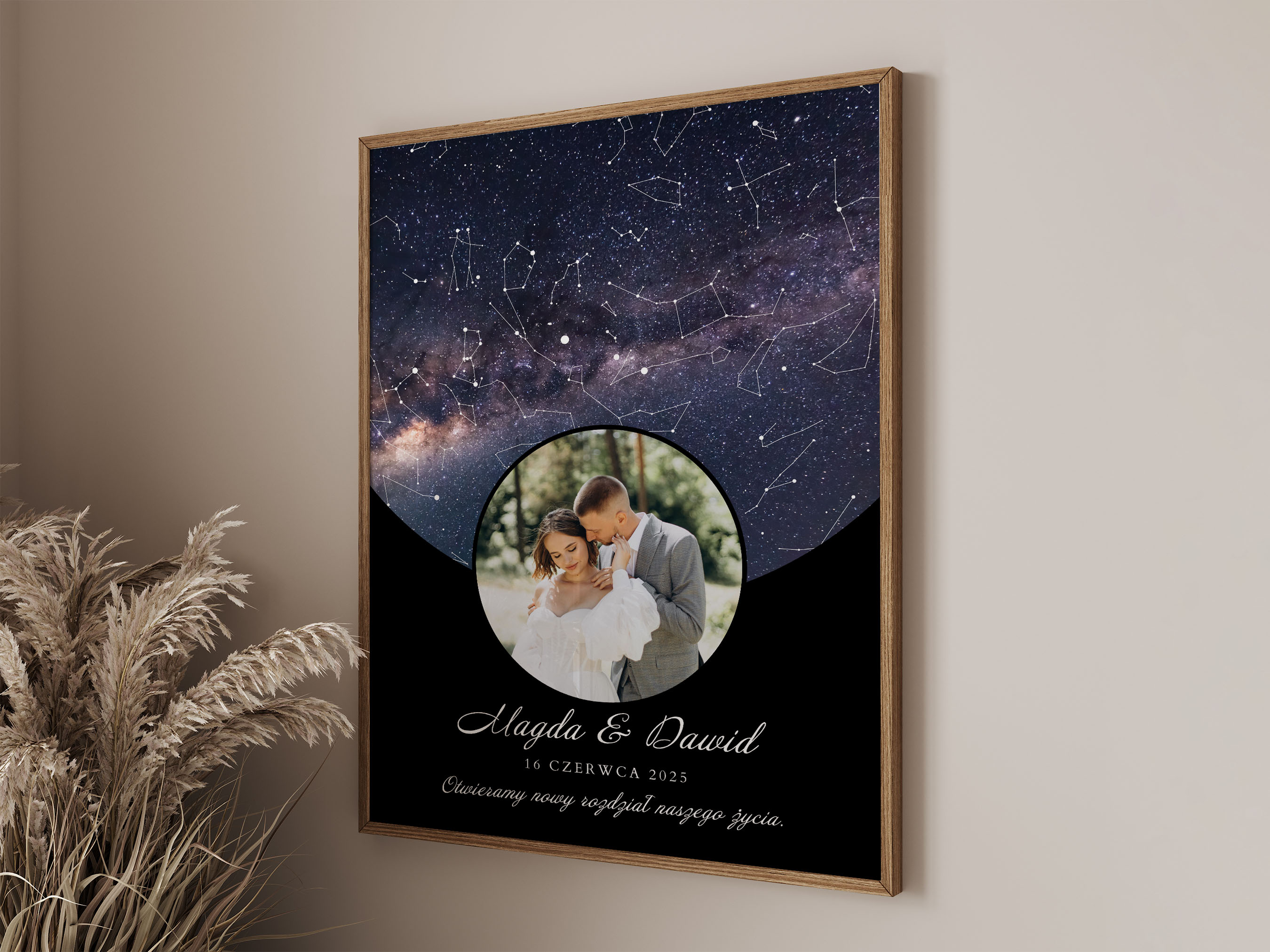 Personalizowany plakat z mapą gwiazd i zdjęciem to niezwykła pamiątka ślubu, zaręczyn lub innego ważnego momentu w życiu pary. Ukazuje niebo dokładnie takim, jakie było w wybranym dniu i miejscu – tworząc romantyczny symbol wspólnego początku.