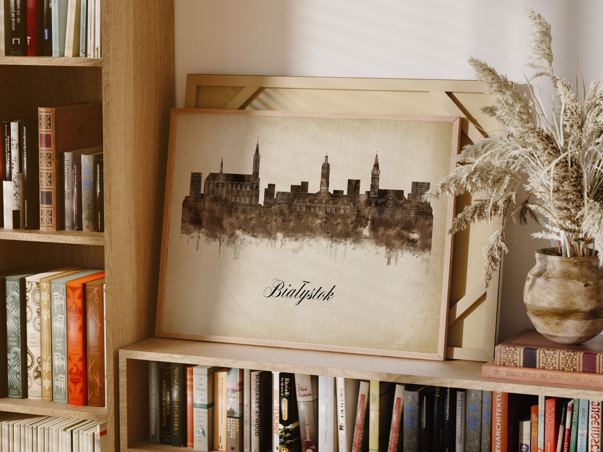 Plakaty skyline w stylu vintage to nowoczesne dzieła sztuki, które nawiązują do estetyki minionych dekad. Przedstawiają miejskie krajobrazy w retro kolorystyce, z wyblakłymi barwami i z delikatną patyną czasu. Kontury są często zmiękczone, a szczegóły budynków lekko stylizowane, co dodaje im nostalgicznego uroku. Tła plakatów utrzymane są w odcieniach przypominających stary papier, z subtelnymi teksturami i ciepłymi, przygaszonymi tonami. Całość tworzy elegancki i przytulny klimat, idealny do wnętrz, które łączą nowoczesność z klasycznym wdziękiem.