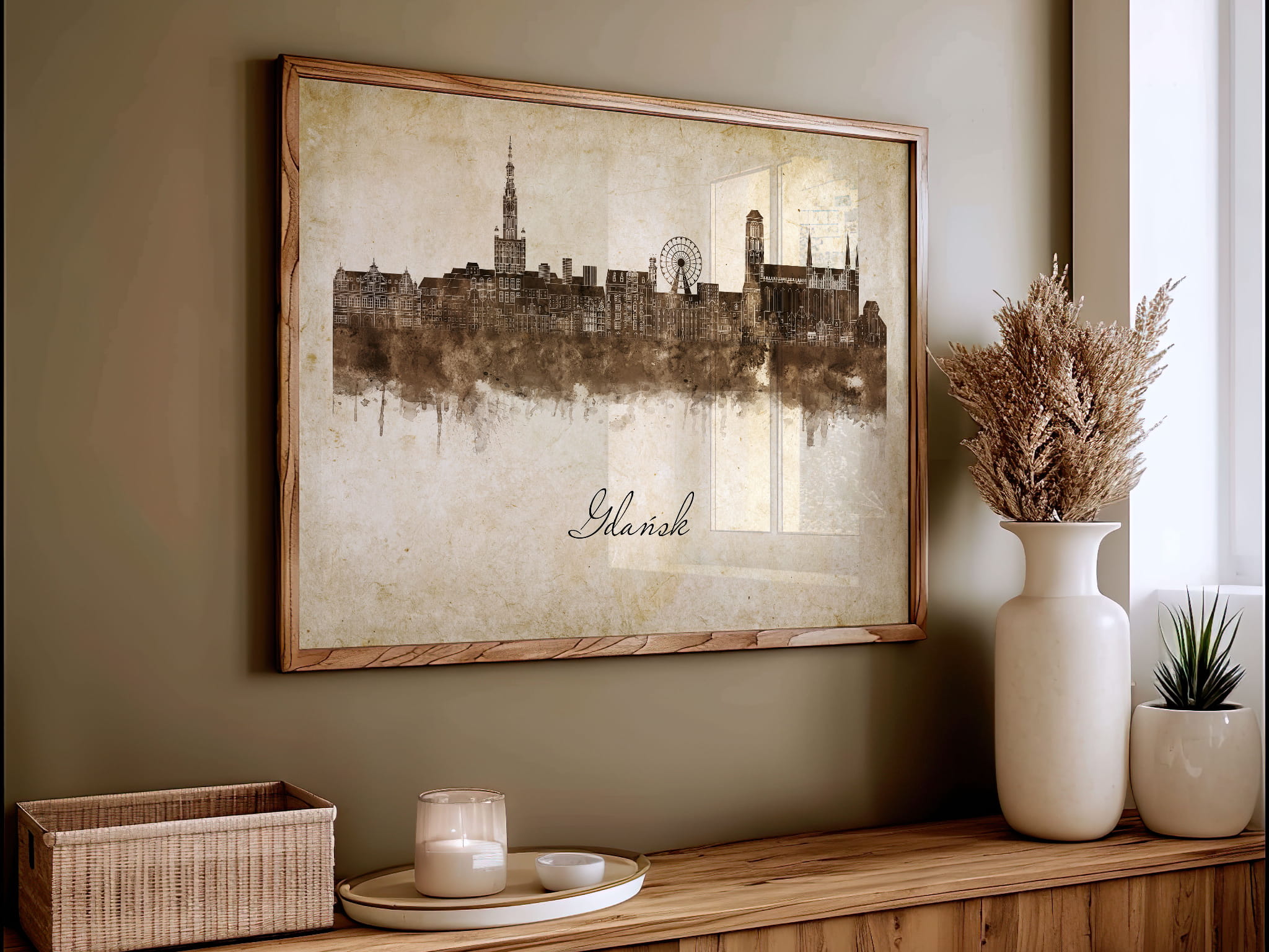 Plakaty skyline w stylu vintage to nowoczesne dzieła sztuki, które nawiązują do estetyki minionych dekad. Przedstawiają miejskie krajobrazy w retro kolorystyce, z wyblakłymi barwami i z delikatną patyną czasu. Kontury są często zmiękczone, a szczegóły budynków lekko stylizowane, co dodaje im nostalgicznego uroku. Tła plakatów utrzymane są w odcieniach przypominających stary papier, z subtelnymi teksturami i ciepłymi, przygaszonymi tonami. Całość tworzy elegancki i przytulny klimat, idealny do wnętrz, które łączą nowoczesność z klasycznym wdziękiem.