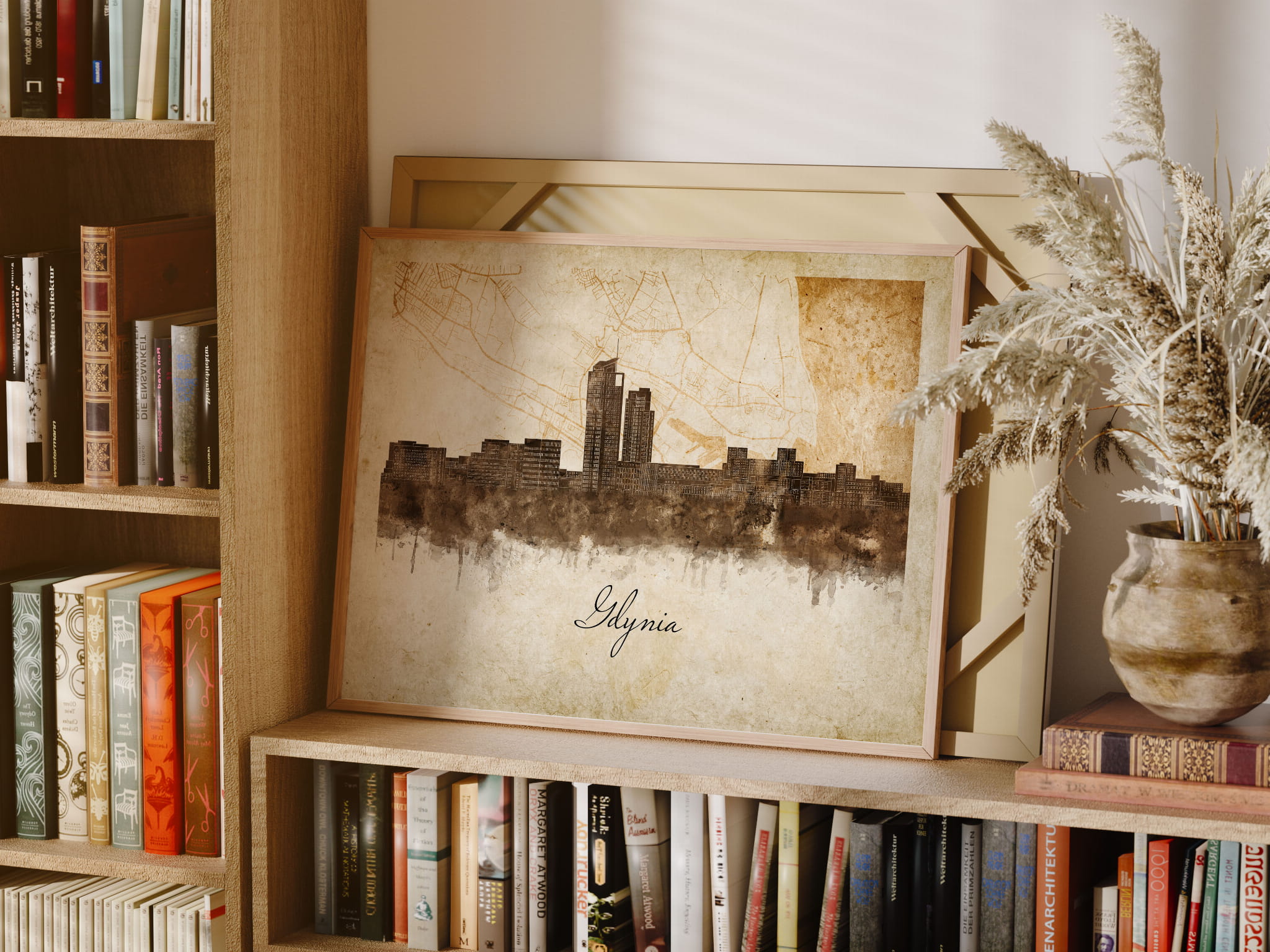 Plakaty skyline w stylu vintage to nowoczesne dzieła sztuki, które nawiązują do estetyki minionych dekad. Przedstawiają miejskie krajobrazy w retro kolorystyce, z wyblakłymi barwami i z delikatną patyną czasu. Kontury są często zmiękczone, a szczegóły budynków lekko stylizowane, co dodaje im nostalgicznego uroku. Tła plakatów utrzymane są w odcieniach przypominających stary papier, z subtelnymi teksturami i ciepłymi, przygaszonymi tonami. Całość tworzy elegancki i przytulny klimat, idealny do wnętrz, które łączą nowoczesność z klasycznym wdziękiem.