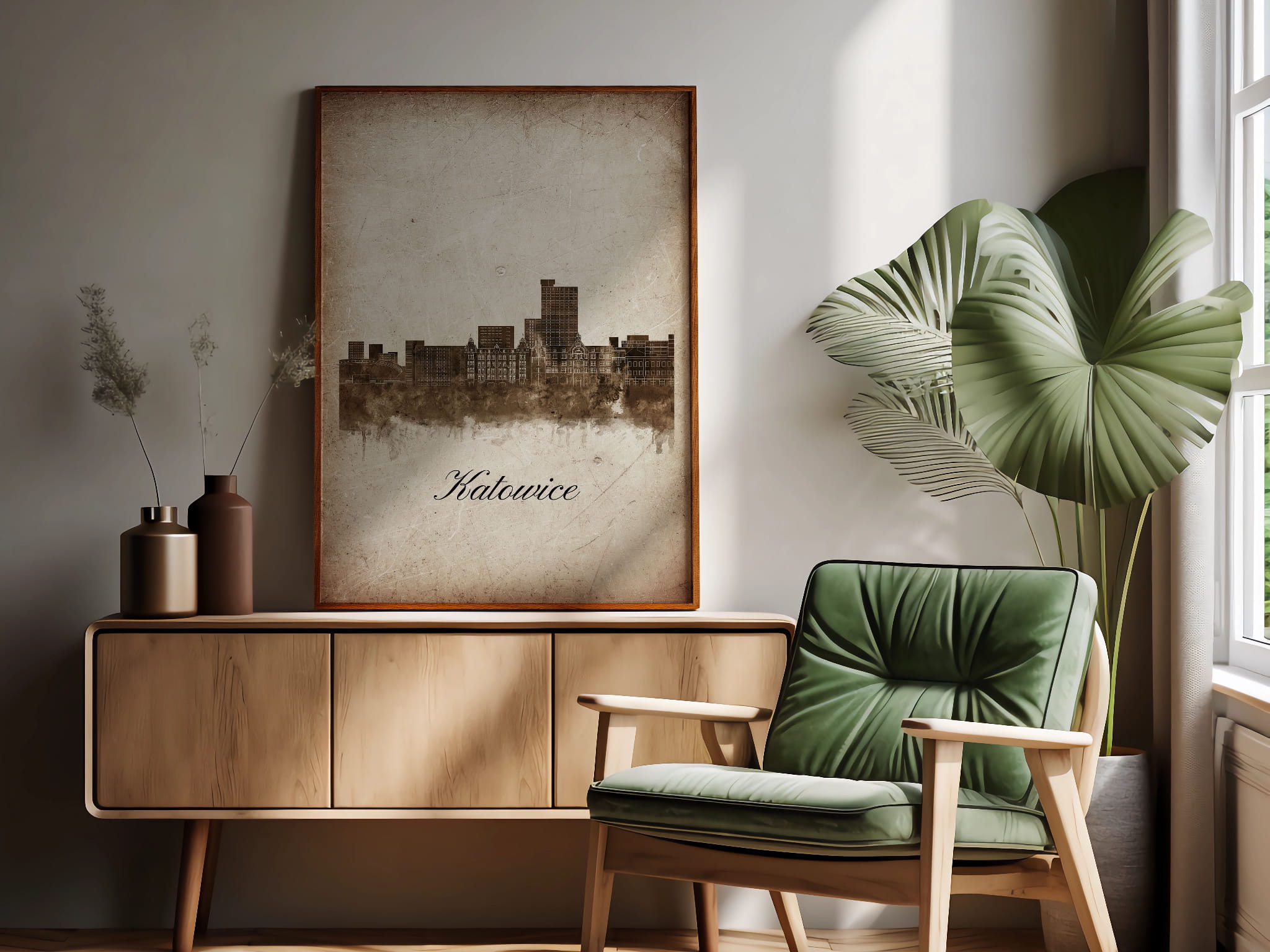 Plakaty skyline w stylu vintage to nowoczesne dzieła sztuki, które nawiązują do estetyki minionych dekad. Przedstawiają miejskie krajobrazy w retro kolorystyce, z wyblakłymi barwami i z delikatną patyną czasu. Kontury są często zmiękczone, a szczegóły budynków lekko stylizowane, co dodaje im nostalgicznego uroku. Tła plakatów utrzymane są w odcieniach przypominających stary papier, z subtelnymi teksturami i ciepłymi, przygaszonymi tonami. Całość tworzy elegancki i przytulny klimat, idealny do wnętrz, które łączą nowoczesność z klasycznym wdziękiem.