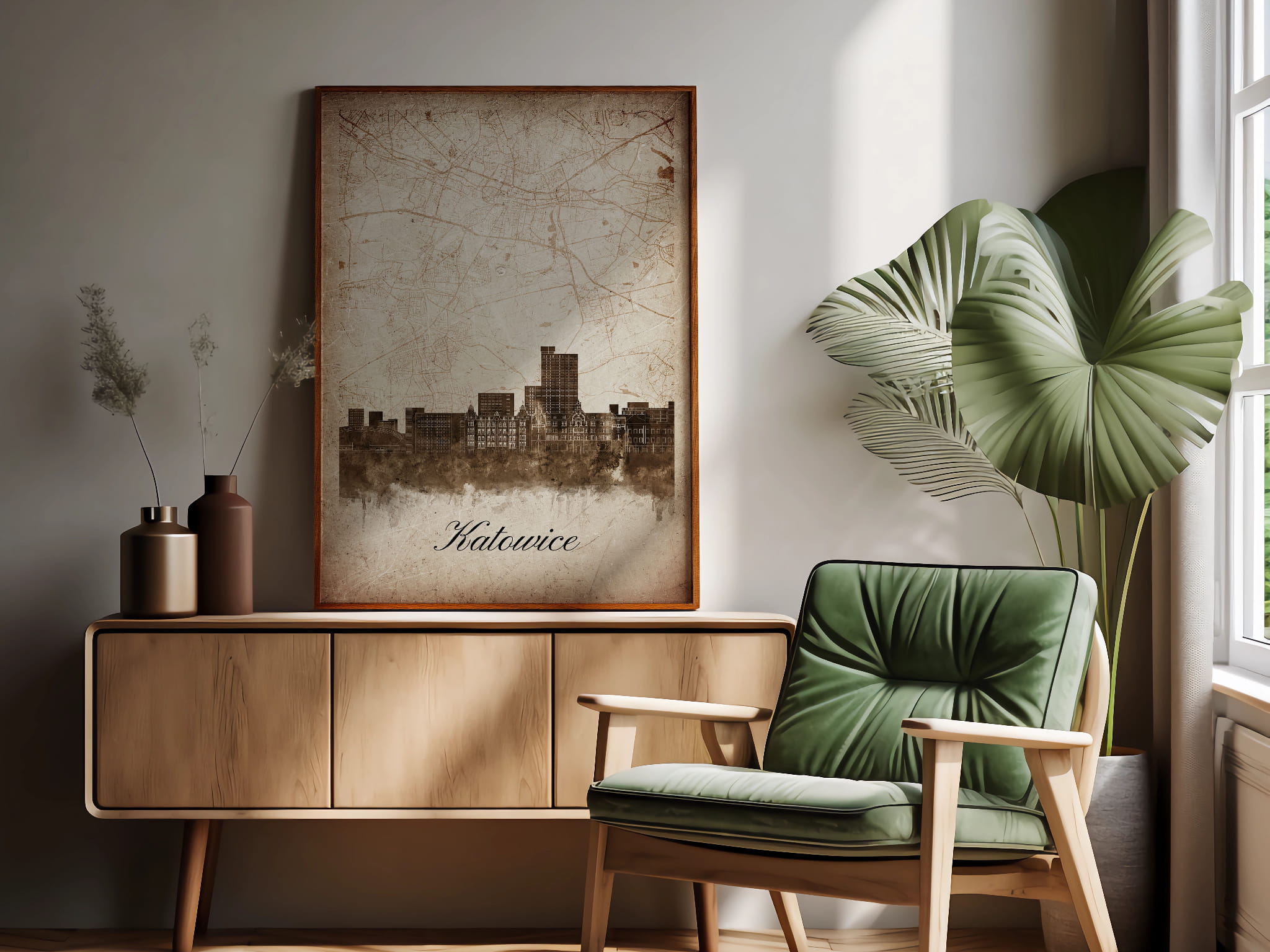 Plakaty skyline w stylu vintage to nowoczesne dzieła sztuki, które nawiązują do estetyki minionych dekad. Przedstawiają miejskie krajobrazy w retro kolorystyce, z wyblakłymi barwami i z delikatną patyną czasu. Kontury są często zmiękczone, a szczegóły budynków lekko stylizowane, co dodaje im nostalgicznego uroku. Tła plakatów utrzymane są w odcieniach przypominających stary papier, z subtelnymi teksturami i ciepłymi, przygaszonymi tonami. Całość tworzy elegancki i przytulny klimat, idealny do wnętrz, które łączą nowoczesność z klasycznym wdziękiem.