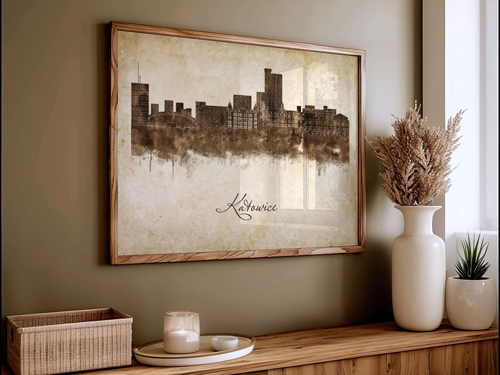 Plakaty skyline w stylu vintage to nowoczesne dzieła sztuki, które nawiązują do estetyki minionych dekad. Przedstawiają miejskie krajobrazy w retro kolorystyce, z wyblakłymi barwami i z delikatną patyną czasu. Kontury są często zmiękczone, a szczegóły budynków lekko stylizowane, co dodaje im nostalgicznego uroku. Tła plakatów utrzymane są w odcieniach przypominających stary papier, z subtelnymi teksturami i ciepłymi, przygaszonymi tonami. Całość tworzy elegancki i przytulny klimat, idealny do wnętrz, które łączą nowoczesność z klasycznym wdziękiem.