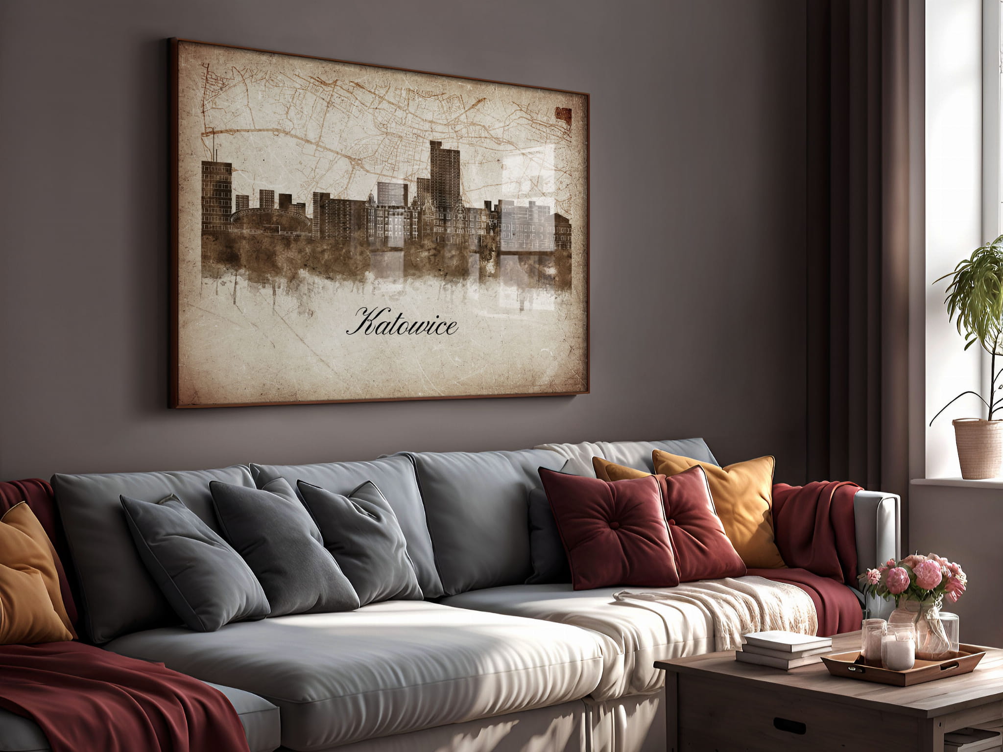 Plakaty skyline w stylu vintage to nowoczesne dzieła sztuki, które nawiązują do estetyki minionych dekad. Przedstawiają miejskie krajobrazy w retro kolorystyce, z wyblakłymi barwami i z delikatną patyną czasu. Kontury są często zmiękczone, a szczegóły budynków lekko stylizowane, co dodaje im nostalgicznego uroku. Tła plakatów utrzymane są w odcieniach przypominających stary papier, z subtelnymi teksturami i ciepłymi, przygaszonymi tonami. Całość tworzy elegancki i przytulny klimat, idealny do wnętrz, które łączą nowoczesność z klasycznym wdziękiem.