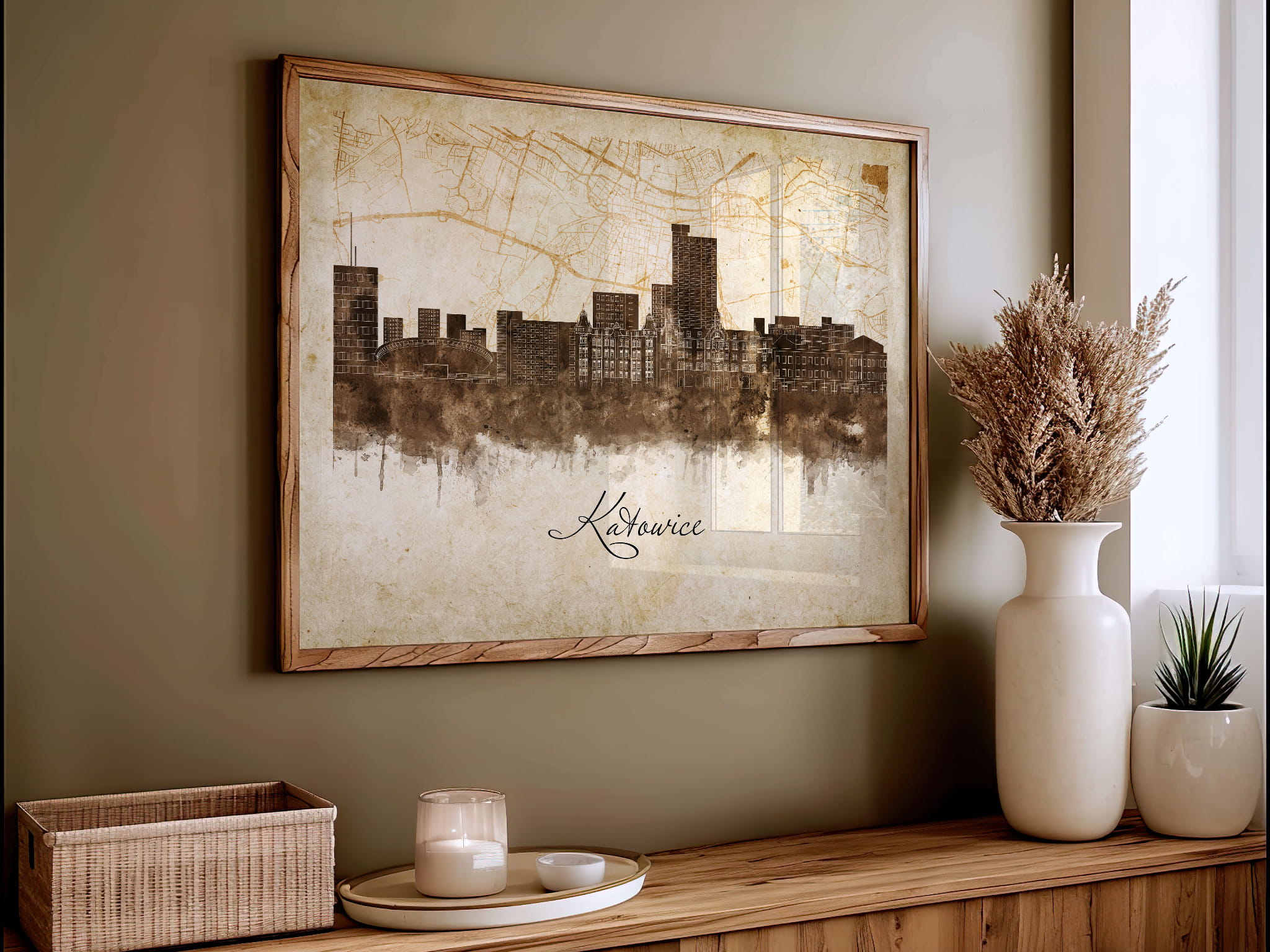 Plakaty skyline w stylu vintage to nowoczesne dzieła sztuki, które nawiązują do estetyki minionych dekad. Przedstawiają miejskie krajobrazy w retro kolorystyce, z wyblakłymi barwami i z delikatną patyną czasu. Kontury są często zmiękczone, a szczegóły budynków lekko stylizowane, co dodaje im nostalgicznego uroku. Tła plakatów utrzymane są w odcieniach przypominających stary papier, z subtelnymi teksturami i ciepłymi, przygaszonymi tonami. Całość tworzy elegancki i przytulny klimat, idealny do wnętrz, które łączą nowoczesność z klasycznym wdziękiem.