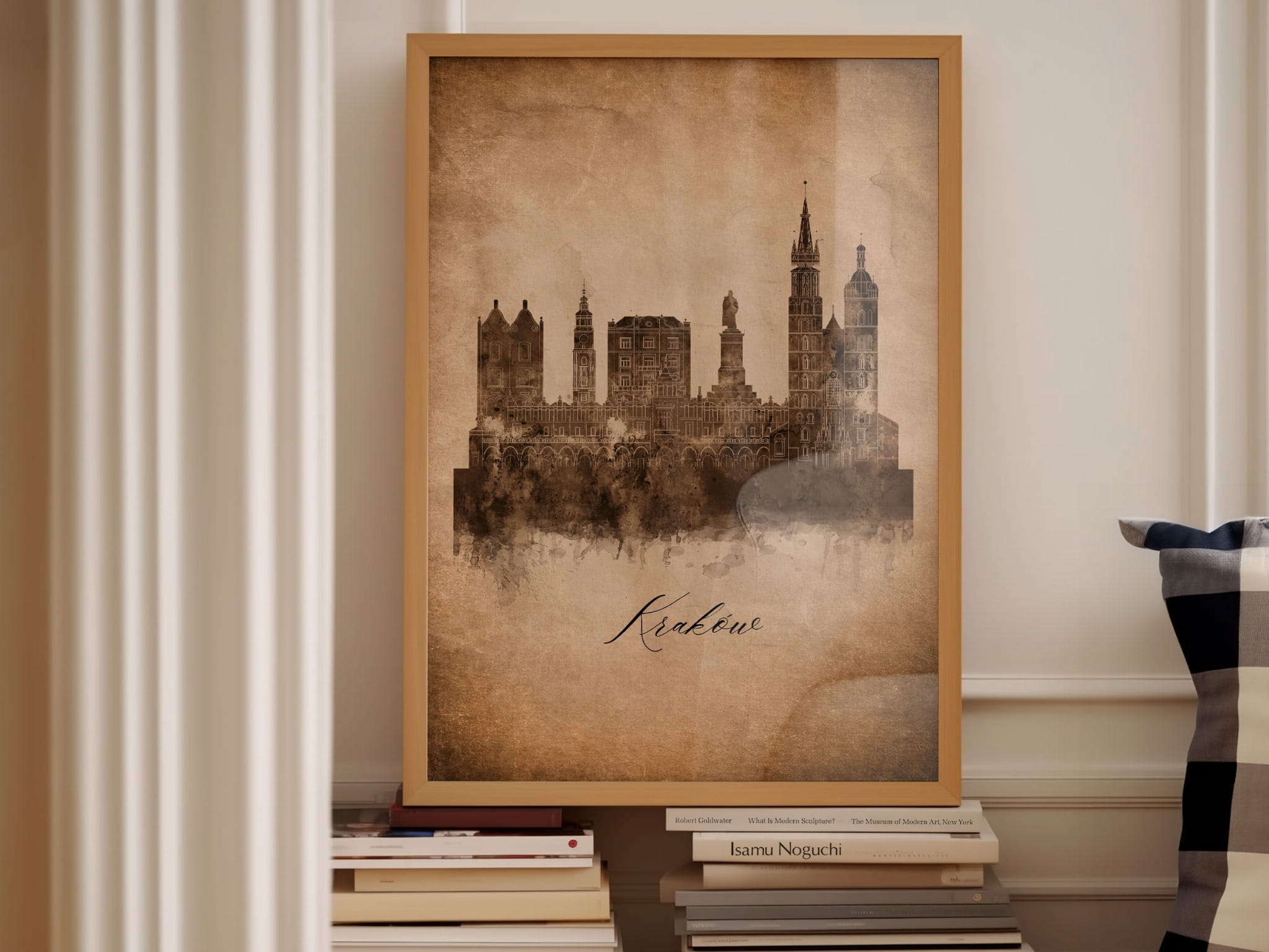 Plakaty skyline w stylu vintage to nowoczesne dzieła sztuki, które nawiązują do estetyki minionych dekad. Przedstawiają miejskie krajobrazy w retro kolorystyce, z wyblakłymi barwami i z delikatną patyną czasu. Kontury są często zmiękczone, a szczegóły budynków lekko stylizowane, co dodaje im nostalgicznego uroku. Tła plakatów utrzymane są w odcieniach przypominających stary papier, z subtelnymi teksturami i ciepłymi, przygaszonymi tonami. Całość tworzy elegancki i przytulny klimat, idealny do wnętrz, które łączą nowoczesność z klasycznym wdziękiem.