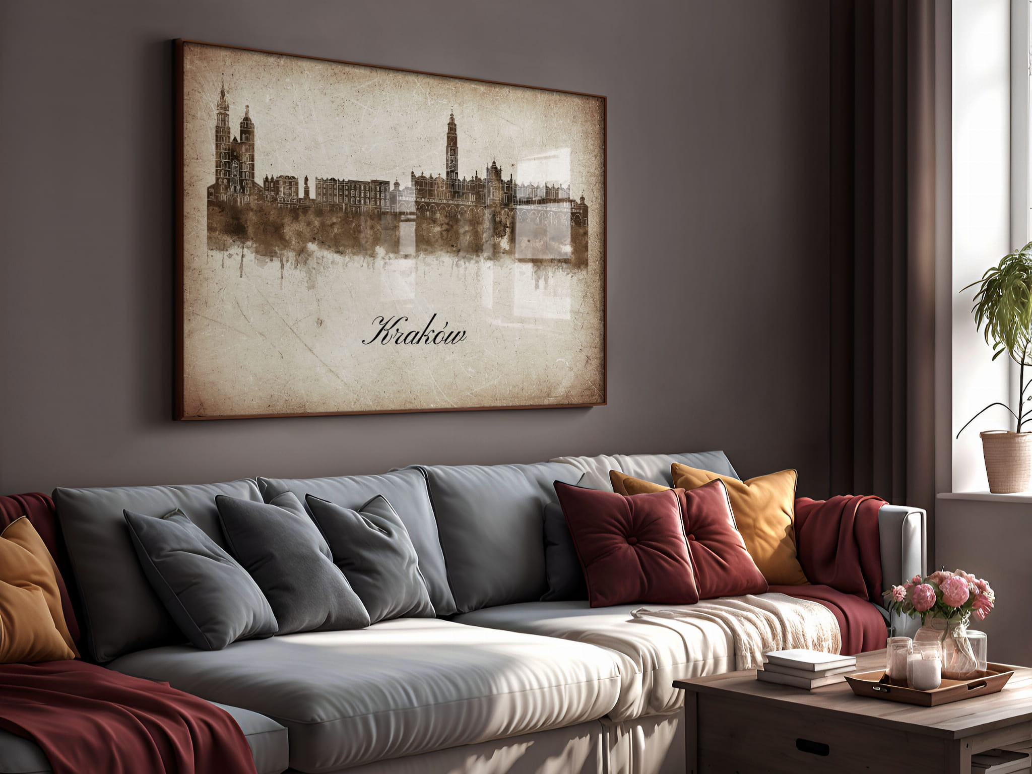 Plakaty skyline w stylu vintage to nowoczesne dzieła sztuki, które nawiązują do estetyki minionych dekad. Przedstawiają miejskie krajobrazy w retro kolorystyce, z wyblakłymi barwami i z delikatną patyną czasu. Kontury są często zmiękczone, a szczegóły budynków lekko stylizowane, co dodaje im nostalgicznego uroku. Tła plakatów utrzymane są w odcieniach przypominających stary papier, z subtelnymi teksturami i ciepłymi, przygaszonymi tonami. Całość tworzy elegancki i przytulny klimat, idealny do wnętrz, które łączą nowoczesność z klasycznym wdziękiem.