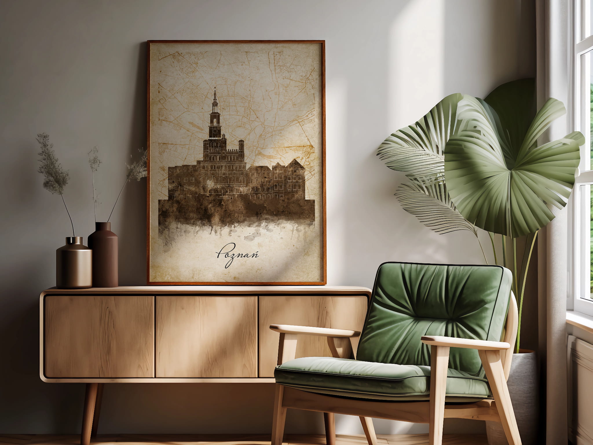 Plakaty skyline w stylu vintage to nowoczesne dzieła sztuki, które nawiązują do estetyki minionych dekad. Przedstawiają miejskie krajobrazy w retro kolorystyce, z wyblakłymi barwami i z delikatną patyną czasu. Kontury są często zmiękczone, a szczegóły budynków lekko stylizowane, co dodaje im nostalgicznego uroku. Tła plakatów utrzymane są w odcieniach przypominających stary papier, z subtelnymi teksturami i ciepłymi, przygaszonymi tonami. Całość tworzy elegancki i przytulny klimat, idealny do wnętrz, które łączą nowoczesność z klasycznym wdziękiem.