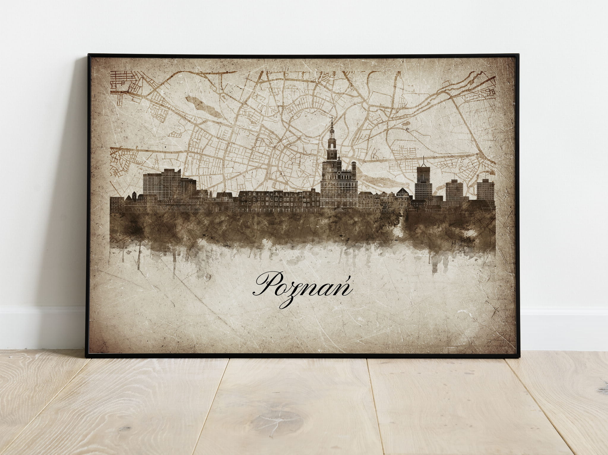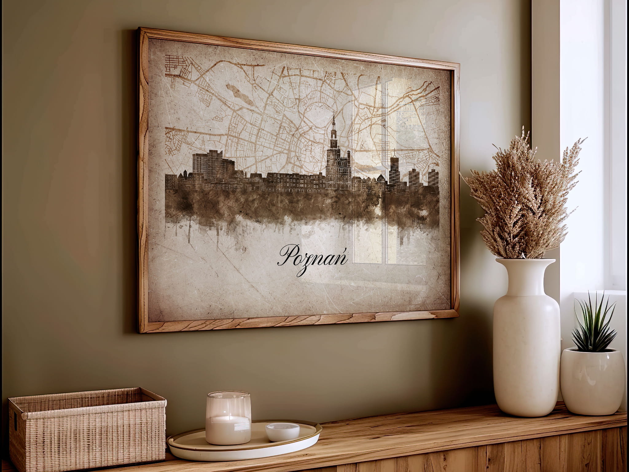 Plakaty skyline w stylu vintage to nowoczesne dzieła sztuki, które nawiązują do estetyki minionych dekad. Przedstawiają miejskie krajobrazy w retro kolorystyce, z wyblakłymi barwami i z delikatną patyną czasu. Kontury są często zmiękczone, a szczegóły budynków lekko stylizowane, co dodaje im nostalgicznego uroku. Tła plakatów utrzymane są w odcieniach przypominających stary papier, z subtelnymi teksturami i ciepłymi, przygaszonymi tonami. Całość tworzy elegancki i przytulny klimat, idealny do wnętrz, które łączą nowoczesność z klasycznym wdziękiem.