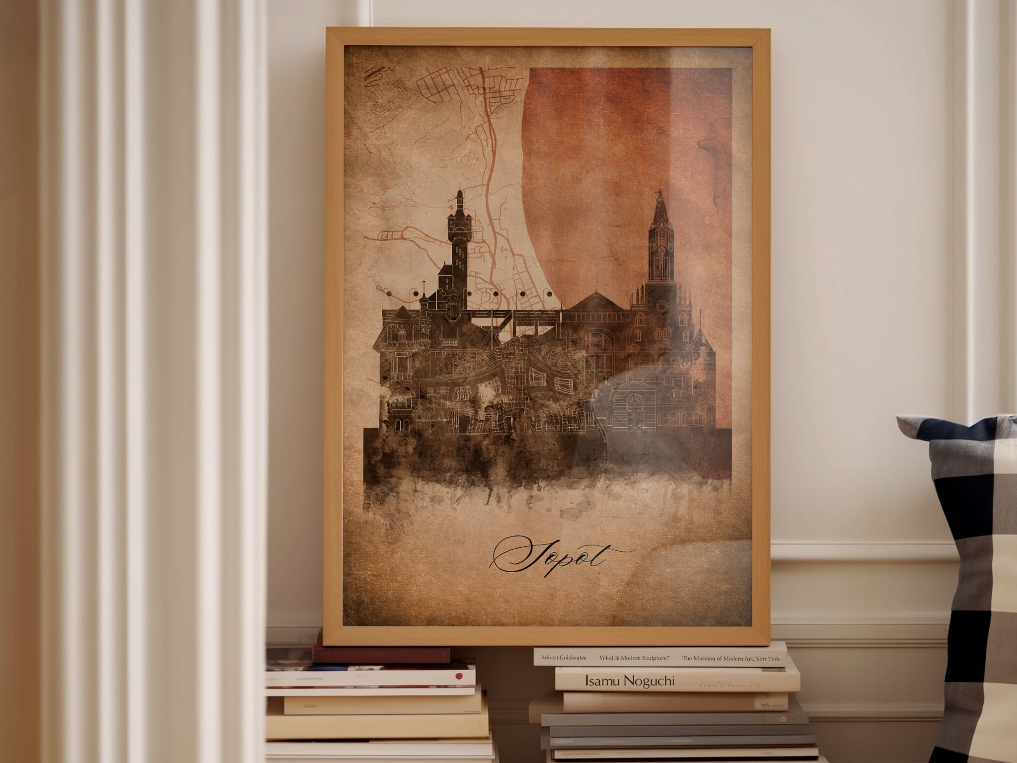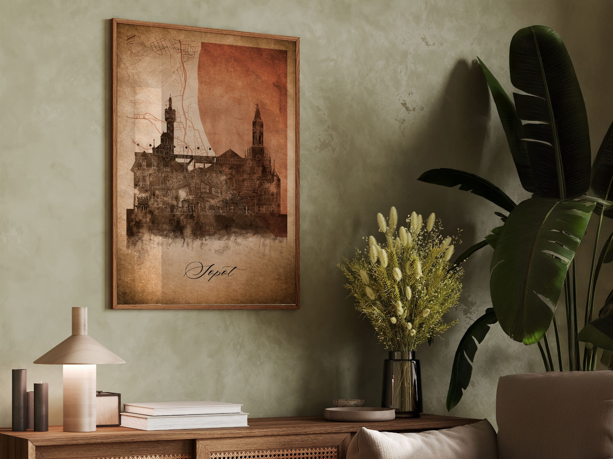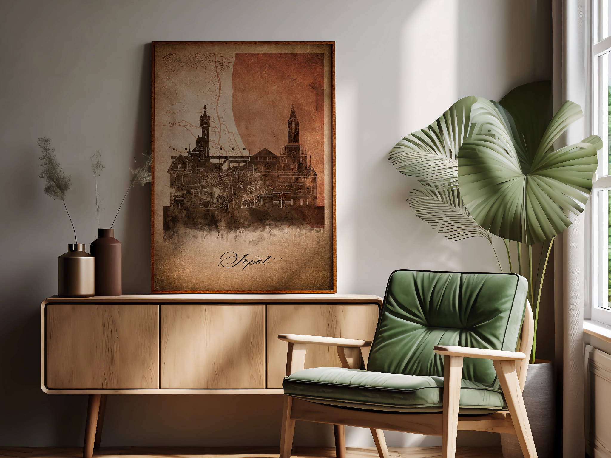 Plakaty skyline w stylu vintage to nowoczesne dzieła sztuki, które nawiązują do estetyki minionych dekad. Przedstawiają miejskie krajobrazy w retro kolorystyce, z wyblakłymi barwami i z delikatną patyną czasu. Kontury są często zmiękczone, a szczegóły budynków lekko stylizowane, co dodaje im nostalgicznego uroku. Tła plakatów utrzymane są w odcieniach przypominających stary papier, z subtelnymi teksturami i ciepłymi, przygaszonymi tonami. Całość tworzy elegancki i przytulny klimat, idealny do wnętrz, które łączą nowoczesność z klasycznym wdziękiem.