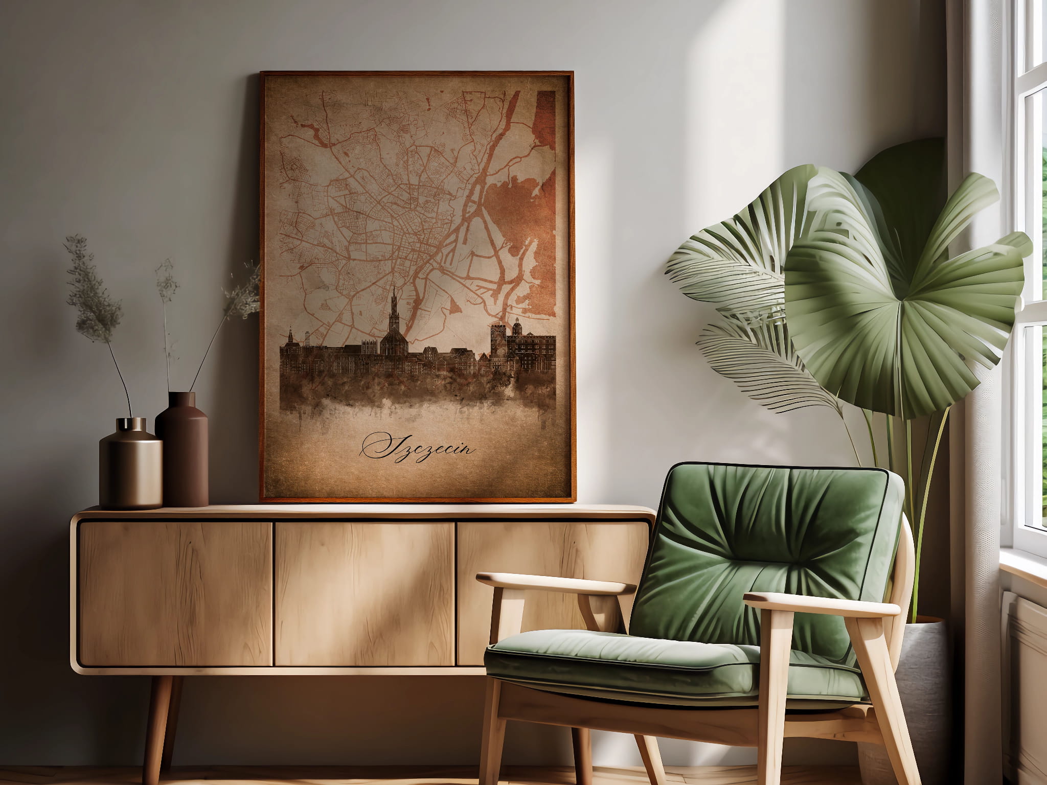 Plakaty skyline w stylu vintage to nowoczesne dzieła sztuki, które nawiązują do estetyki minionych dekad. Przedstawiają miejskie krajobrazy w retro kolorystyce, z wyblakłymi barwami i z delikatną patyną czasu. Kontury są często zmiękczone, a szczegóły budynków lekko stylizowane, co dodaje im nostalgicznego uroku. Tła plakatów utrzymane są w odcieniach przypominających stary papier, z subtelnymi teksturami i ciepłymi, przygaszonymi tonami. Całość tworzy elegancki i przytulny klimat, idealny do wnętrz, które łączą nowoczesność z klasycznym wdziękiem.