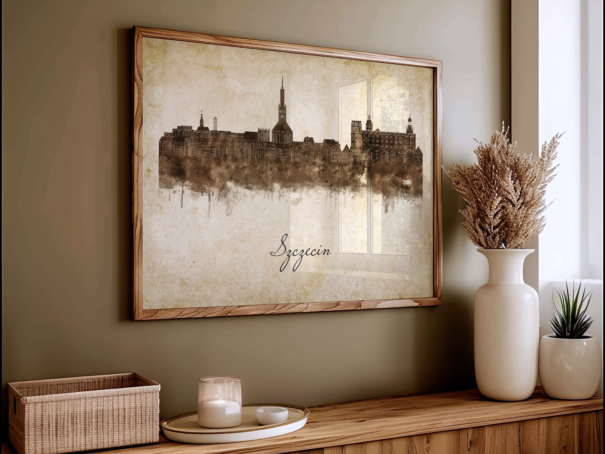 Plakaty skyline w stylu vintage to nowoczesne dzieła sztuki, które nawiązują do estetyki minionych dekad. Przedstawiają miejskie krajobrazy w retro kolorystyce, z wyblakłymi barwami i z delikatną patyną czasu. Kontury są często zmiękczone, a szczegóły budynków lekko stylizowane, co dodaje im nostalgicznego uroku. Tła plakatów utrzymane są w odcieniach przypominających stary papier, z subtelnymi teksturami i ciepłymi, przygaszonymi tonami. Całość tworzy elegancki i przytulny klimat, idealny do wnętrz, które łączą nowoczesność z klasycznym wdziękiem.