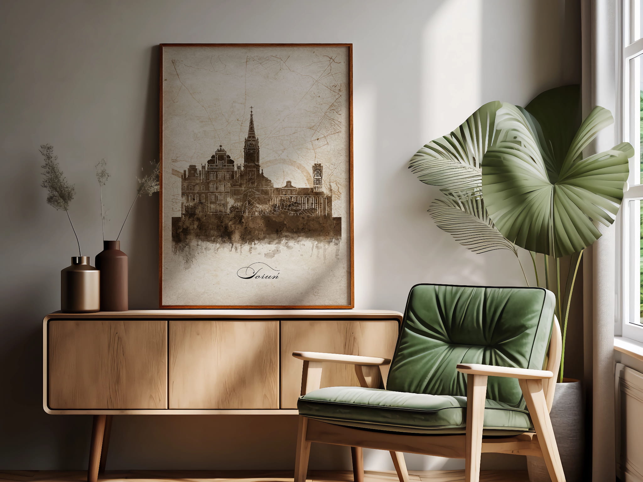 Plakaty skyline w stylu vintage to nowoczesne dzieła sztuki, które nawiązują do estetyki minionych dekad. Przedstawiają miejskie krajobrazy w retro kolorystyce, z wyblakłymi barwami i z delikatną patyną czasu. Kontury są często zmiękczone, a szczegóły budynków lekko stylizowane, co dodaje im nostalgicznego uroku. Tła plakatów utrzymane są w odcieniach przypominających stary papier, z subtelnymi teksturami i ciepłymi, przygaszonymi tonami. Całość tworzy elegancki i przytulny klimat, idealny do wnętrz, które łączą nowoczesność z klasycznym wdziękiem.