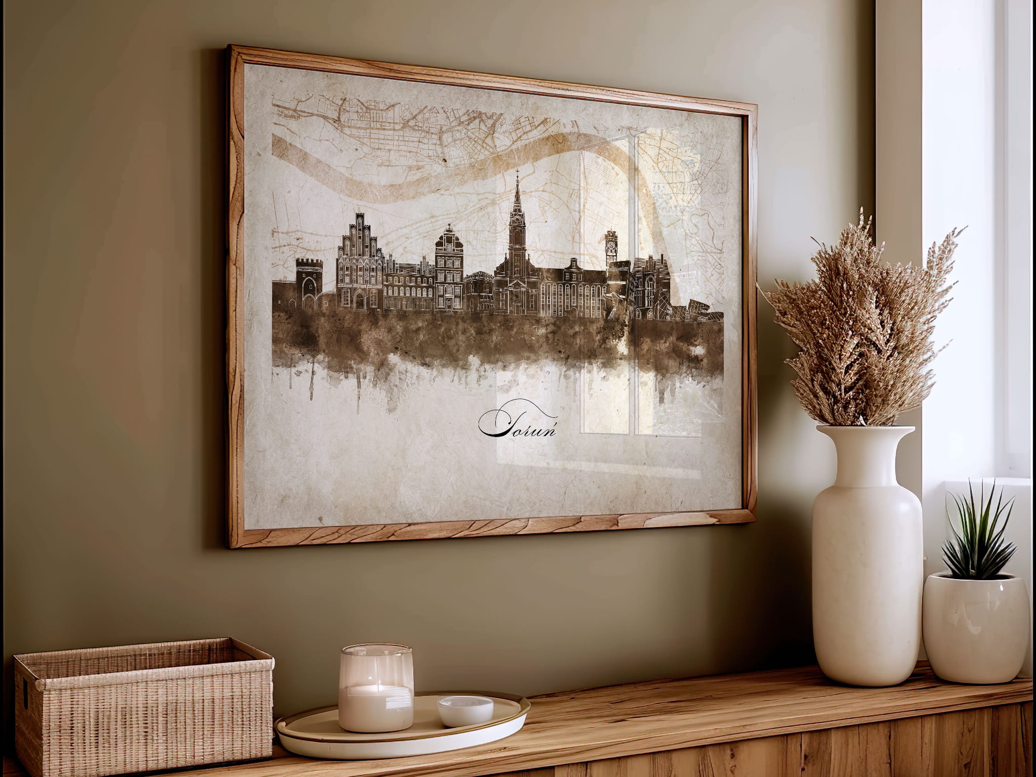 Plakaty skyline w stylu vintage to nowoczesne dzieła sztuki, które nawiązują do estetyki minionych dekad. Przedstawiają miejskie krajobrazy w retro kolorystyce, z wyblakłymi barwami i z delikatną patyną czasu. Kontury są często zmiękczone, a szczegóły budynków lekko stylizowane, co dodaje im nostalgicznego uroku. Tła plakatów utrzymane są w odcieniach przypominających stary papier, z subtelnymi teksturami i ciepłymi, przygaszonymi tonami. Całość tworzy elegancki i przytulny klimat, idealny do wnętrz, które łączą nowoczesność z klasycznym wdziękiem.