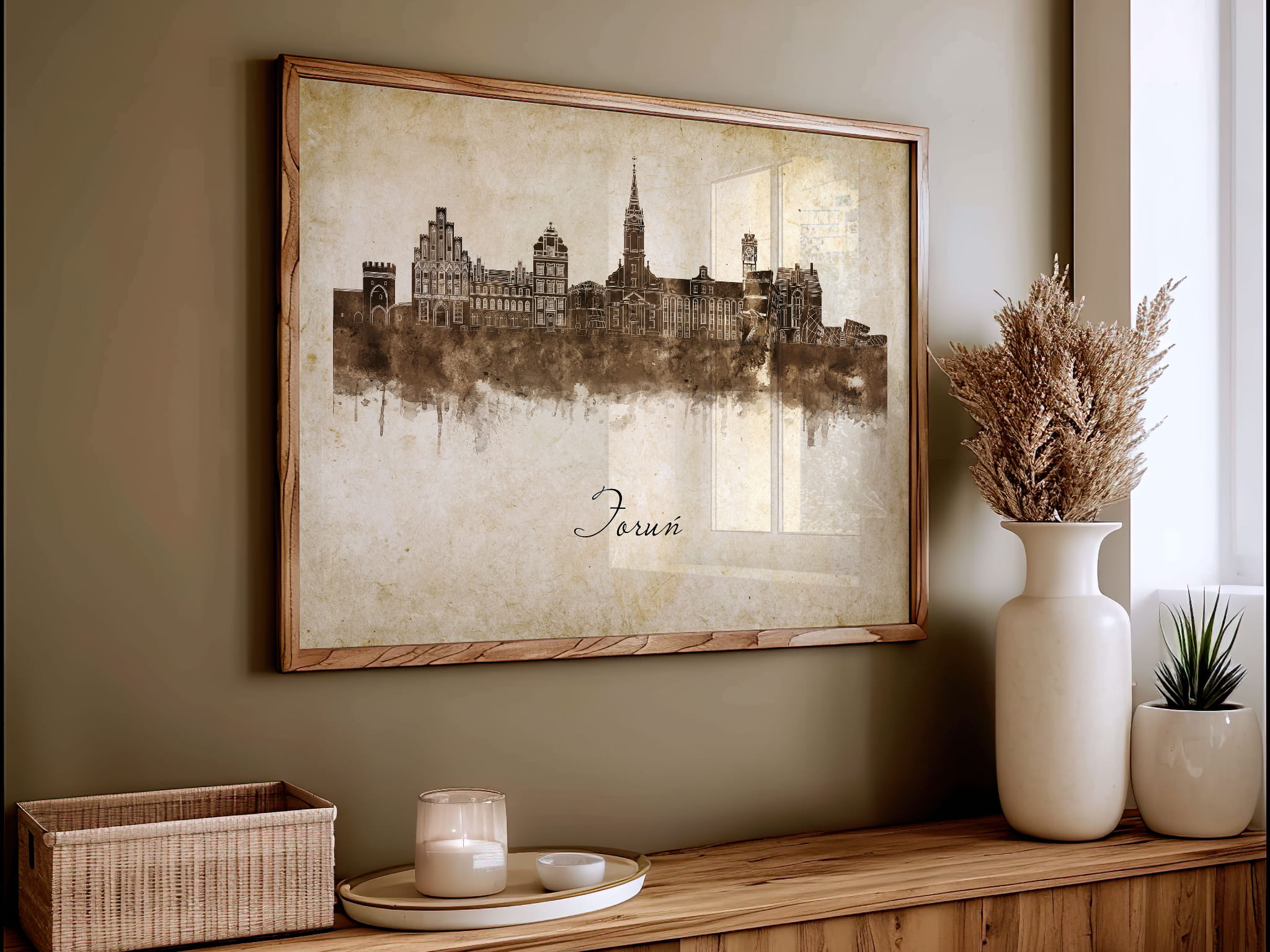 Plakaty skyline w stylu vintage to nowoczesne dzieła sztuki, które nawiązują do estetyki minionych dekad. Przedstawiają miejskie krajobrazy w retro kolorystyce, z wyblakłymi barwami i z delikatną patyną czasu. Kontury są często zmiękczone, a szczegóły budynków lekko stylizowane, co dodaje im nostalgicznego uroku. Tła plakatów utrzymane są w odcieniach przypominających stary papier, z subtelnymi teksturami i ciepłymi, przygaszonymi tonami. Całość tworzy elegancki i przytulny klimat, idealny do wnętrz, które łączą nowoczesność z klasycznym wdziękiem.