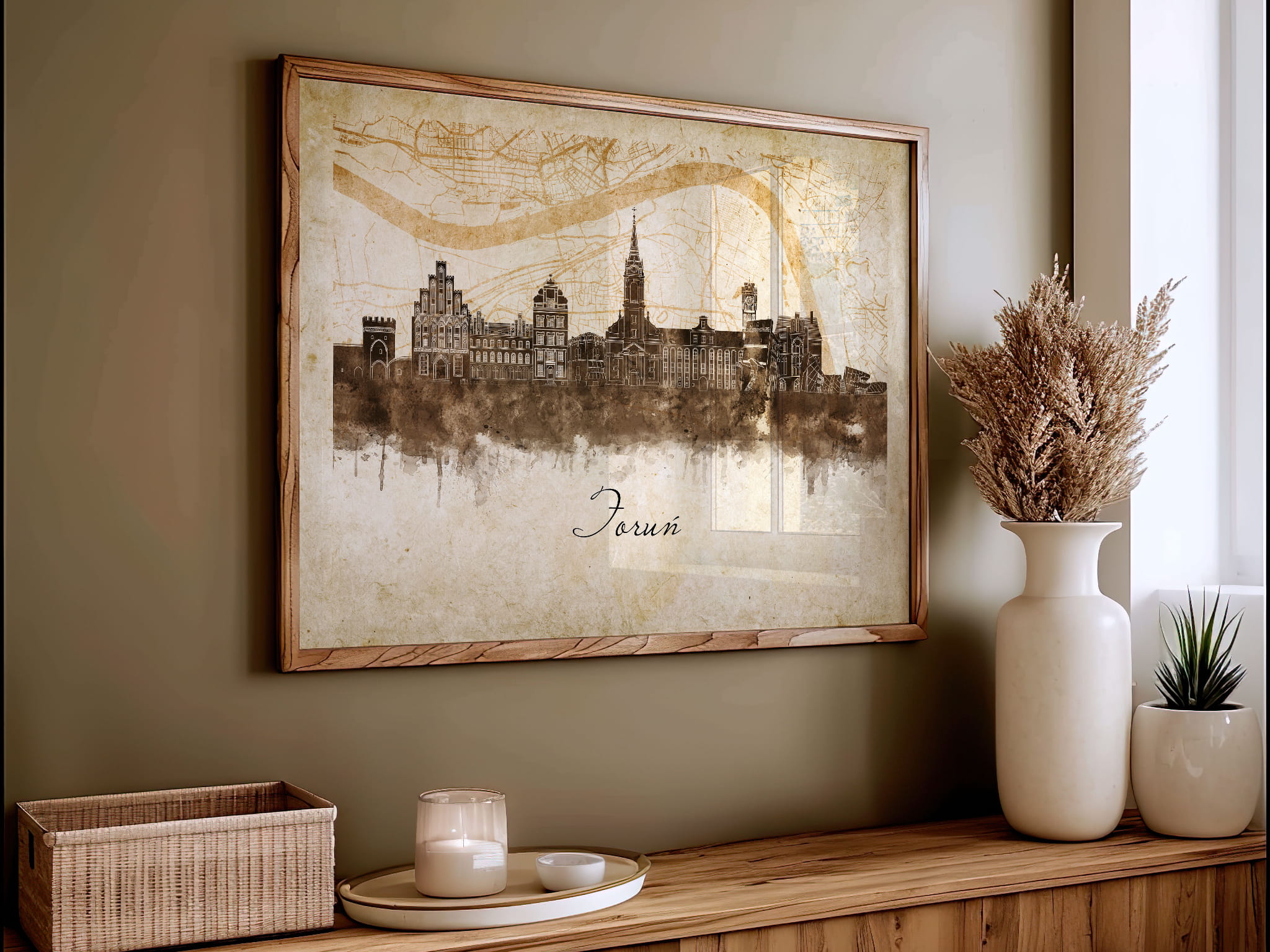 Plakaty skyline w stylu vintage to nowoczesne dzieła sztuki, które nawiązują do estetyki minionych dekad. Przedstawiają miejskie krajobrazy w retro kolorystyce, z wyblakłymi barwami i z delikatną patyną czasu. Kontury są często zmiękczone, a szczegóły budynków lekko stylizowane, co dodaje im nostalgicznego uroku. Tła plakatów utrzymane są w odcieniach przypominających stary papier, z subtelnymi teksturami i ciepłymi, przygaszonymi tonami. Całość tworzy elegancki i przytulny klimat, idealny do wnętrz, które łączą nowoczesność z klasycznym wdziękiem.