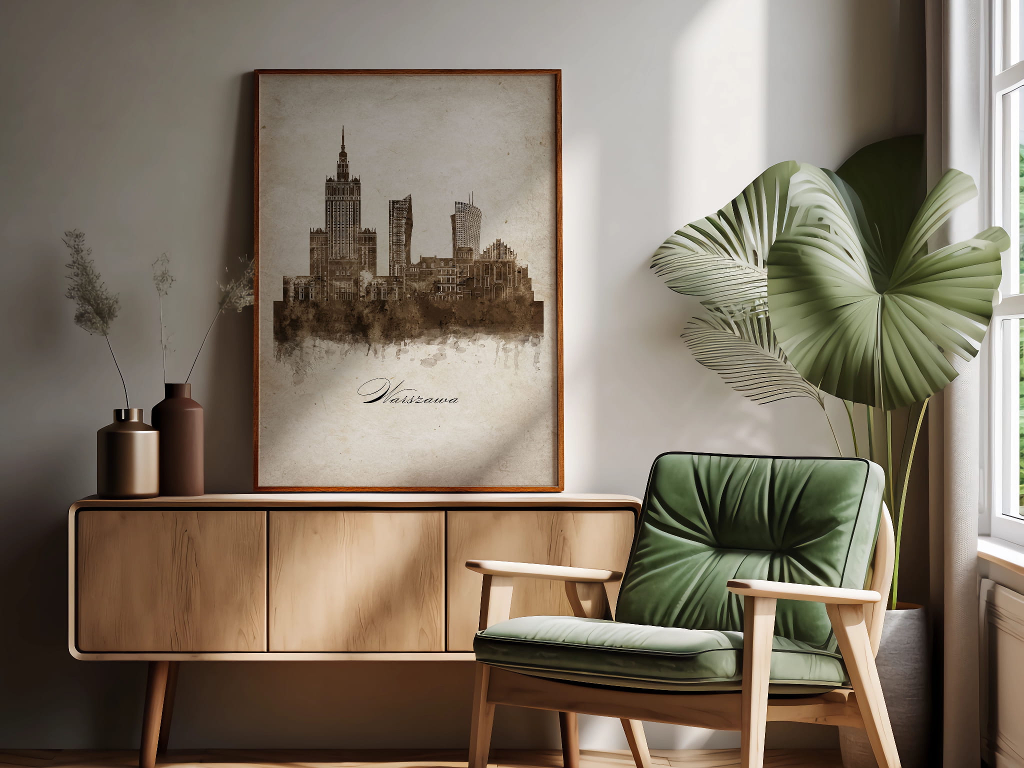 Plakaty skyline w stylu vintage to nowoczesne dzieła sztuki, które nawiązują do estetyki minionych dekad. Przedstawiają miejskie krajobrazy w retro kolorystyce, z wyblakłymi barwami i z delikatną patyną czasu. Kontury są często zmiękczone, a szczegóły budynków lekko stylizowane, co dodaje im nostalgicznego uroku. Tła plakatów utrzymane są w odcieniach przypominających stary papier, z subtelnymi teksturami i ciepłymi, przygaszonymi tonami. Całość tworzy elegancki i przytulny klimat, idealny do wnętrz, które łączą nowoczesność z klasycznym wdziękiem.