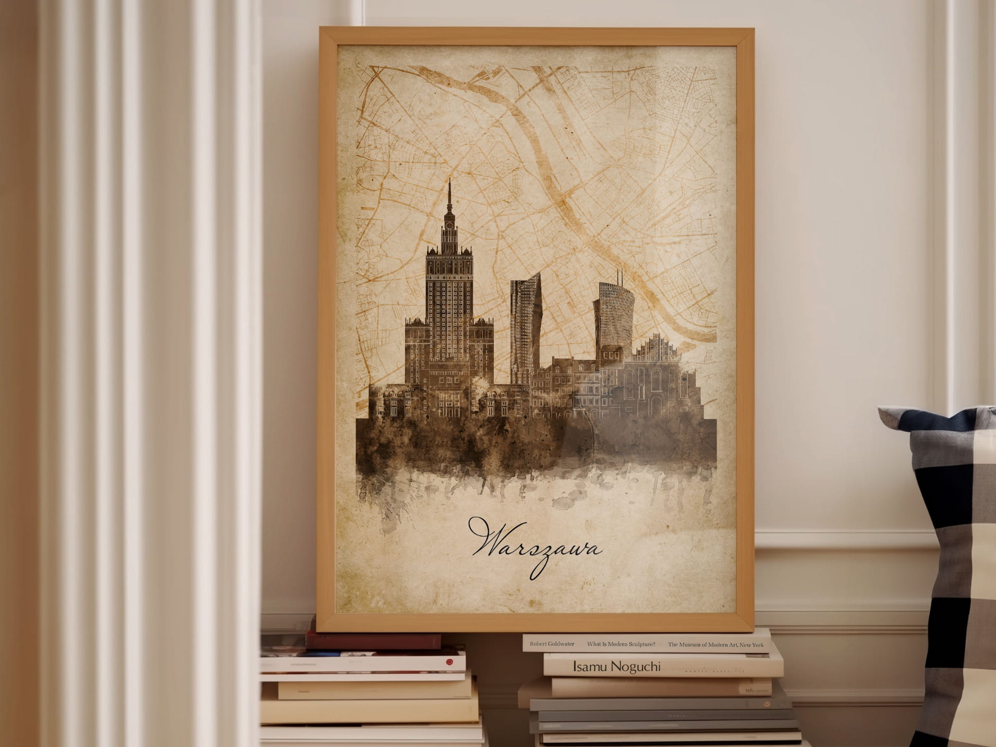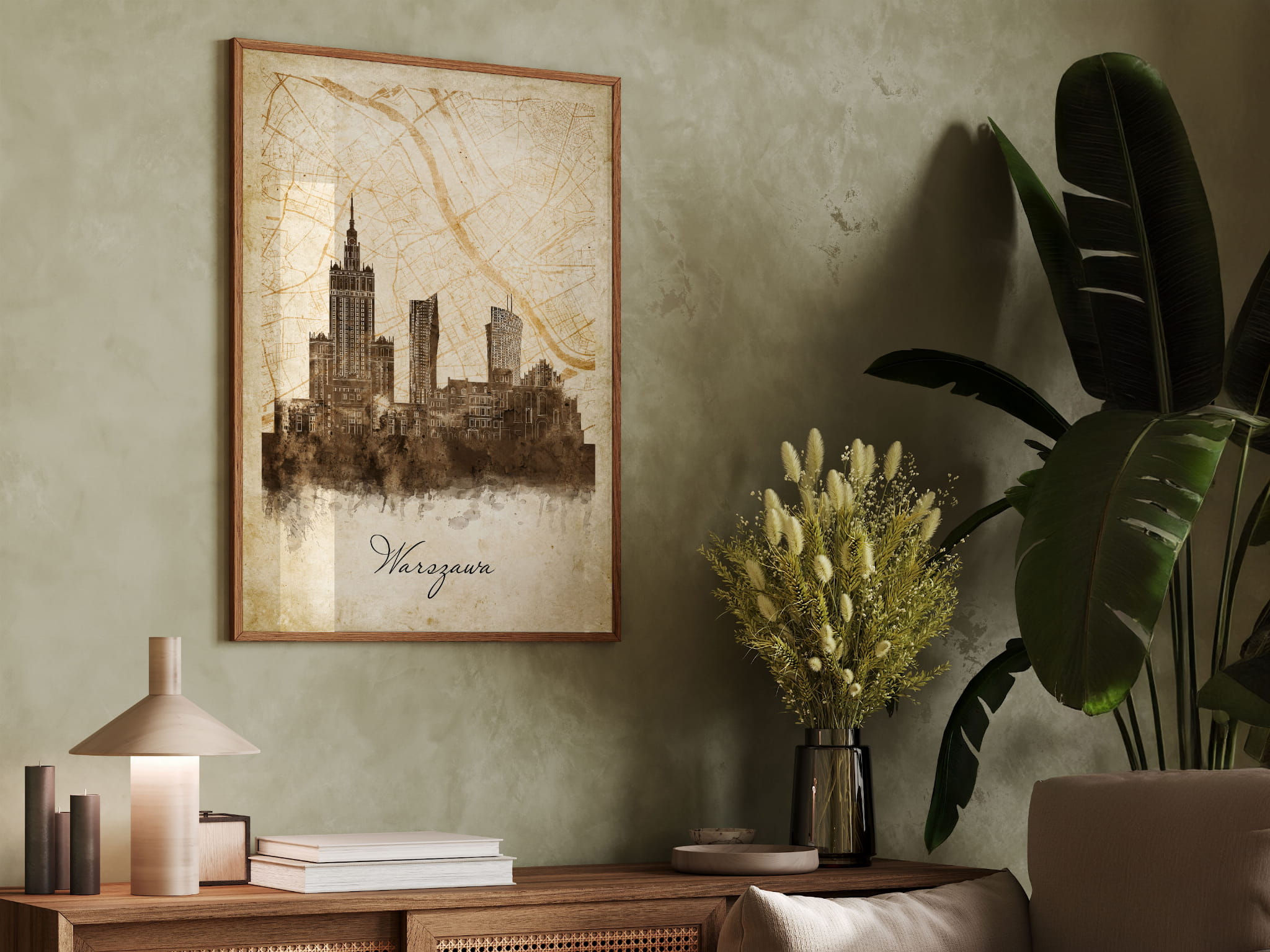 Plakaty skyline w stylu vintage to nowoczesne dzieła sztuki, które nawiązują do estetyki minionych dekad. Przedstawiają miejskie krajobrazy w retro kolorystyce, z wyblakłymi barwami i z delikatną patyną czasu. Kontury są często zmiękczone, a szczegóły budynków lekko stylizowane, co dodaje im nostalgicznego uroku. Tła plakatów utrzymane są w odcieniach przypominających stary papier, z subtelnymi teksturami i ciepłymi, przygaszonymi tonami. Całość tworzy elegancki i przytulny klimat, idealny do wnętrz, które łączą nowoczesność z klasycznym wdziękiem.